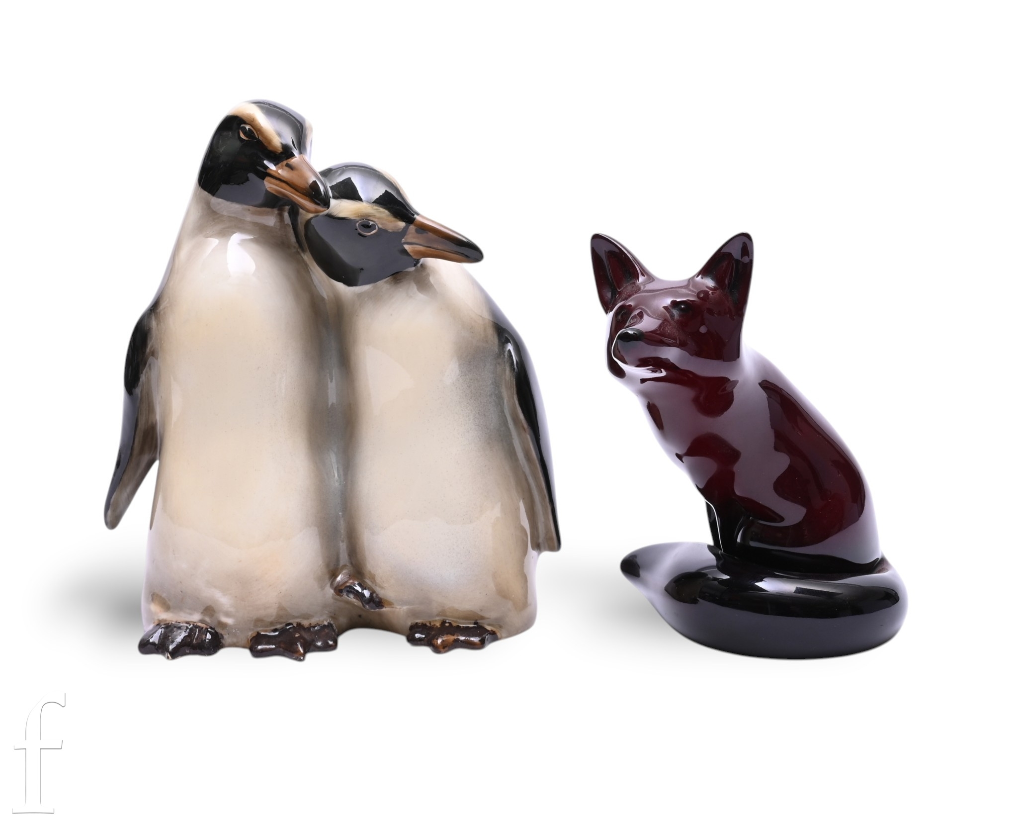 Harry Nixon for Royal Doulton, a model of two standing penguins, HN133, height 15cm, and a flambe figure of a seated fox with coiled tail, height 11cm. (2)