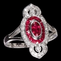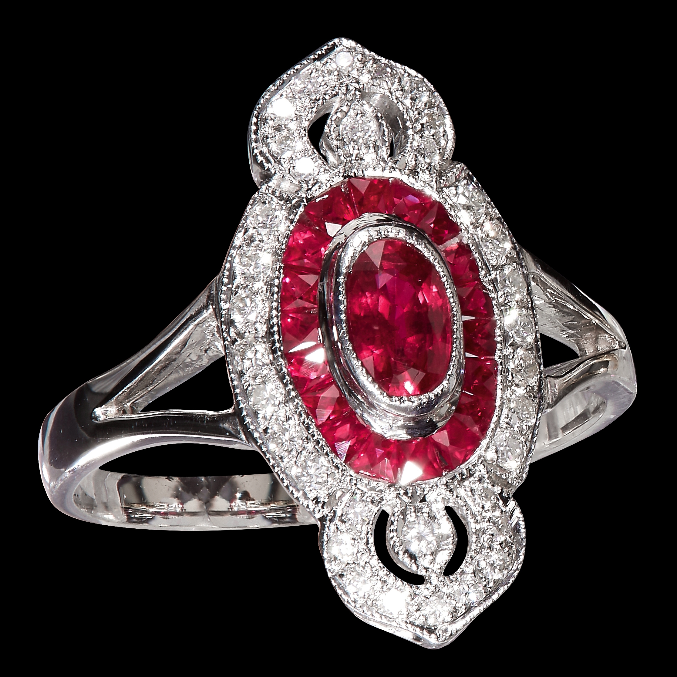 RUBY AND DIAMOND CLUSTER RING. set with vibrant rubies , surrounded by bright lively diamonds. size M 1/2. 3.7 grams.