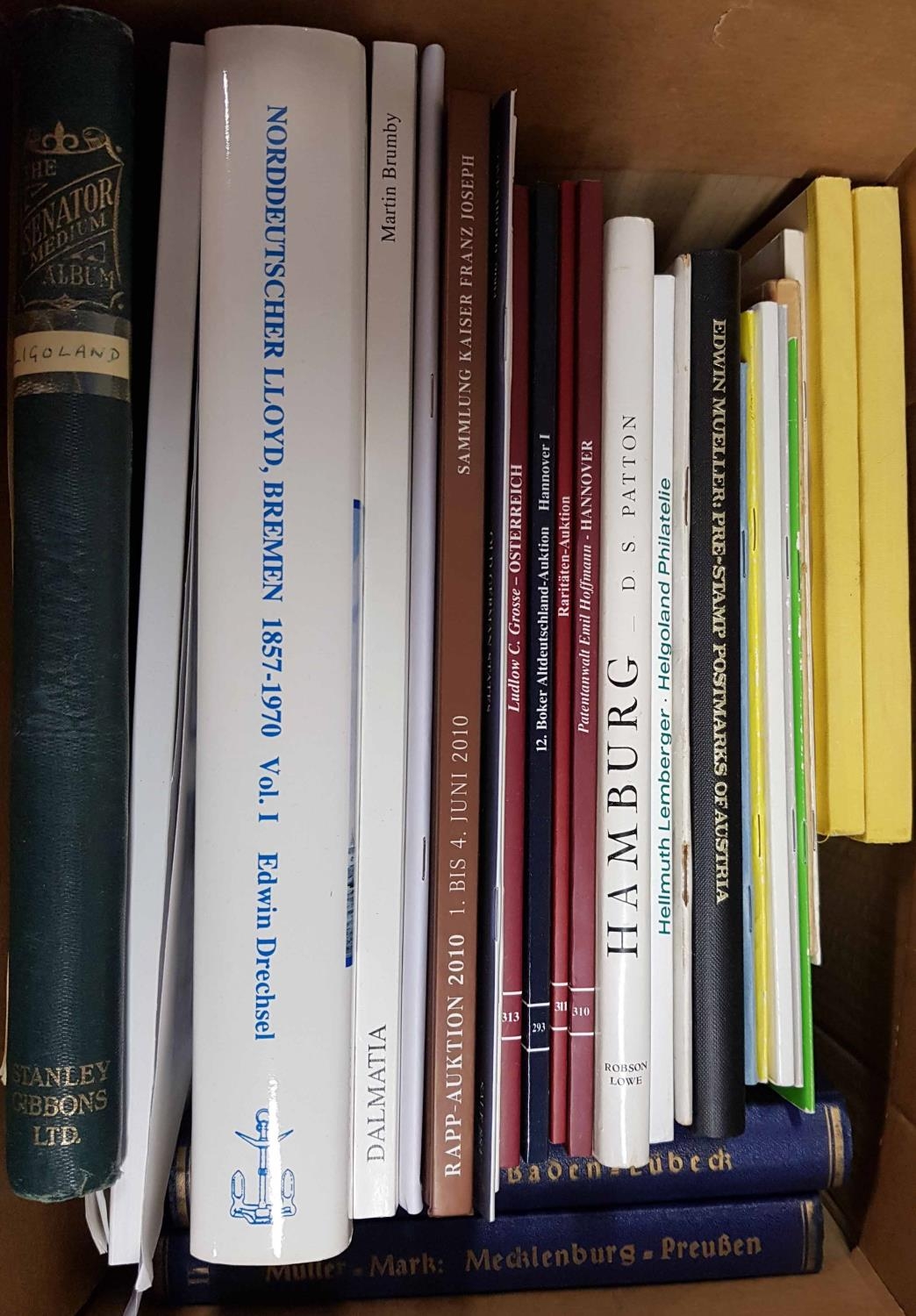 GERMANY/STATES & AUSTRIA: a box of useful literature on cancellations & postal history inc. Altdeutschland Unter der Lupe by M?ller-Mark, Norddeutscher Lloyd Bremen: Vol. 1 1857-1970 History-Fleet-Ship Mails by Drechsel, Thurn und Taxis Ortsaufgabestempel 2 vols. by M?nzberg, Handbook of the Pre-Stamp Postmarks of Austria ed. by Mueller plus a number of handbooks on various states (Dalmatia, Heligoland, Bayern, Hamburg), etc. and several auction catalogues of specialised or named sales. All in good to excellent condition. (30) Cross Reference: AUSTRIA, LITERATURE - PHILATELIC
