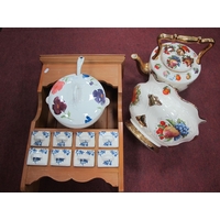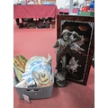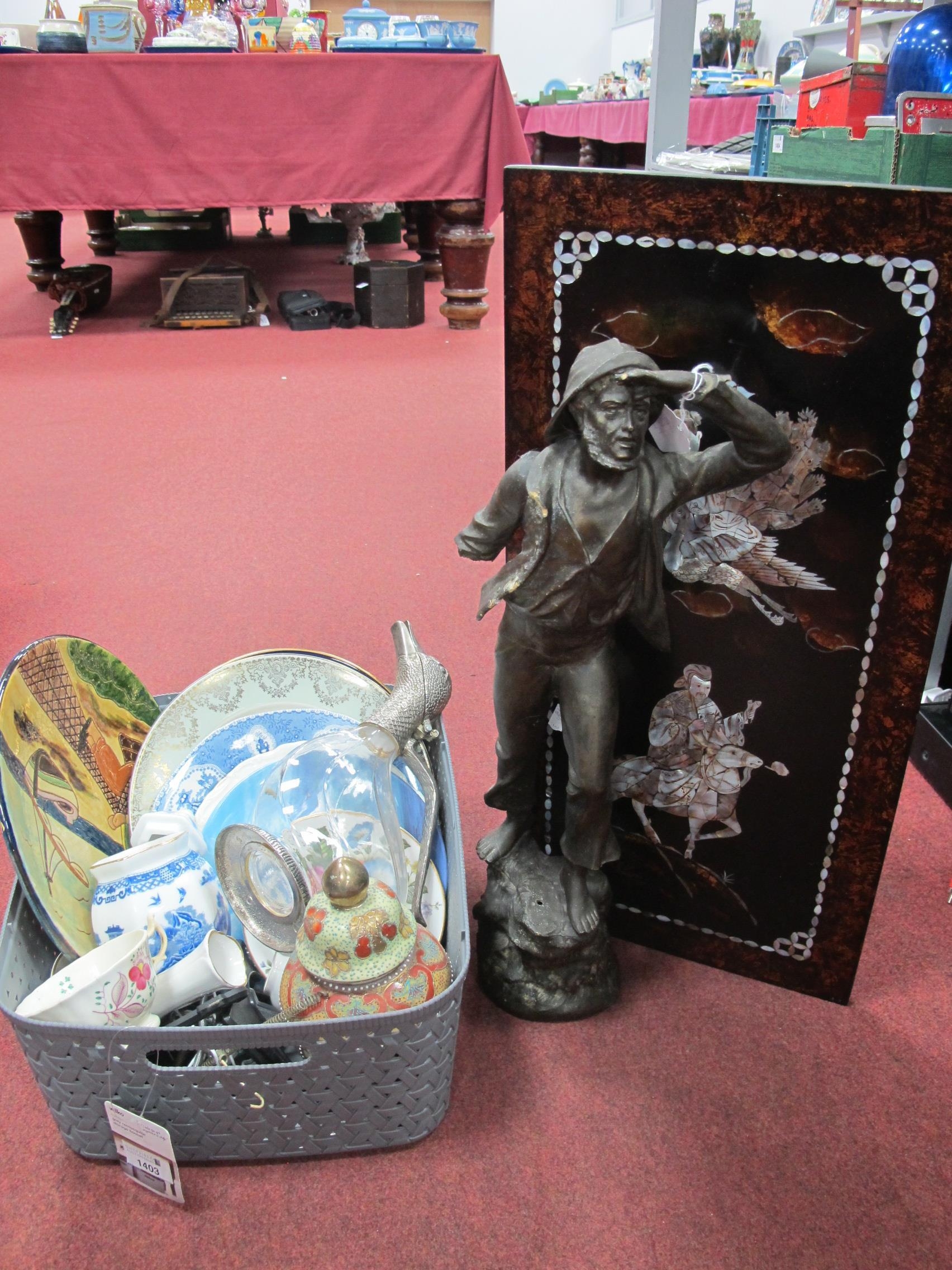 Glass Decanter as a Duck, with white metal head, base, tail and handle, ceramics:- One Box, Mother of Pearl pictorial plaque, spelter fisherman (dam).