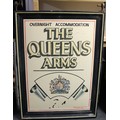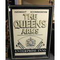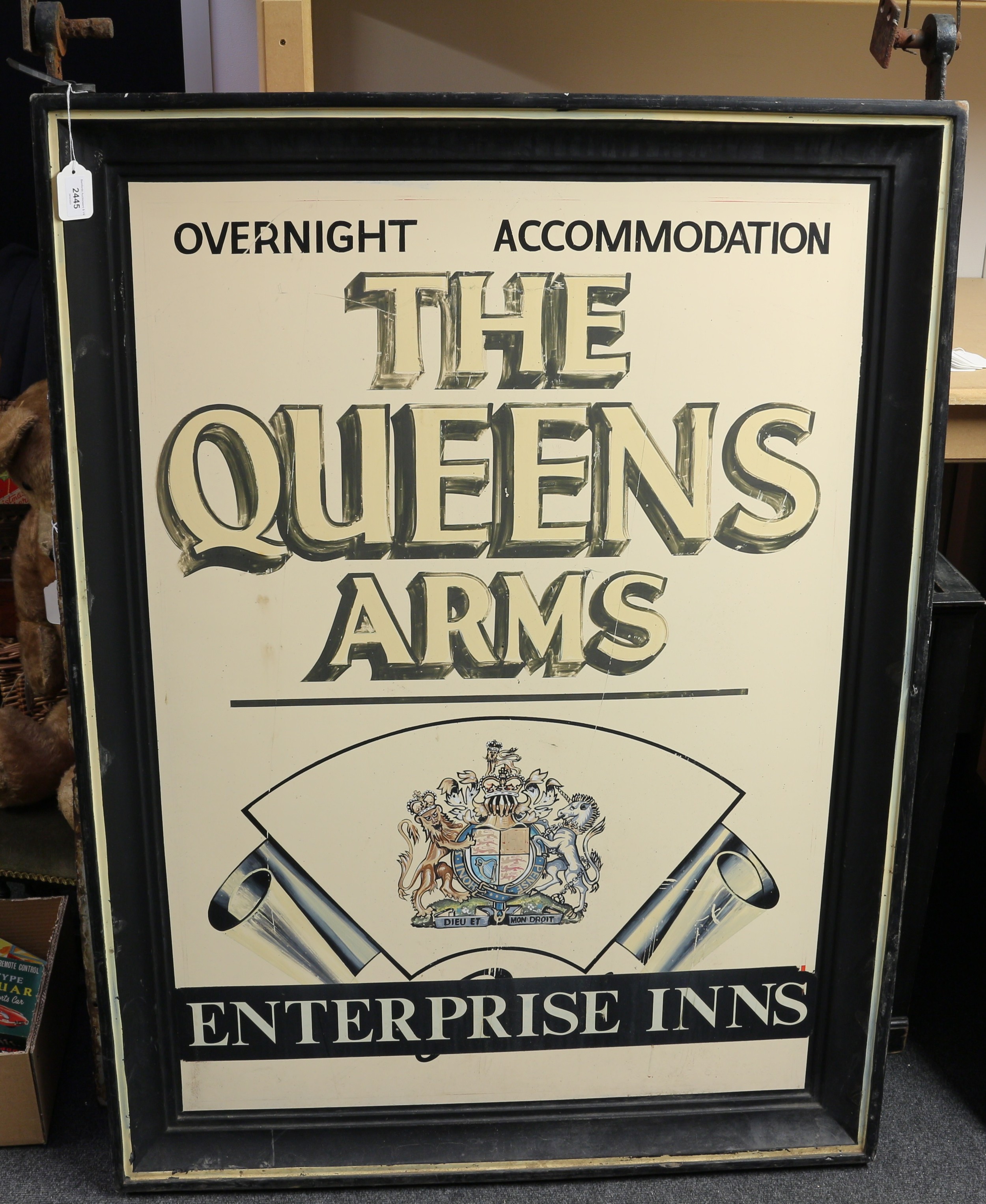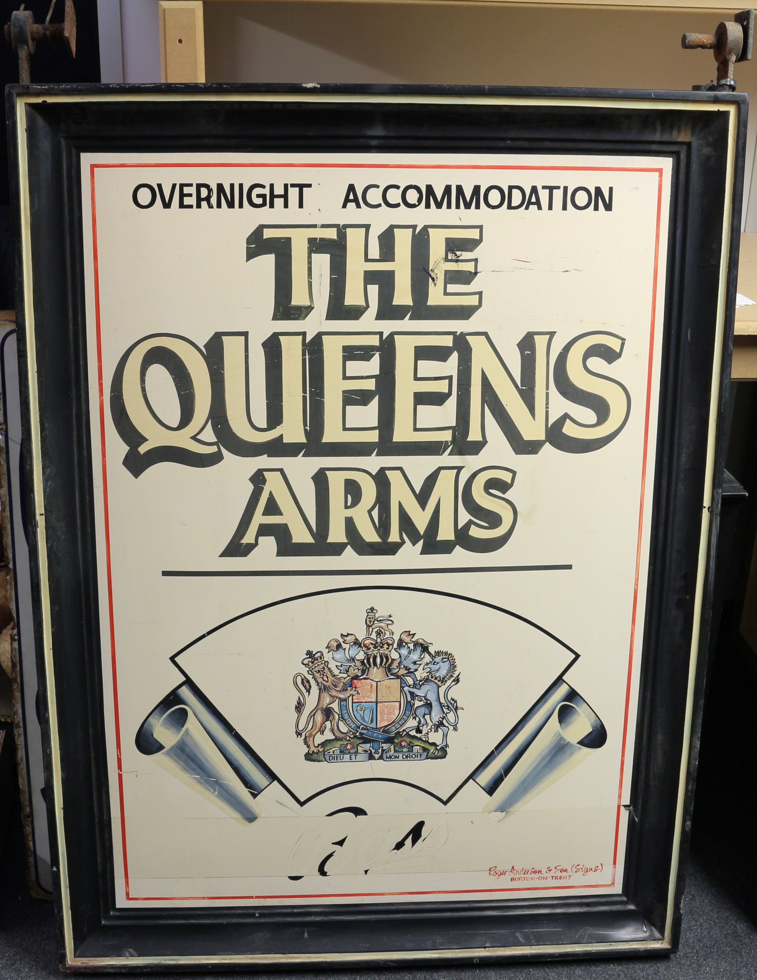 Advertising, Breweriana - a 20th century rectangular shaped public house/inn double sided wooden sign, 'OVERNIGHT ACCOMMODATION, THE QUEENS ARMS, BASS' and 'ENTERPRISE INNS', sign written by Roger Anderson & Son (Signs) Burton-On-Trent, cast iron brackets, 135cm high, 91cm wide, 10cm deep