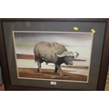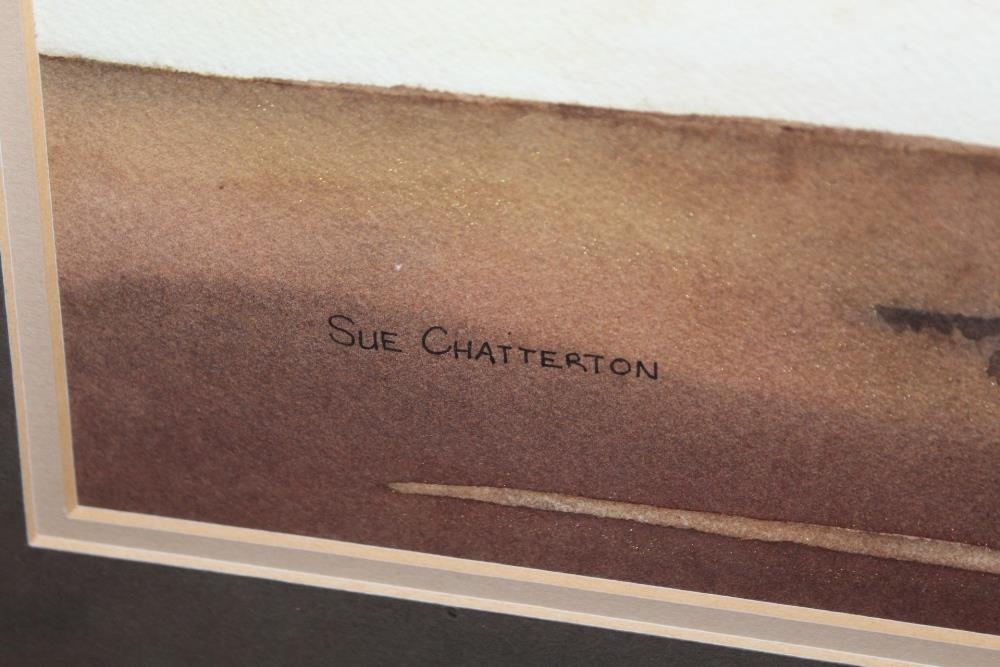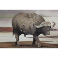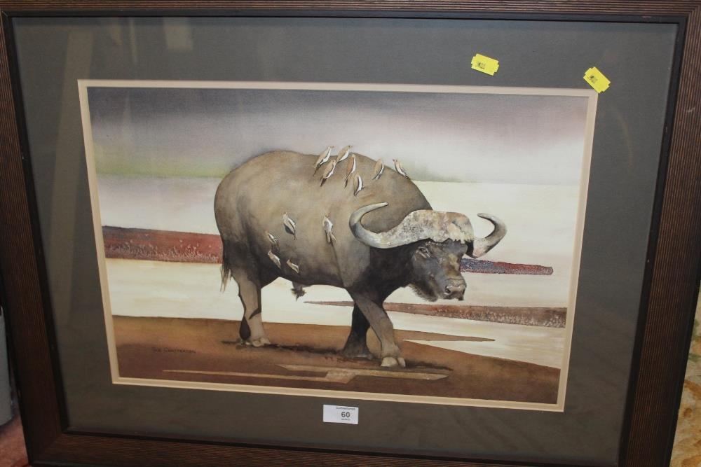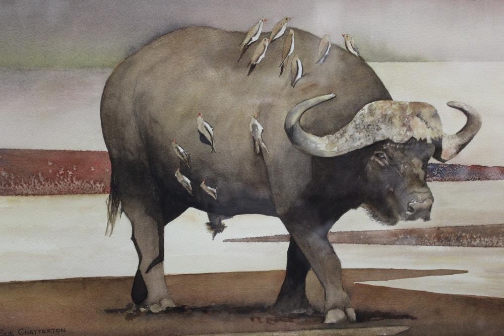 A FRAMED AND GLAZED WATERCOLOUR ENTITLED 'BUFFALO BILL' SIGNED CUE CHATTERTON LOWER RIGHT (SEE VERSO) 33CM X 48CM