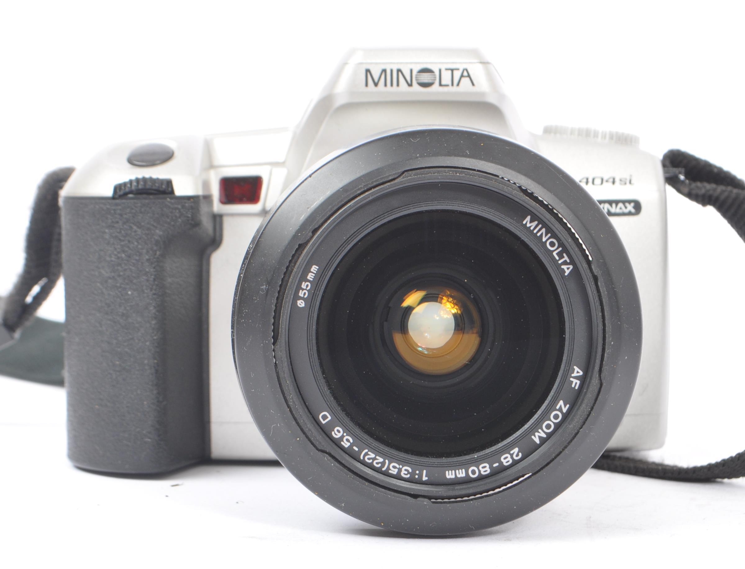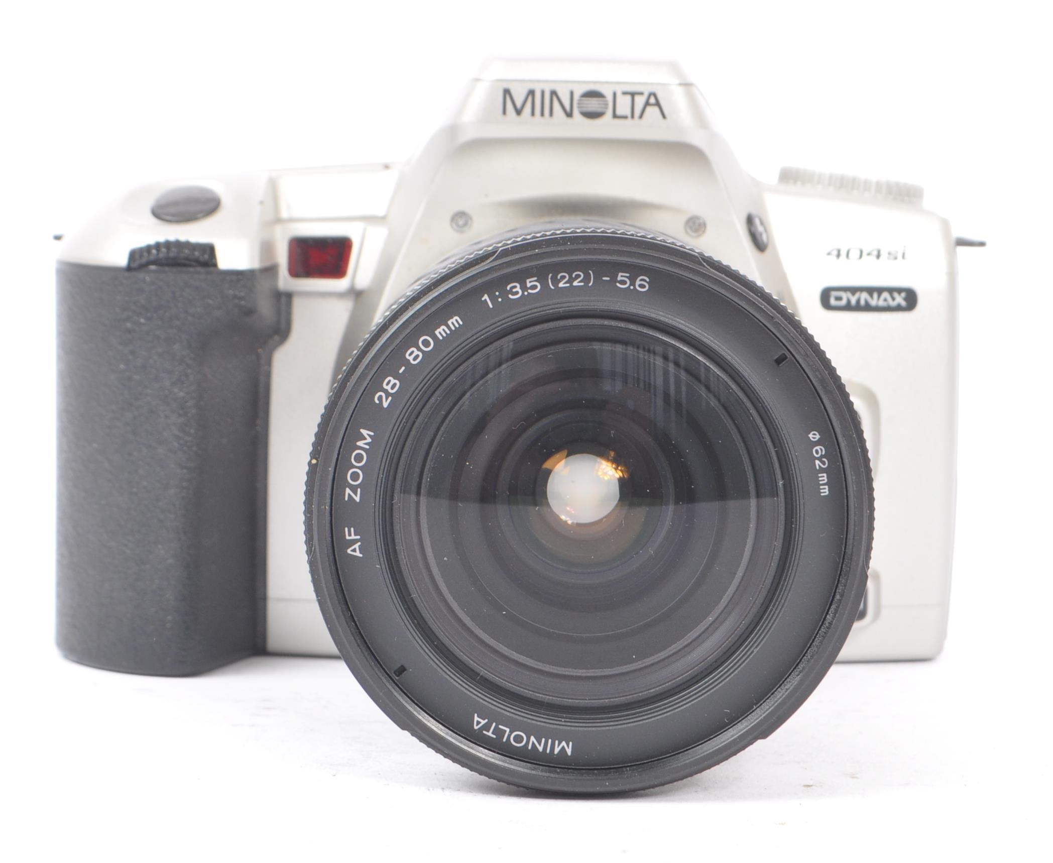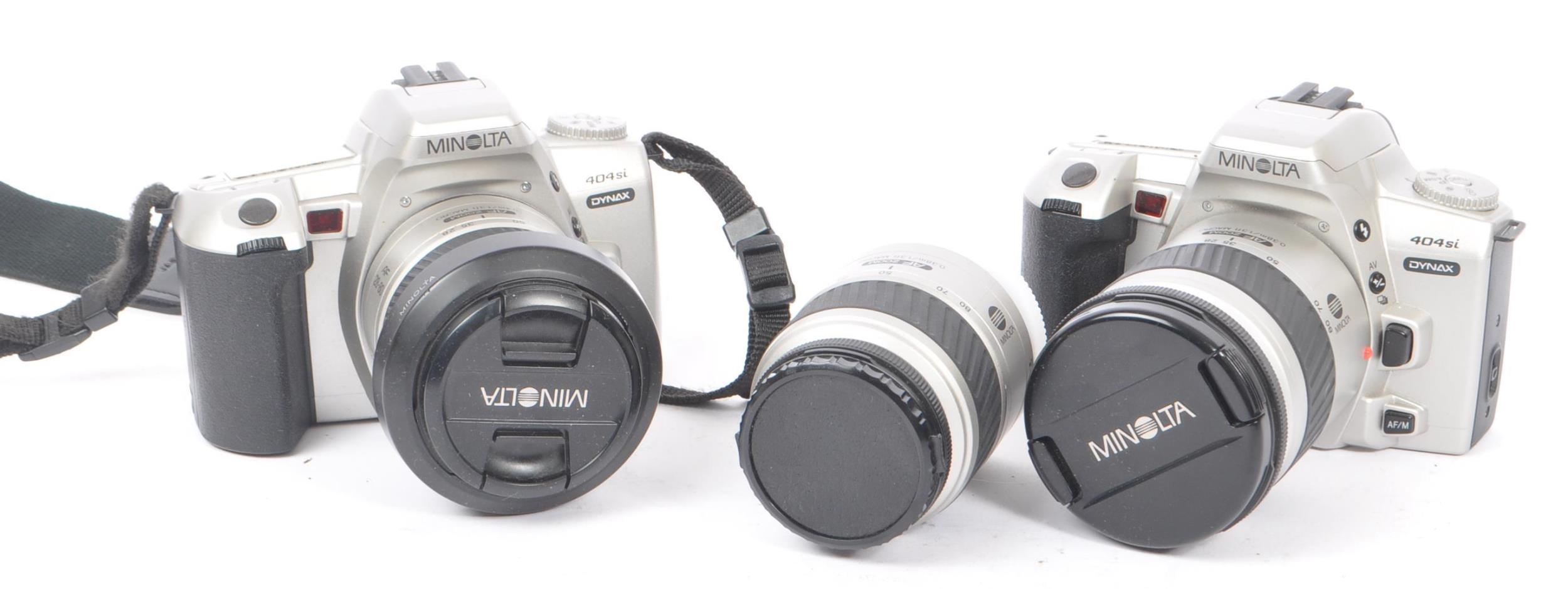 Minolta - Two circa 1999 Minolta Dynax 404si 35mm SLR cameras. The cameras each in silver and black colourway. Each camera with 28-80mm AF Zoom F3.5-5.6 lenses, alongside an additional 35-80mm AF Zoom F4-5.6 lens.