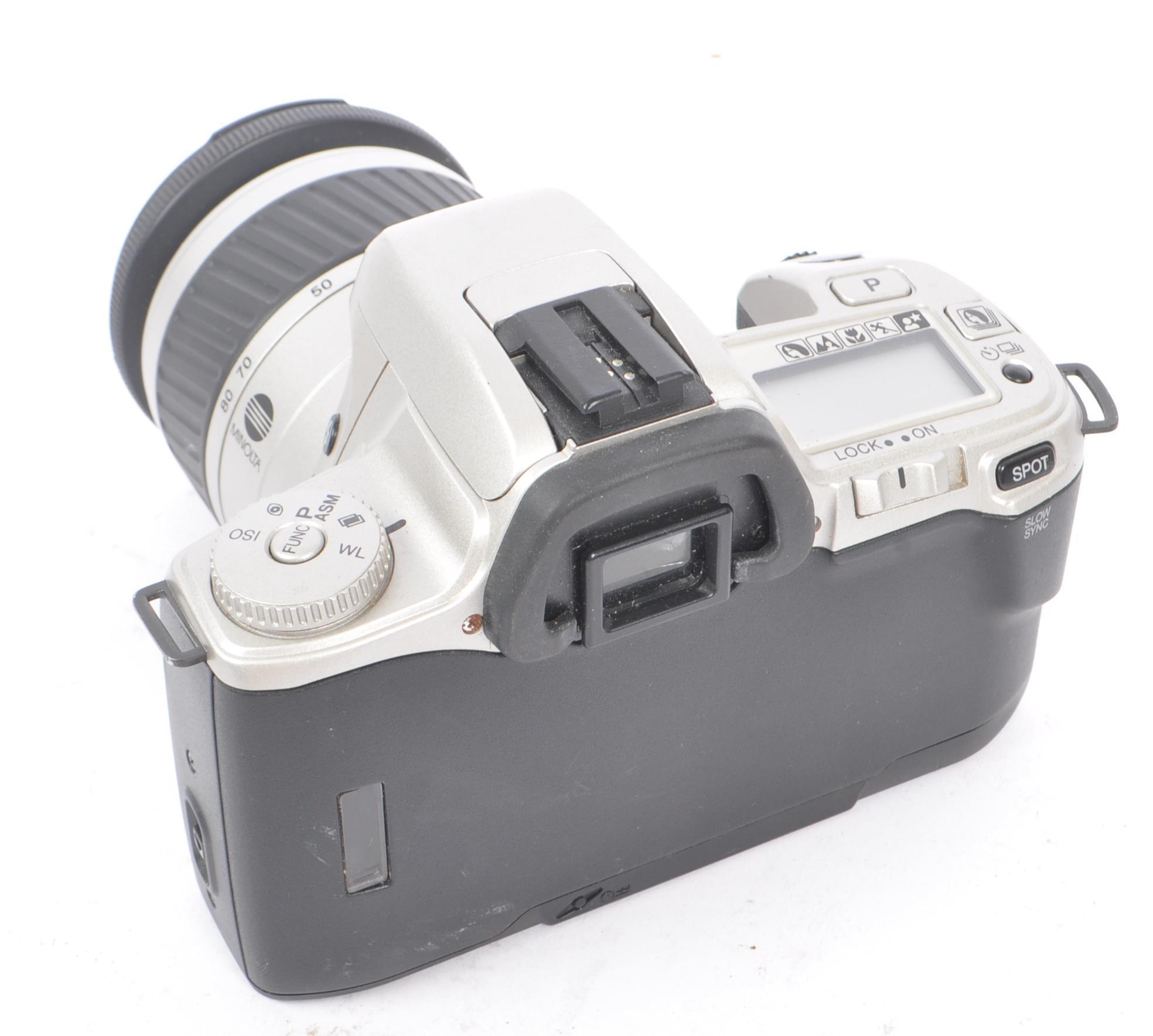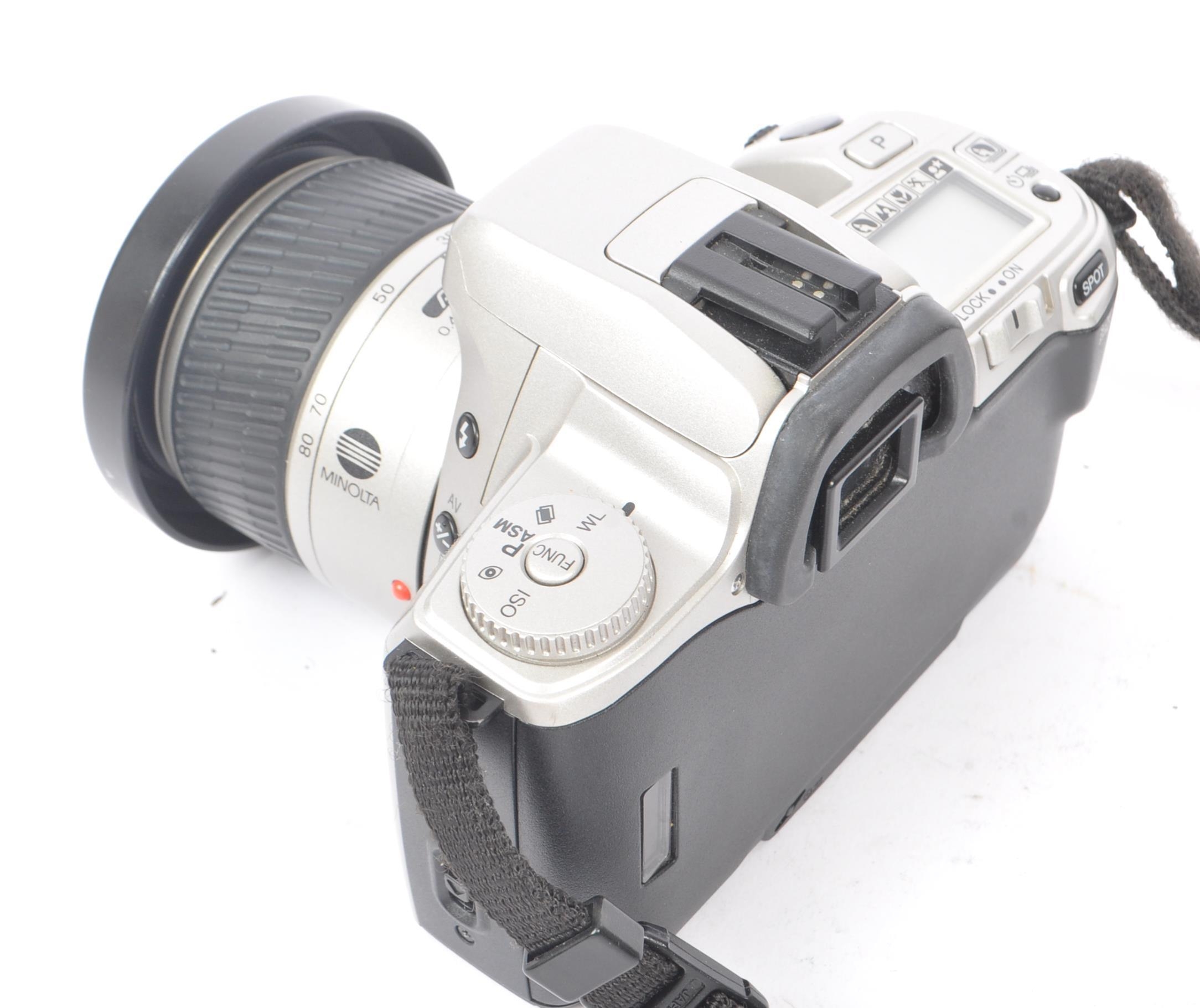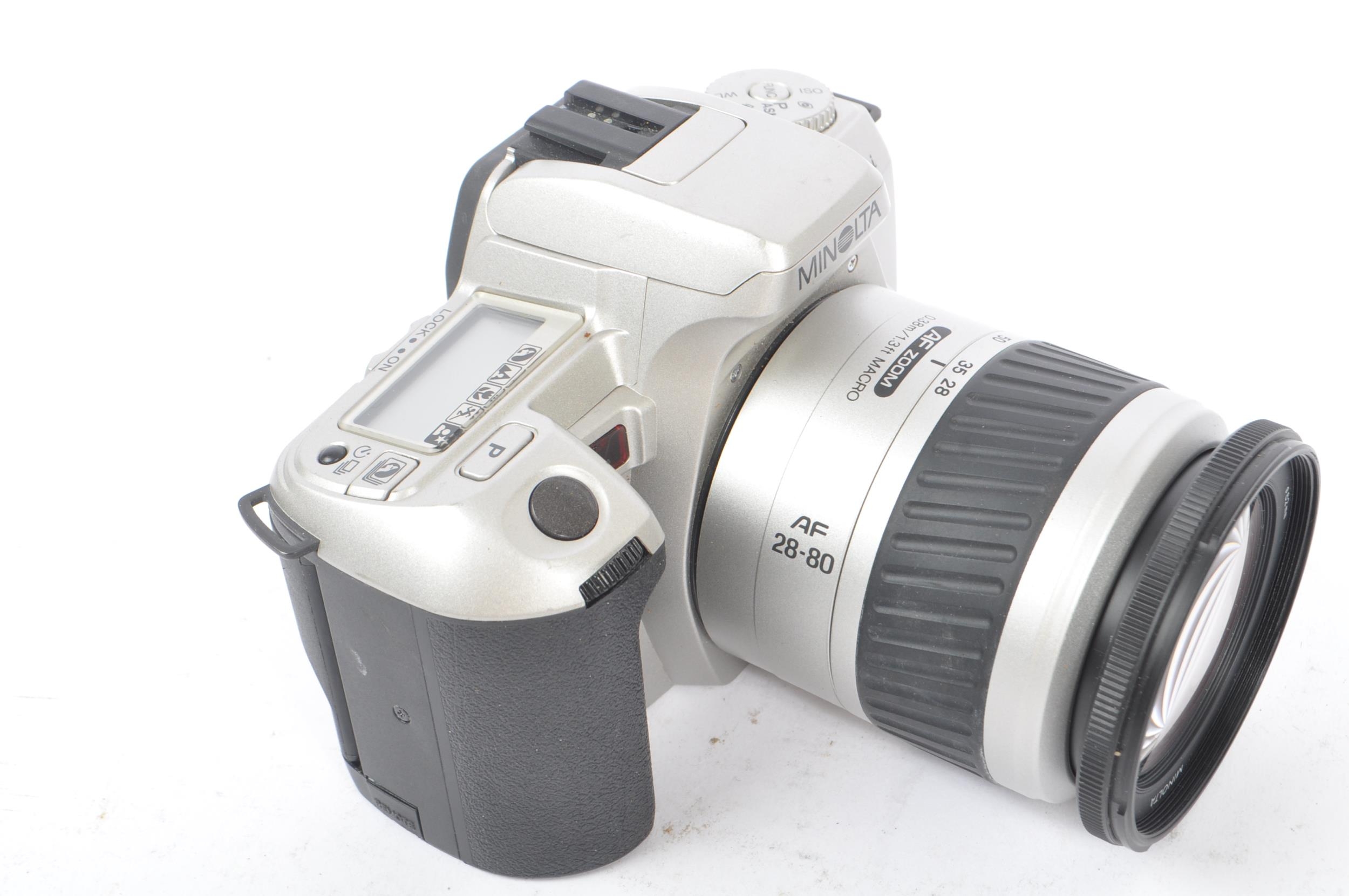 Minolta - Two circa 1999 Minolta Dynax 404si 35mm SLR cameras. The cameras each in silver and black colourway. Each camera with 28-80mm AF Zoom F3.5-5.6 lenses, alongside an additional 35-80mm AF Zoom F4-5.6 lens.