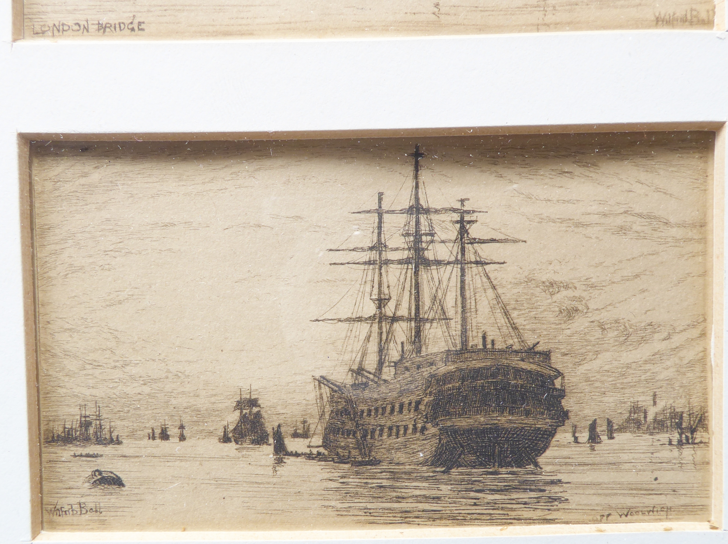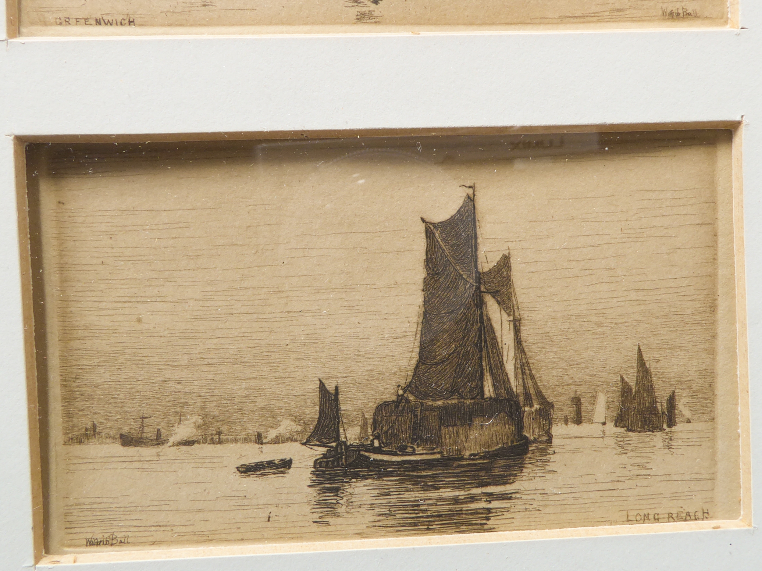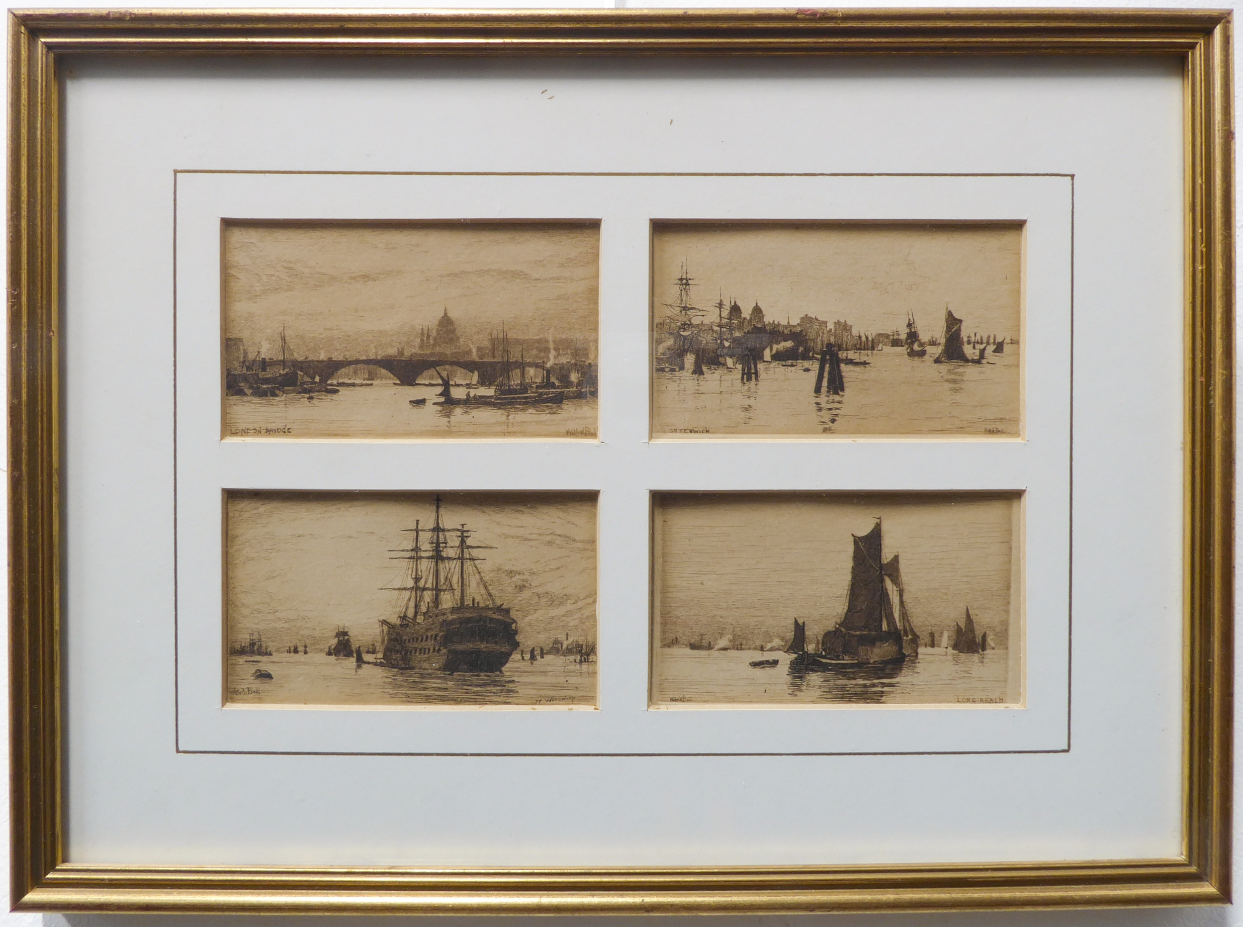 After WILLIAM BALL - A series of four etchings: London Bridge, Greenwich, Off Woolwich and Long Reach framed as one (each 2¼ x 3¾in; 5.5 x 9.5cm). Good condition bar acidic discolouration