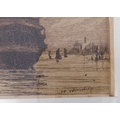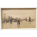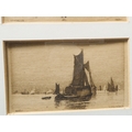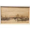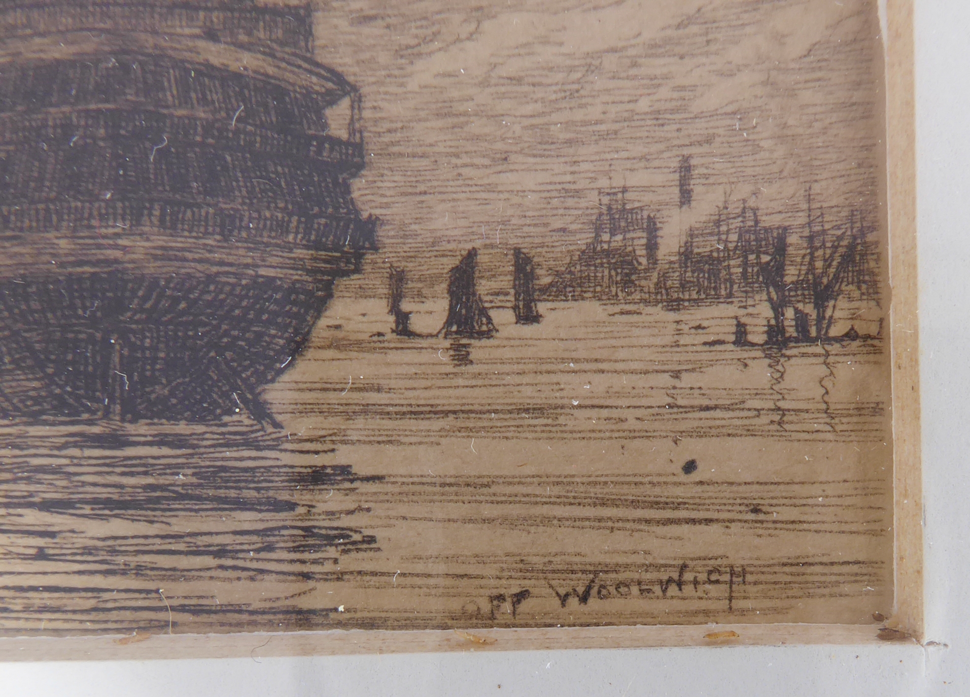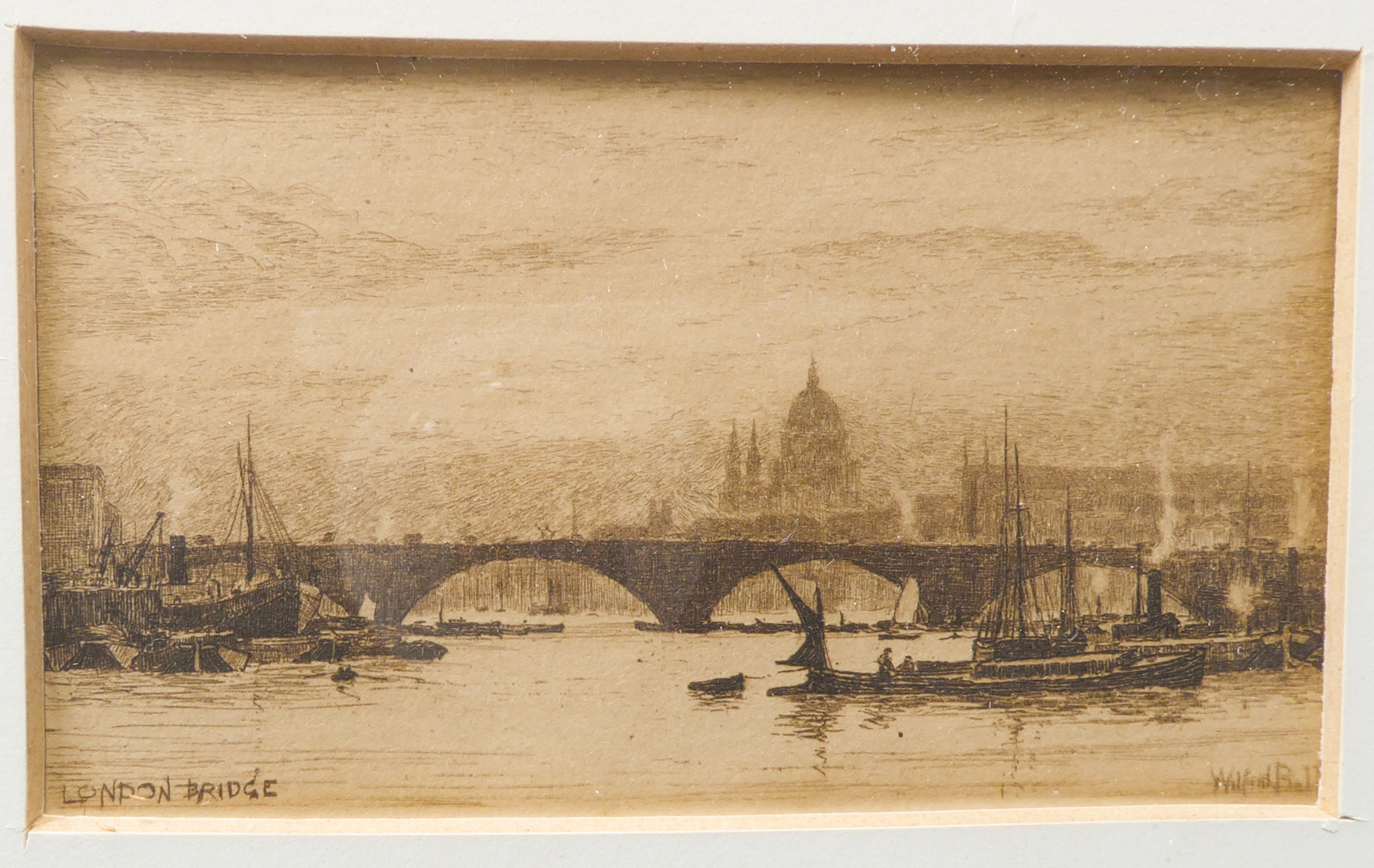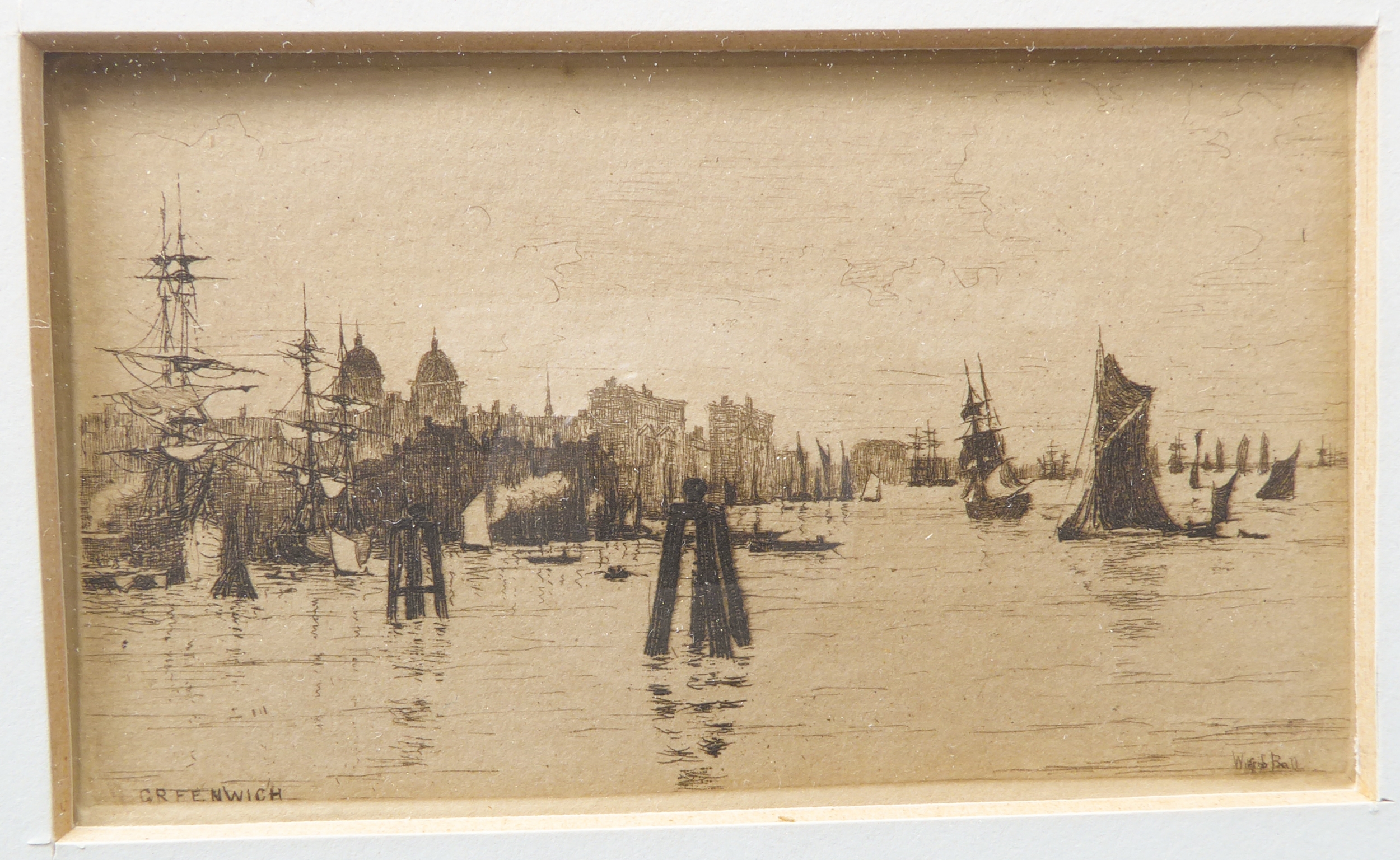 After WILLIAM BALL - A series of four etchings: London Bridge, Greenwich, Off Woolwich and Long Reach framed as one (each 2¼ x 3¾in; 5.5 x 9.5cm). Good condition bar acidic discolouration