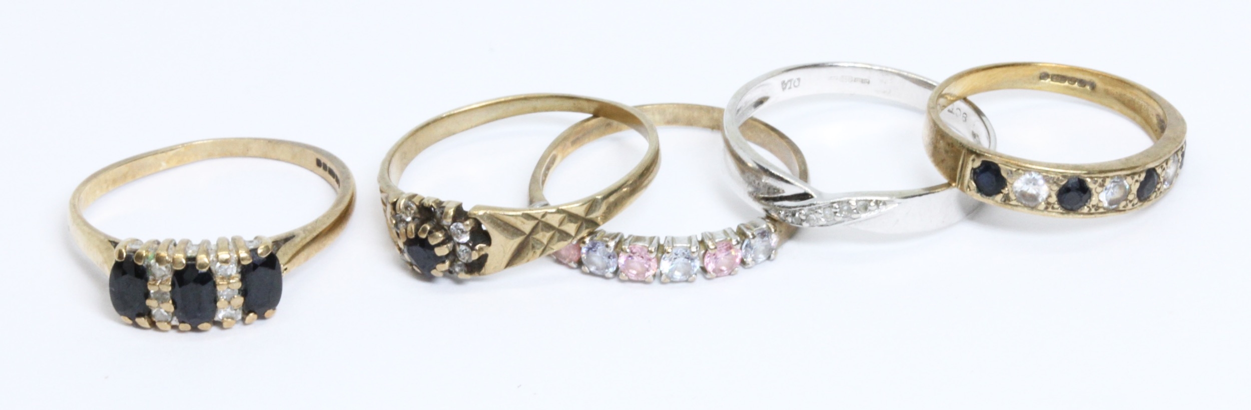 A group of five assorted hallmarked 9ct gold rings, gross weight 8.3g, size M - P, 10% buyer's premium (inclusive of VAT), normal online bidding fees apply.