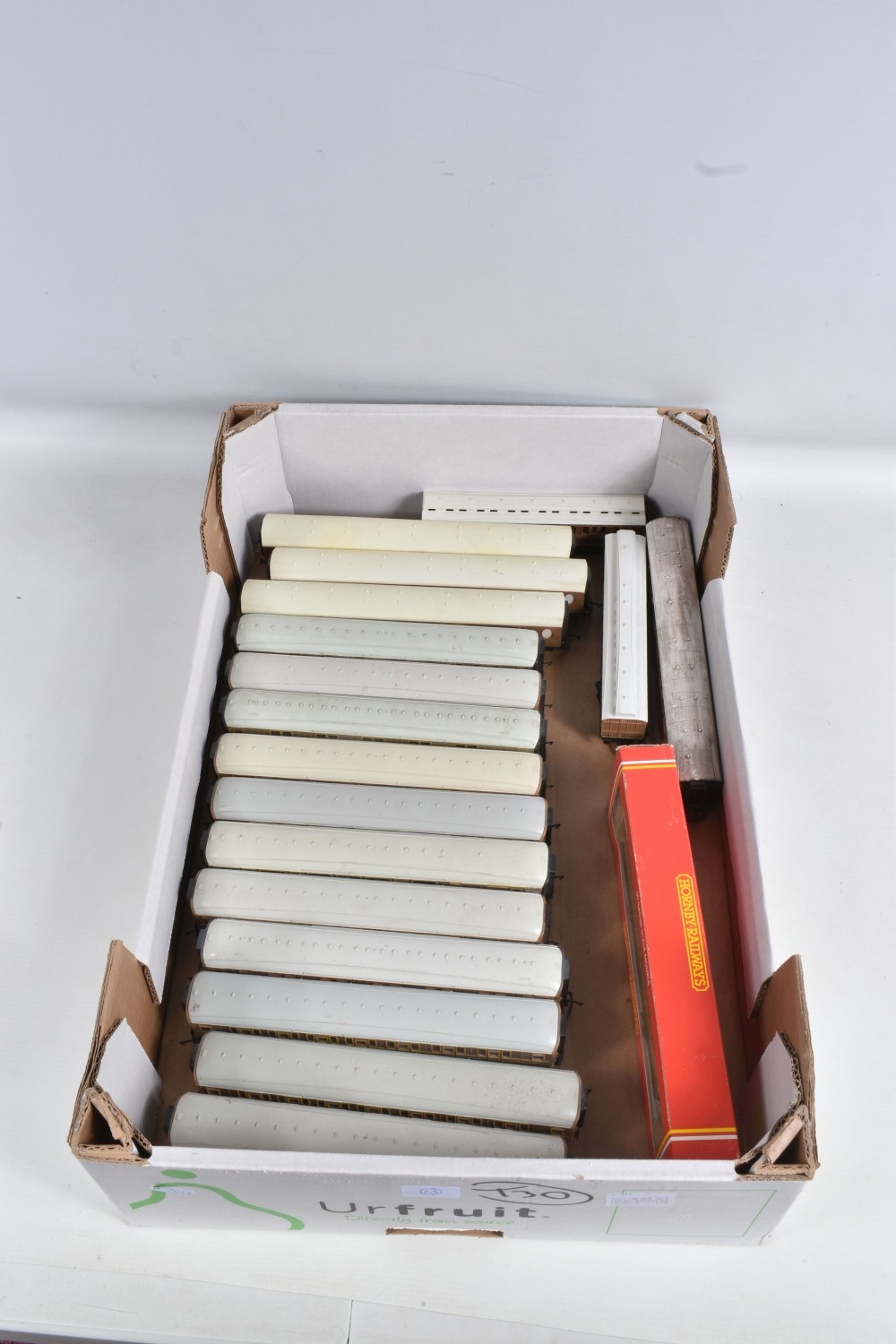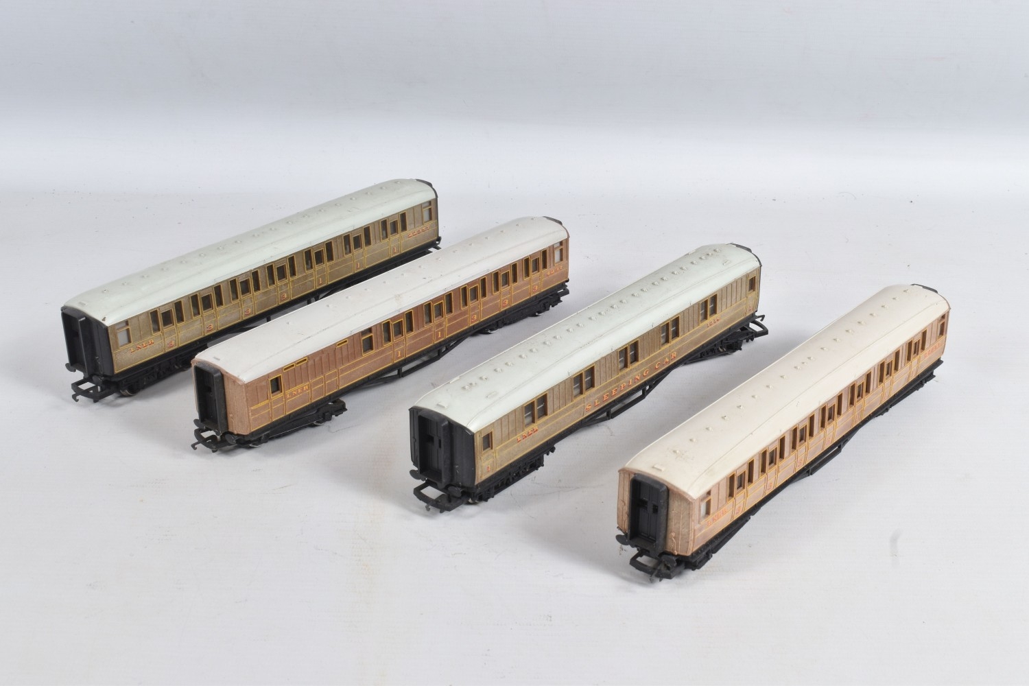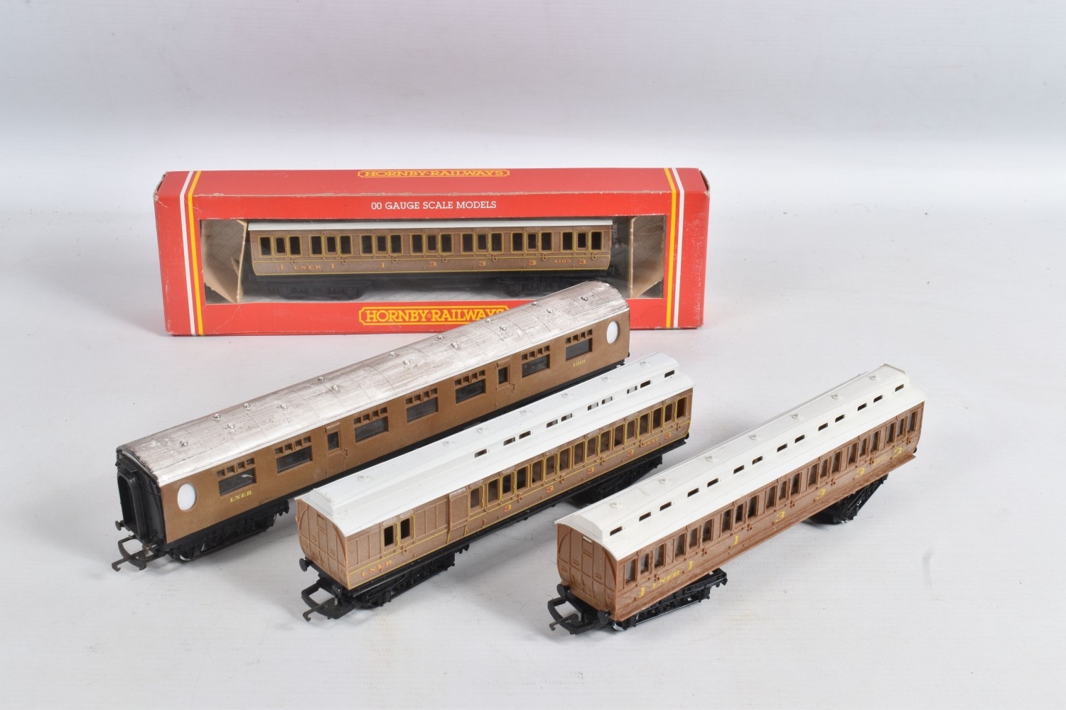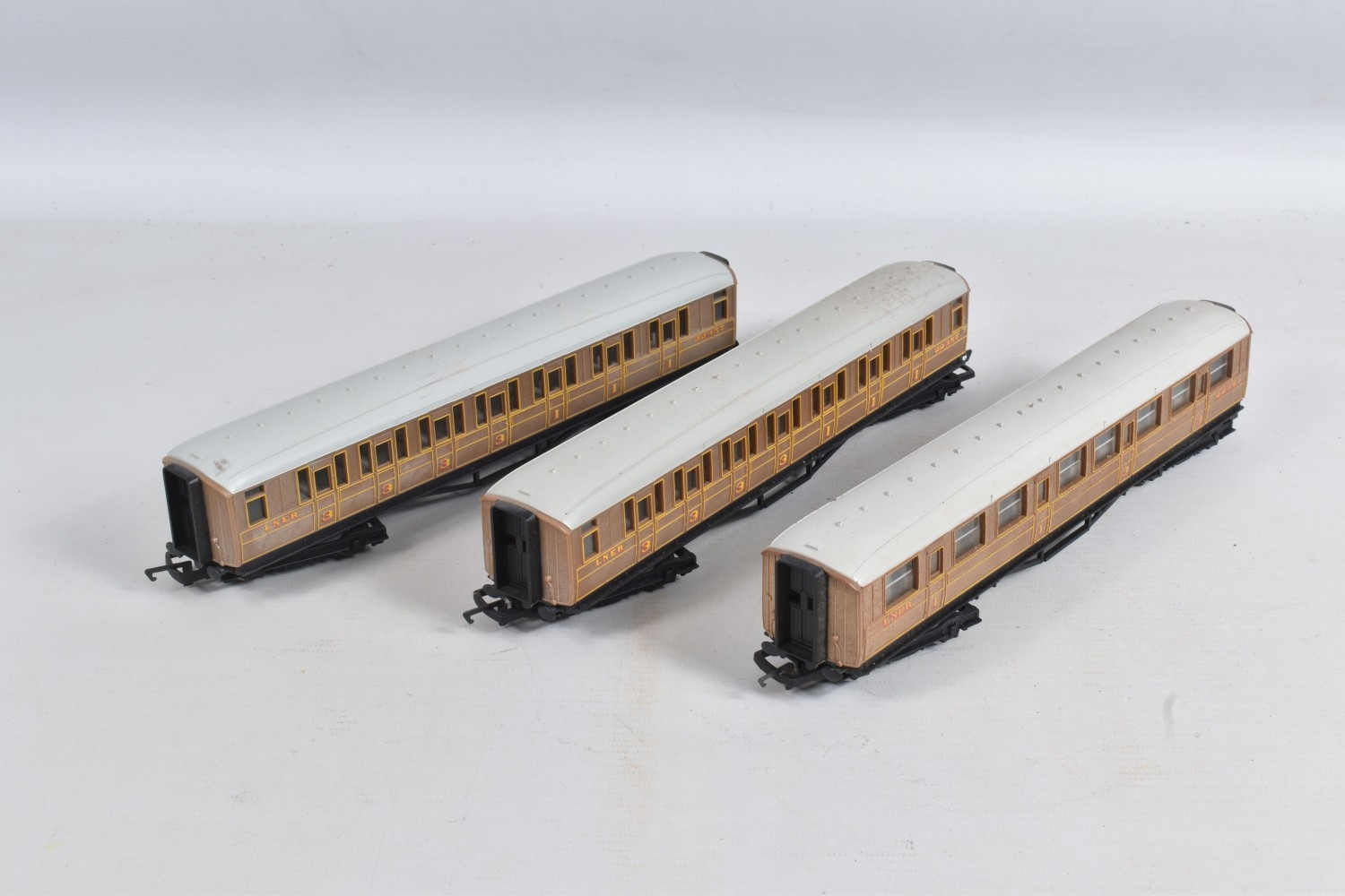 A QUANTITY OF MAINLY UNBOXED OO GAUGE TRI-ANG & HORNBY L.N.E.R. COACHING STOCK, assorted Short Clerestory, Gresley & Thompson coaches, all in L.N.E.R. 'teak' livery with white roof, majority in good condition with only minor wear, one Thompson coach missing a buffer, box in fairly good condition (18)