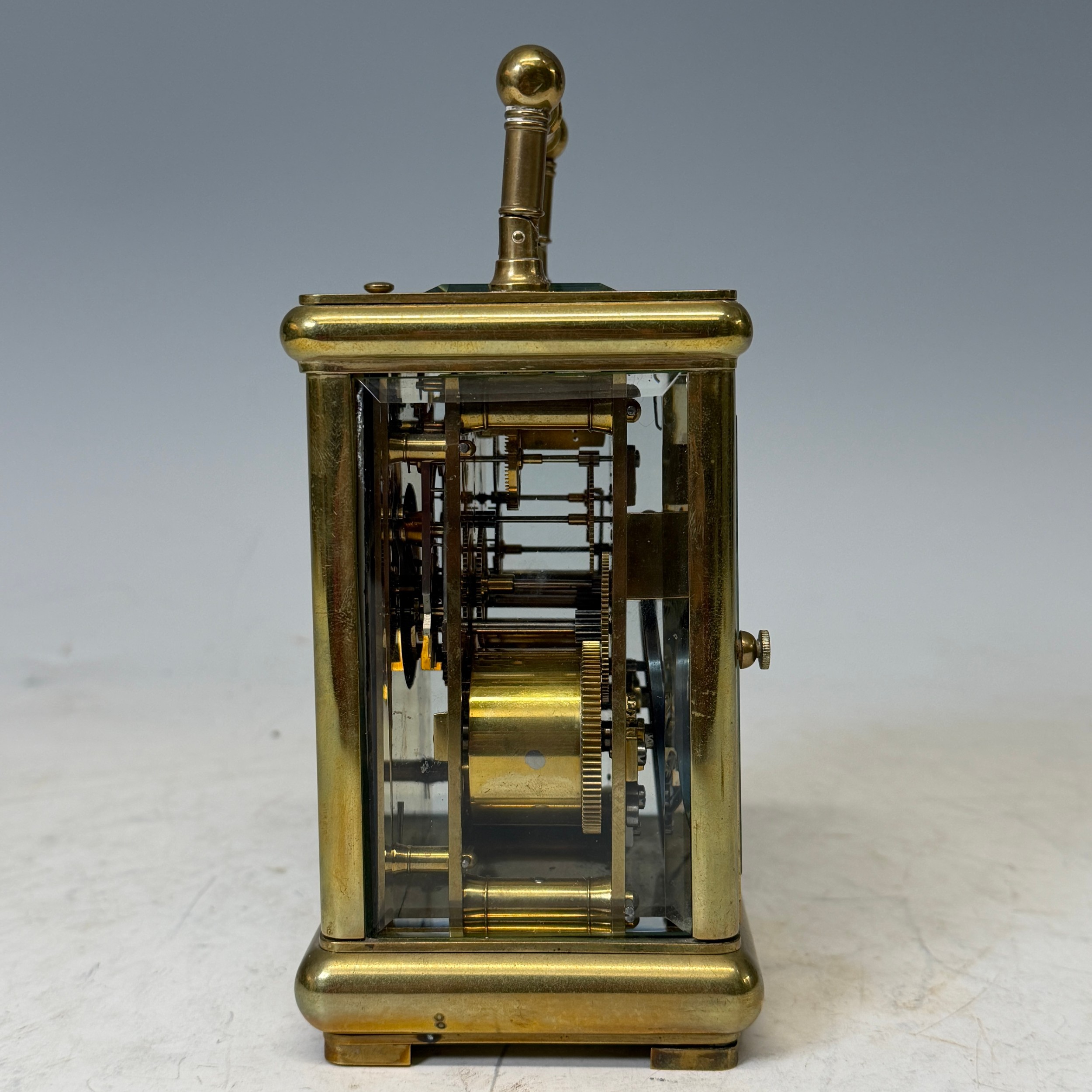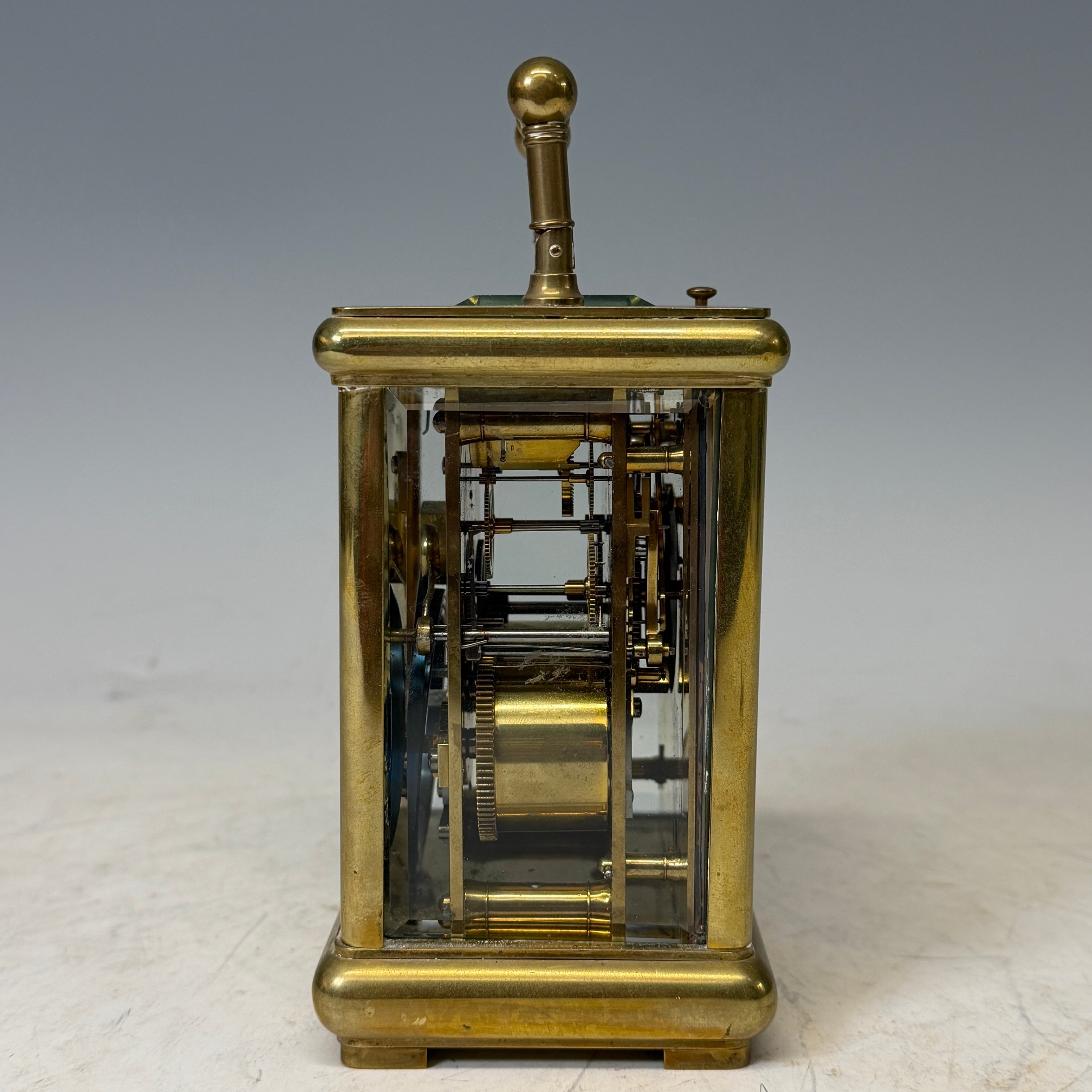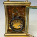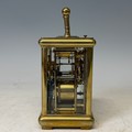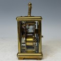 A 19th century gilt brass cased carriage Clock, with repeat and striking on gong, backplate stamped '1837' and also with 'CV' monogram, complete with key, H 15 cm.