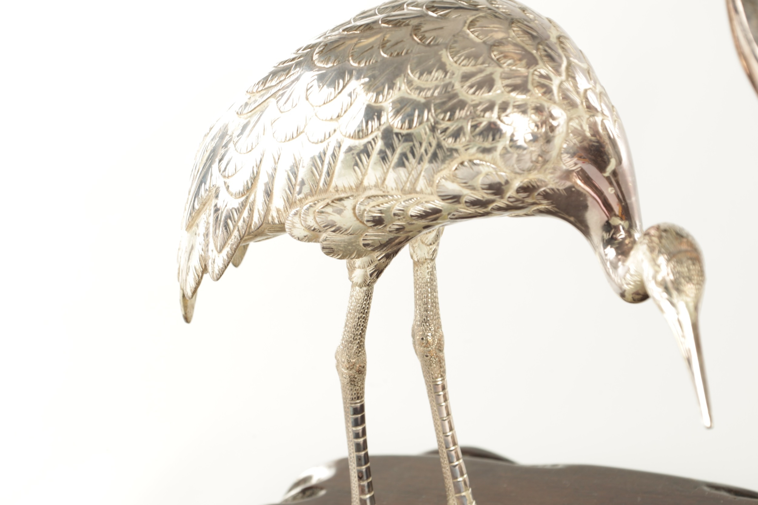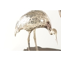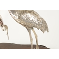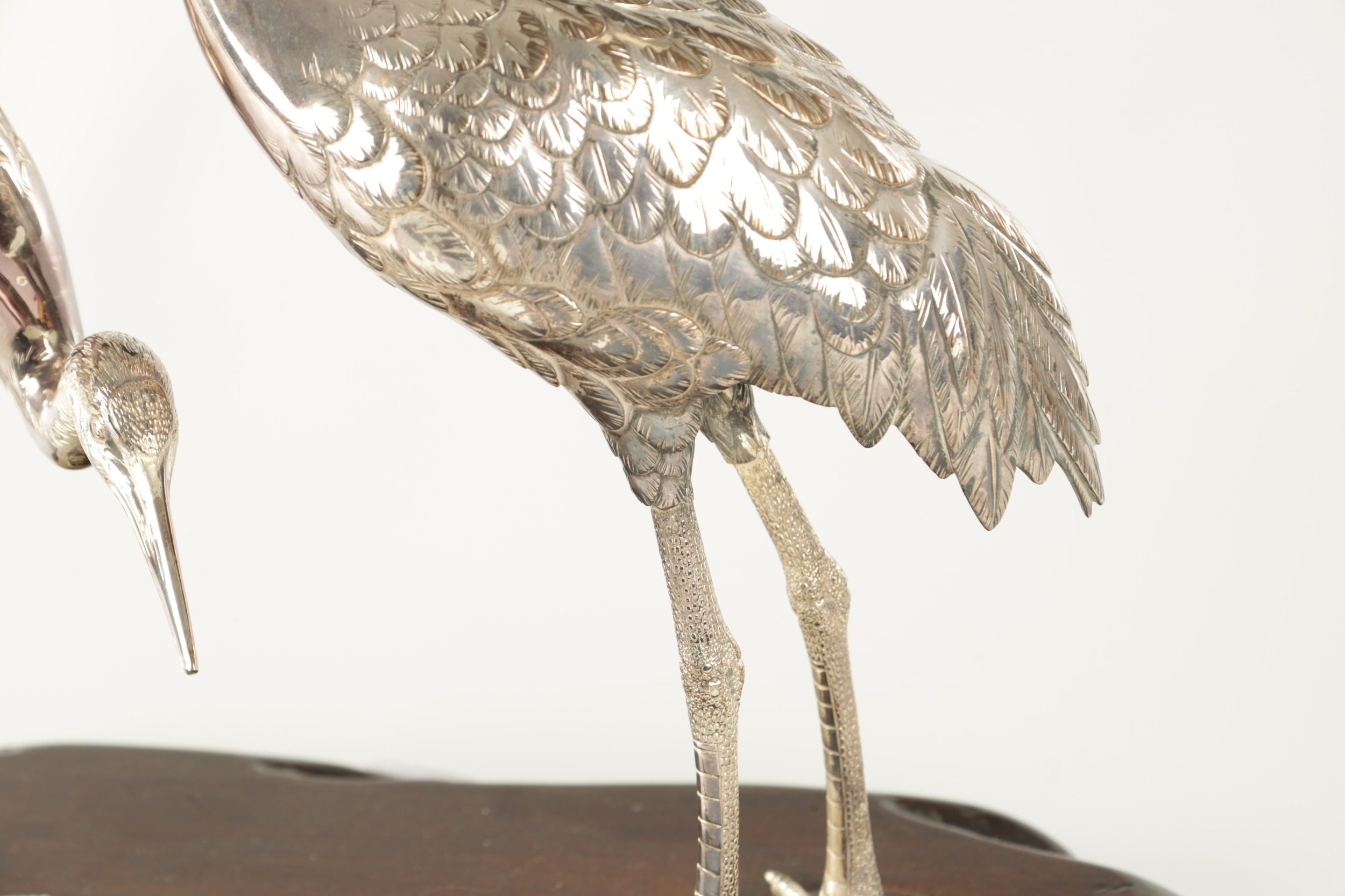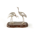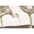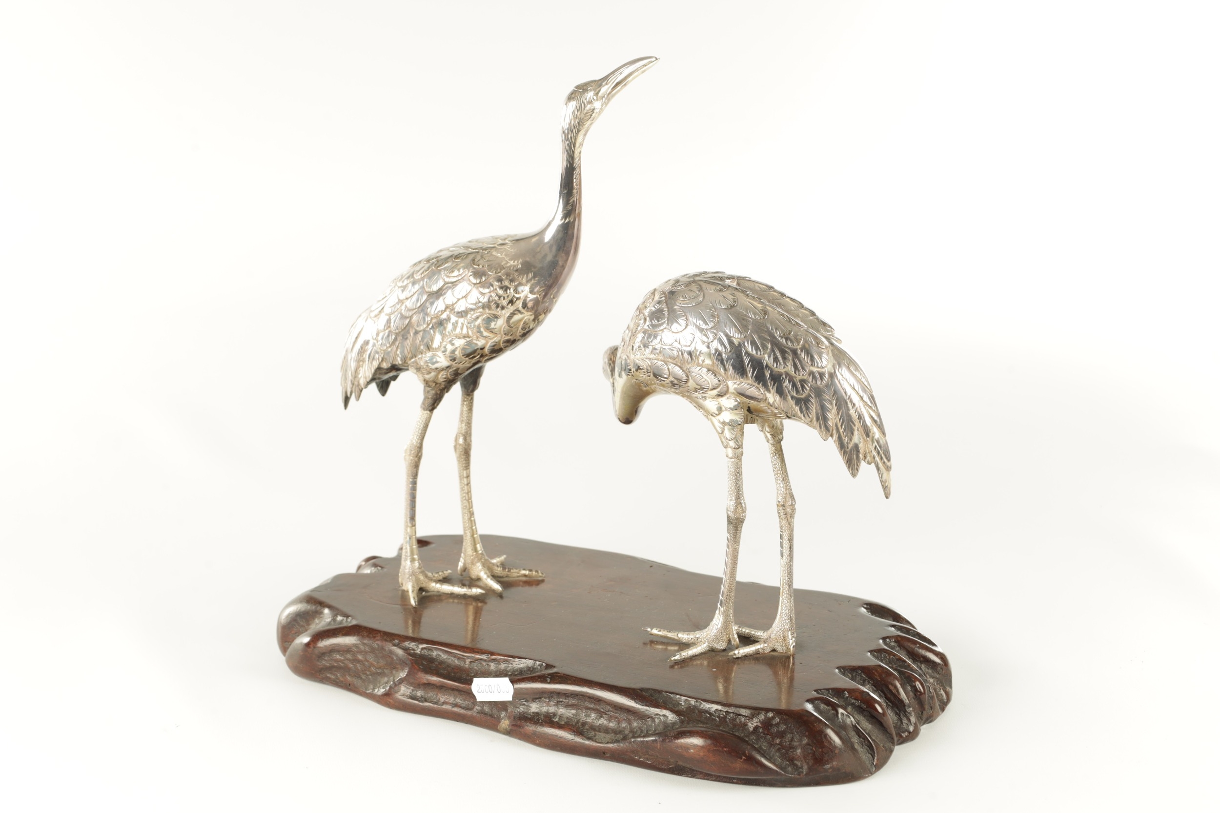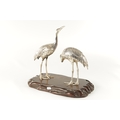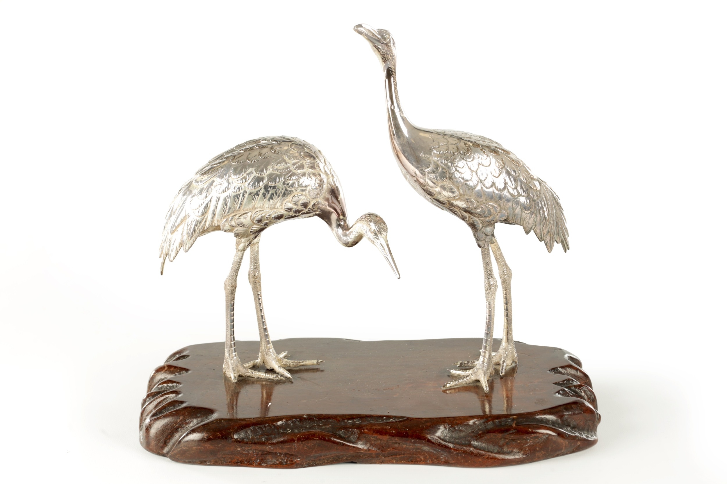 A PAIR OF JAPANESE MEIJI PERIOD SILVERED BRONZE SCULPTURES OF CRANES mounted on a naturalistic hardwood base (34cm high )
