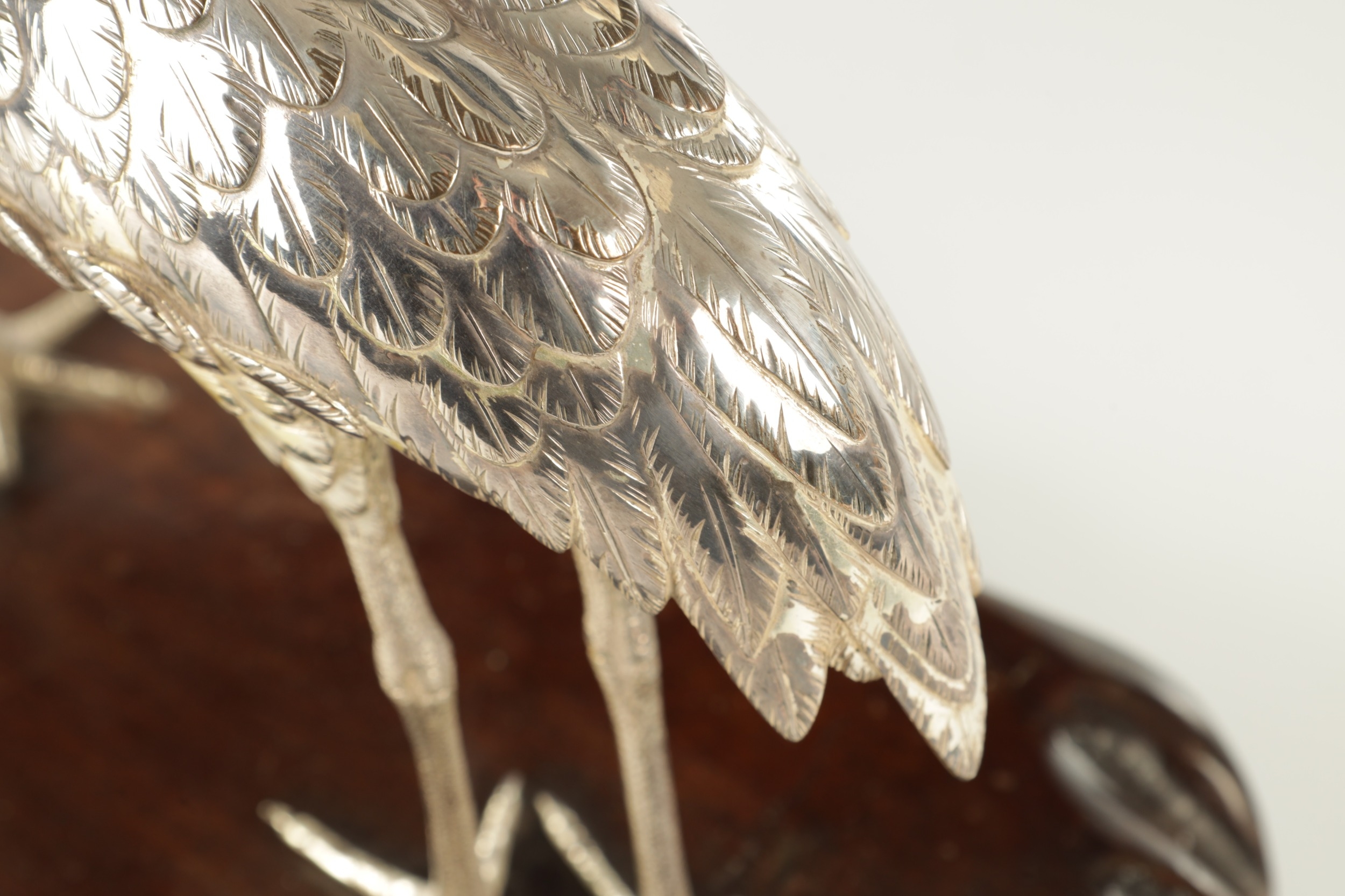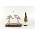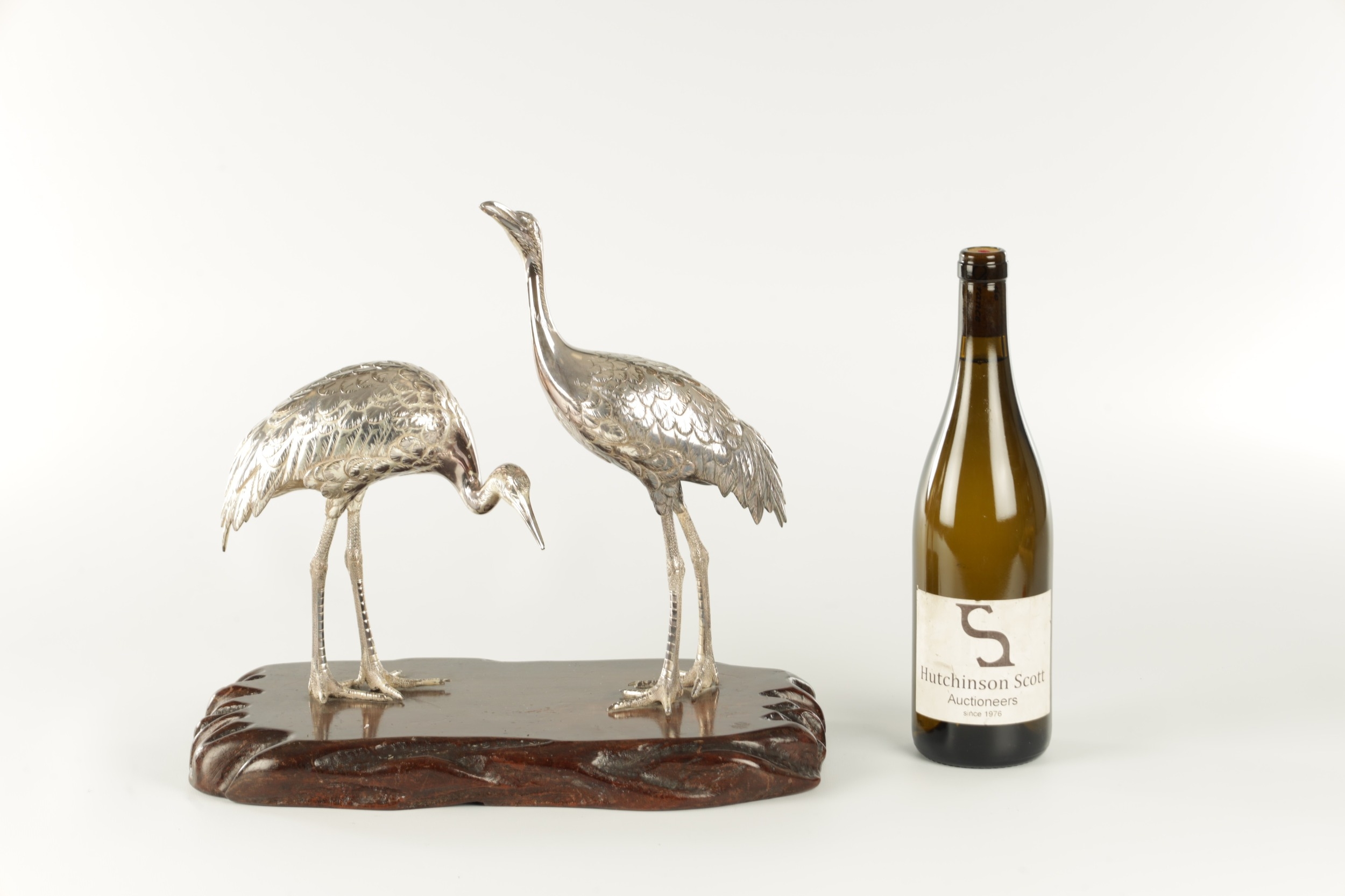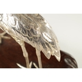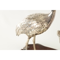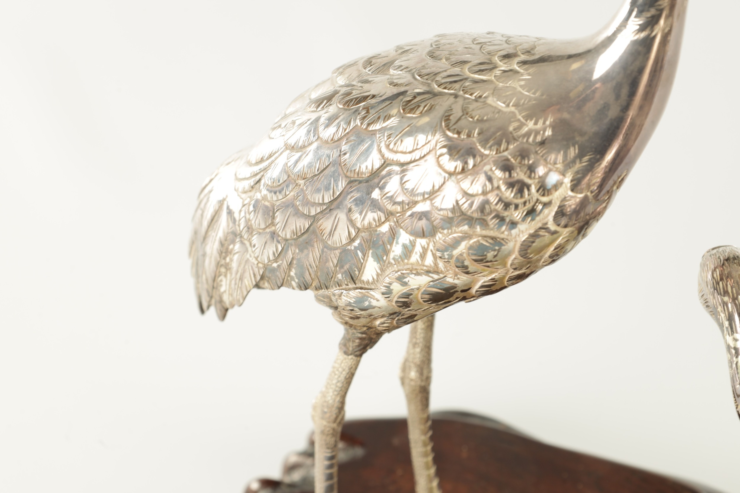 A PAIR OF JAPANESE MEIJI PERIOD SILVERED BRONZE SCULPTURES OF CRANES mounted on a naturalistic hardwood base (34cm high )