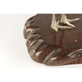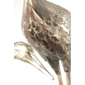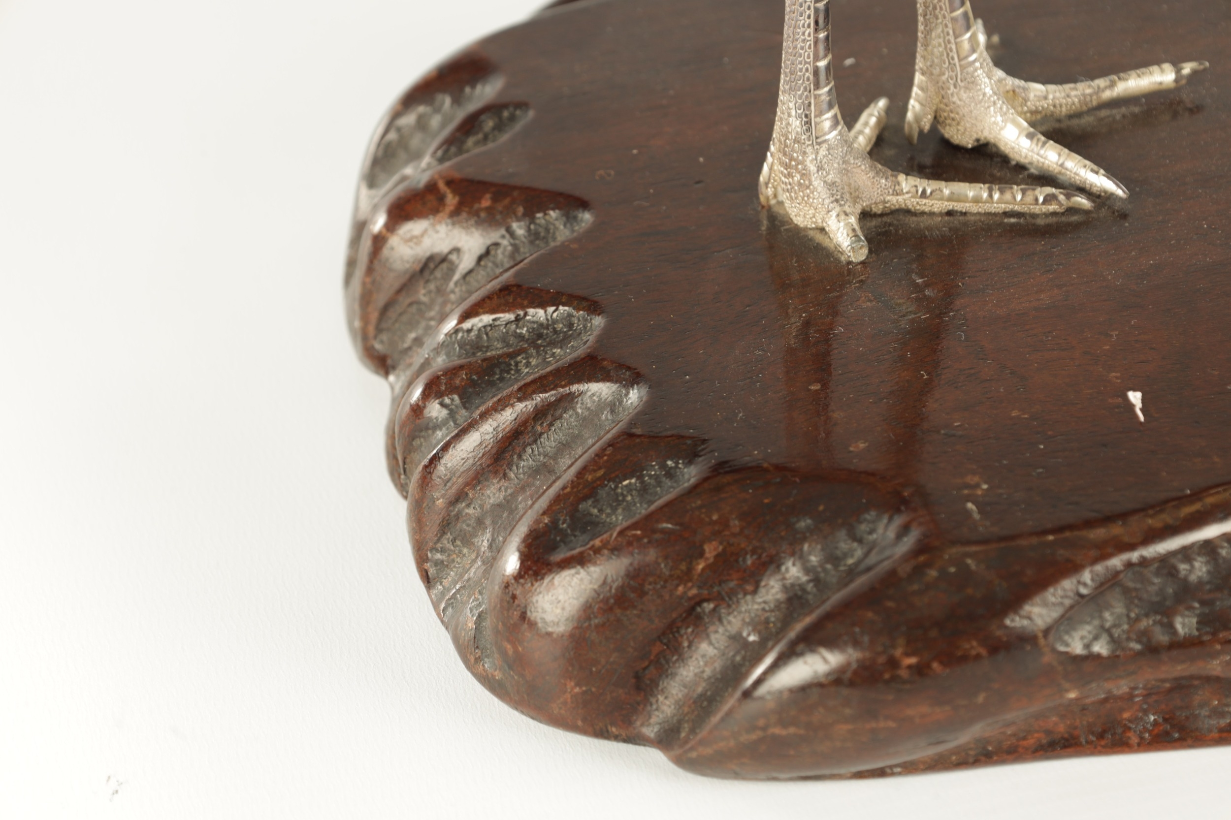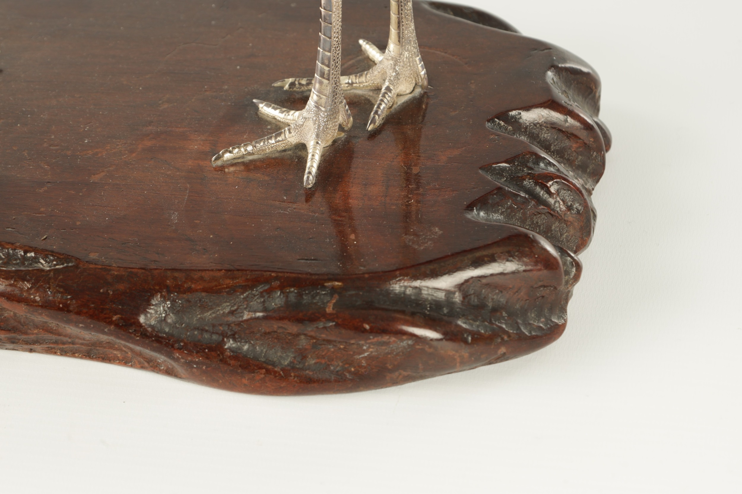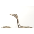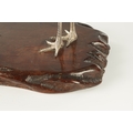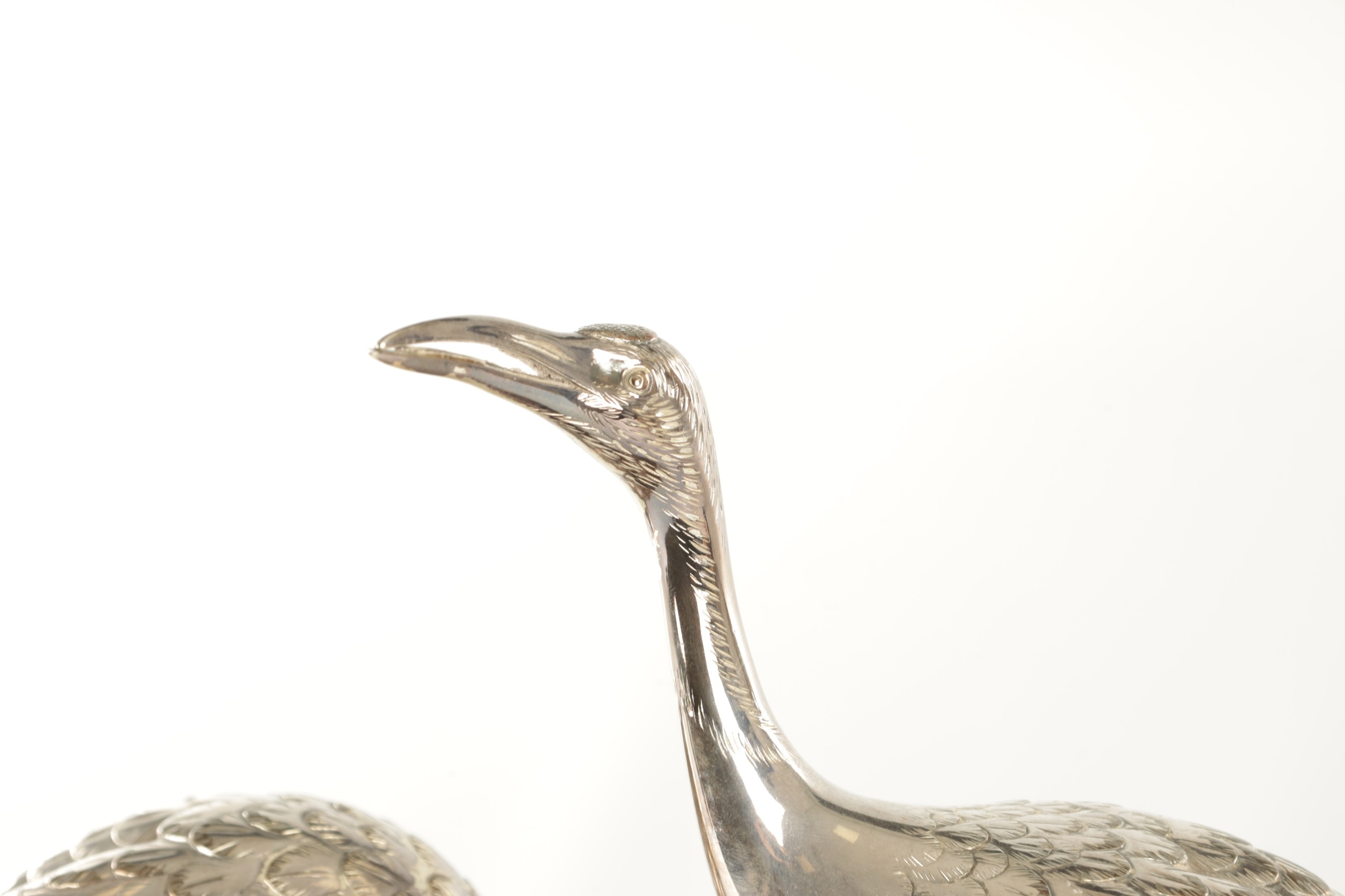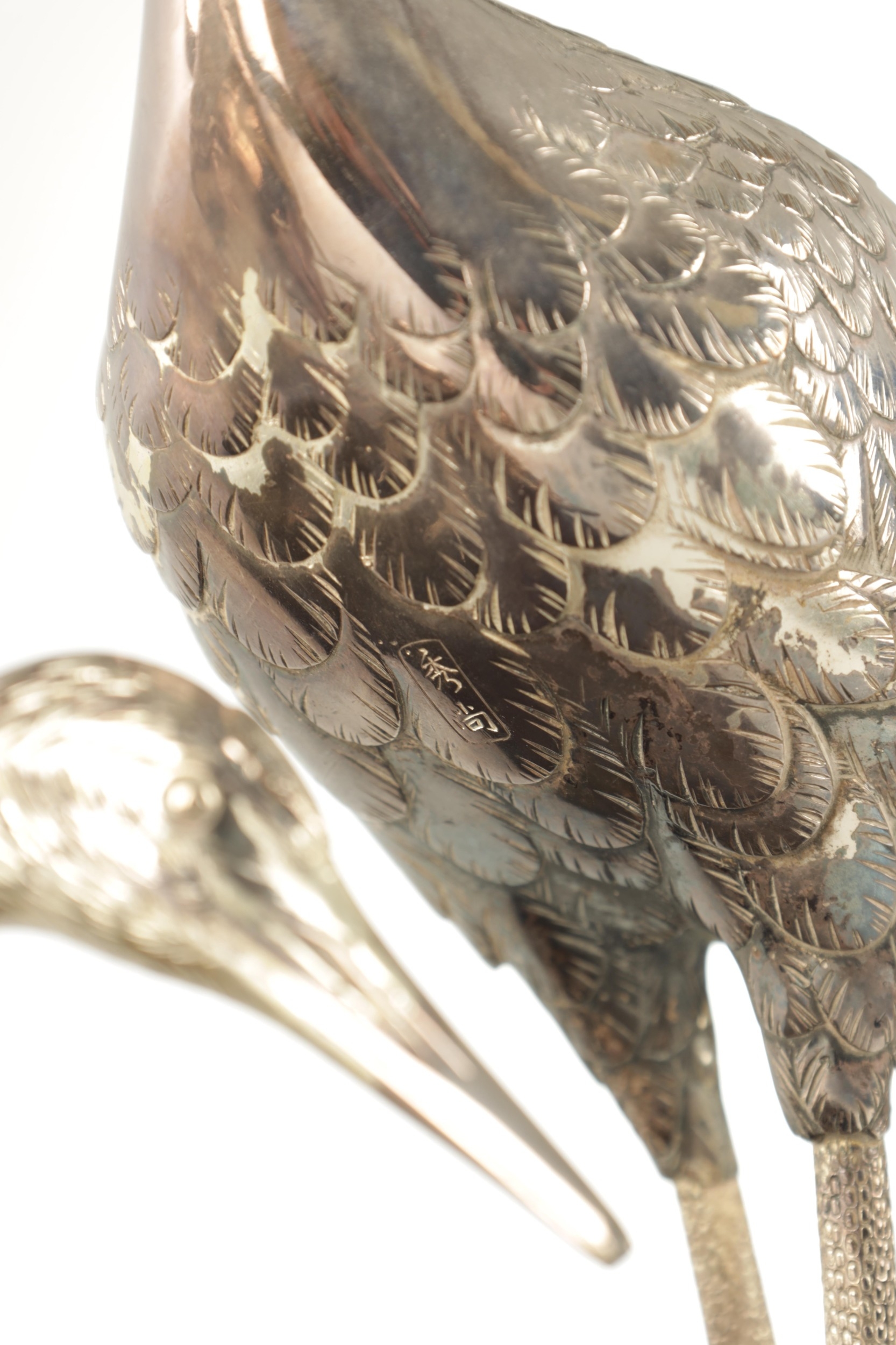 A PAIR OF JAPANESE MEIJI PERIOD SILVERED BRONZE SCULPTURES OF CRANES mounted on a naturalistic hardwood base (34cm high )