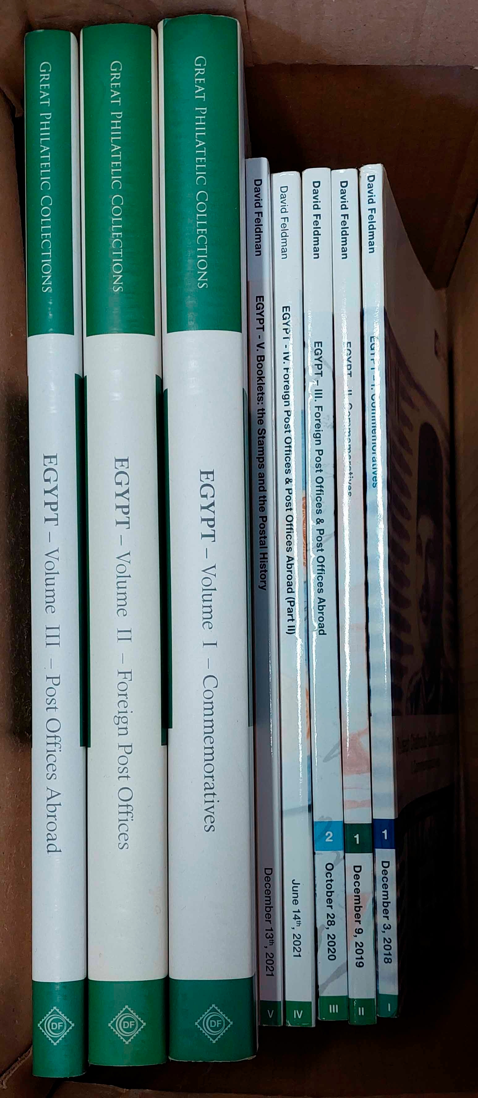 GREAT PHILATELIC COLLECTIONS: EGYPT vol. 1 - Commemoratives; vol. 2 - Foreign Post Offices; and vol. 3 - Post Offices Abroad: The Chalhoub Collection, published by David Feldman (2017-18). Limited run of 50, 75 and 75 copies respectively. All hardbound with d.j.'s in good condition. Also inc. the first five auction catalogue of the 'Chalhoub' collection held by Feldman from 2018-2021. (8) Cross Reference: EGYPT