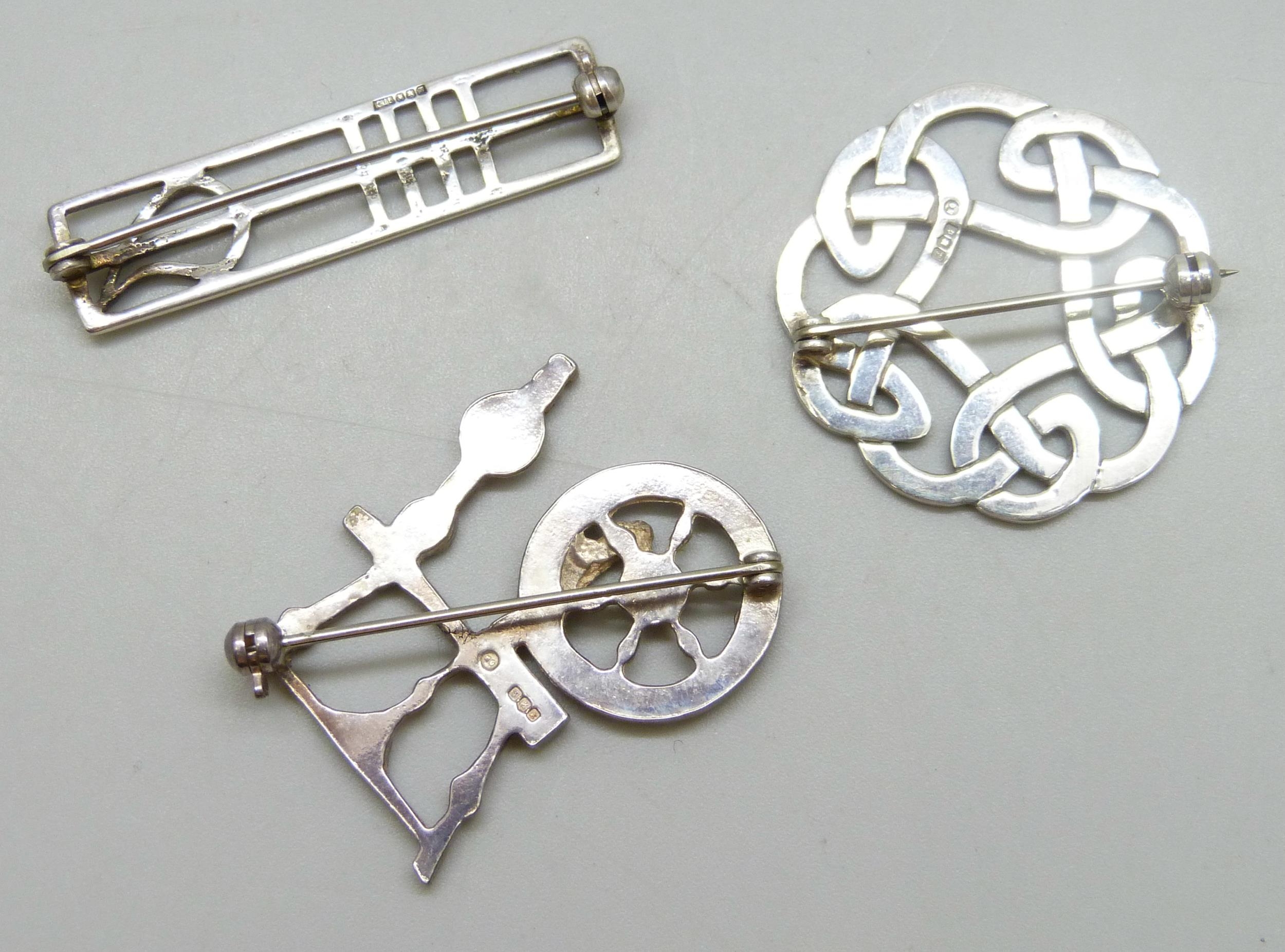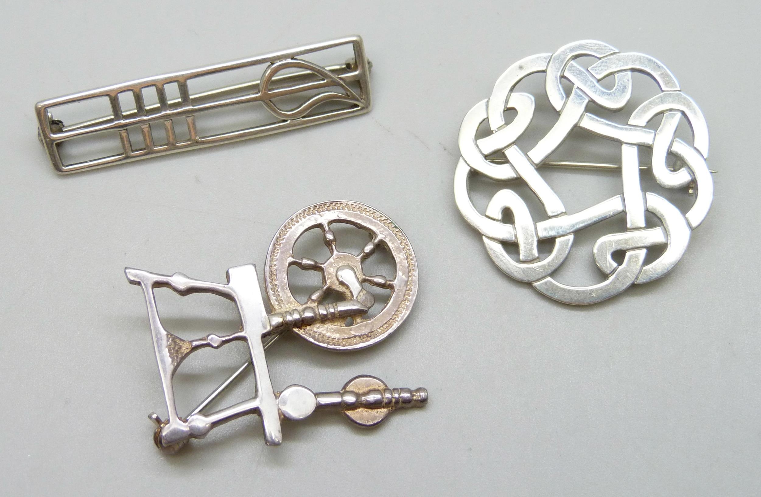 Three Scottish silver brooches including Malcolm Gray and Carrick Jewellers, largest 4.1cm