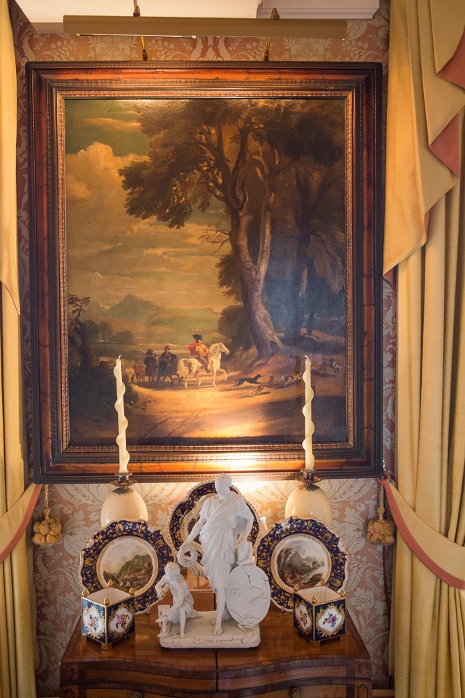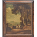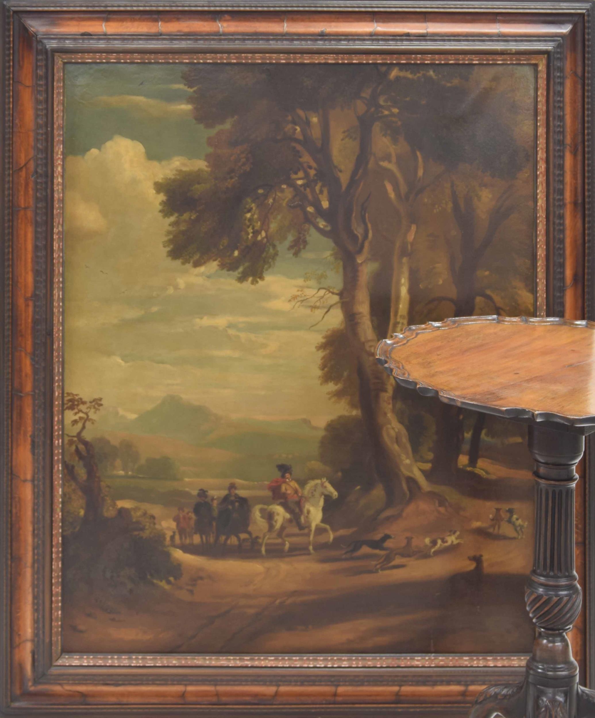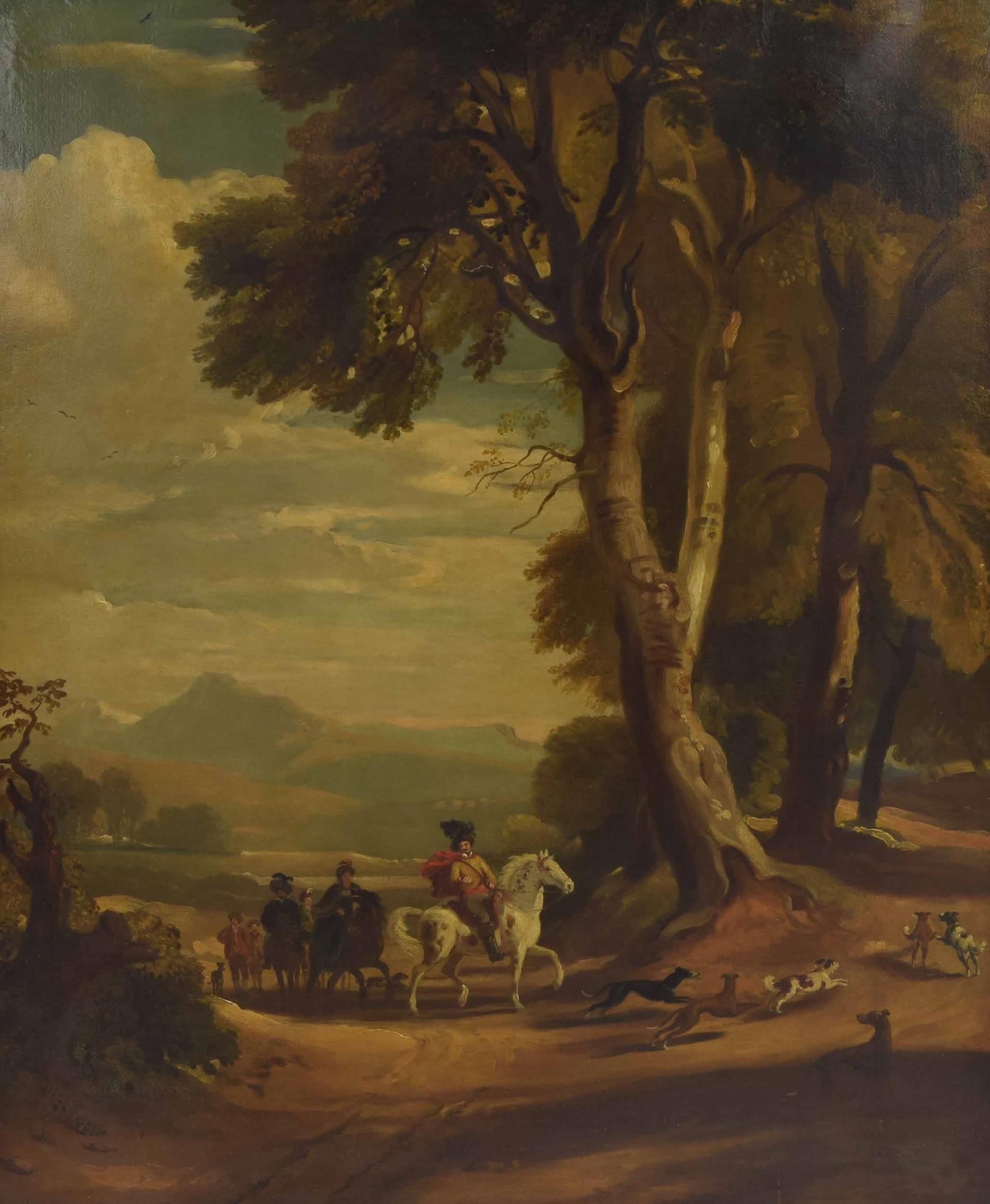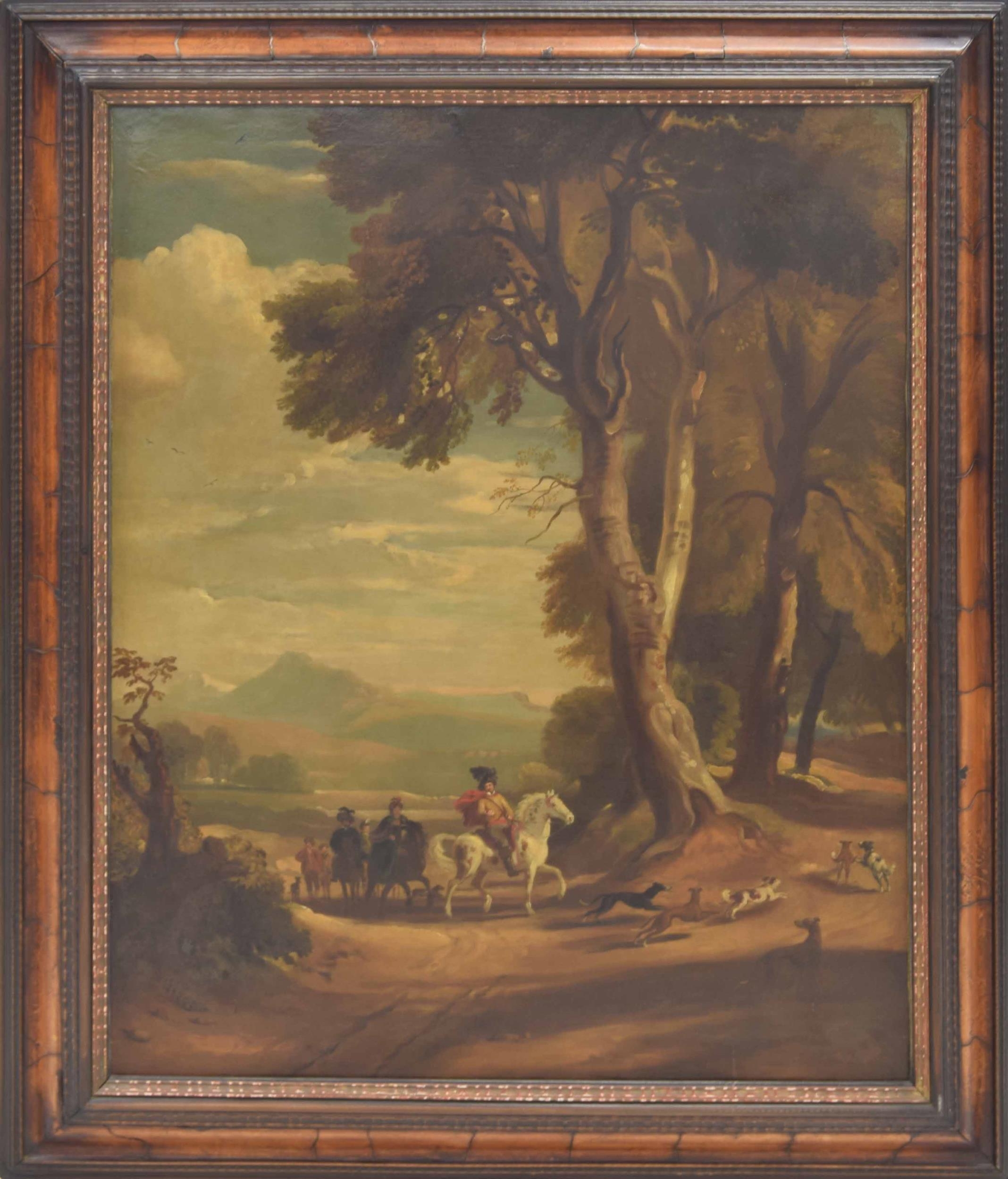 Follower of Jan Wynants (18th/19th century) - gentlemen on horseback with their hounds nearby, commencing a hunting expedition, with an extensive mountainous landscape beyond, oil on canvas, 37" x 30"; within a decorative veneered moulded frame with gilt inner moulding