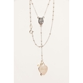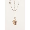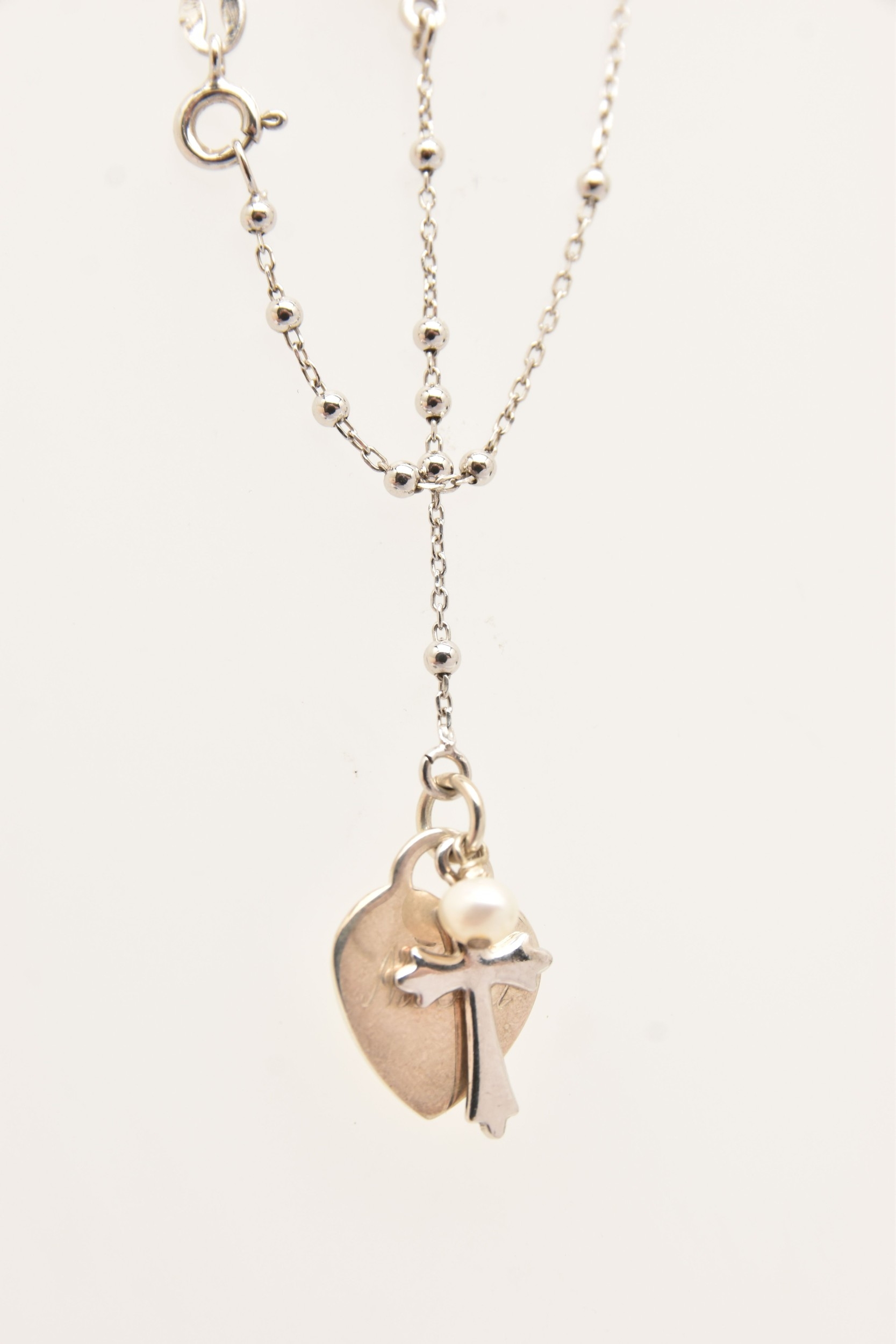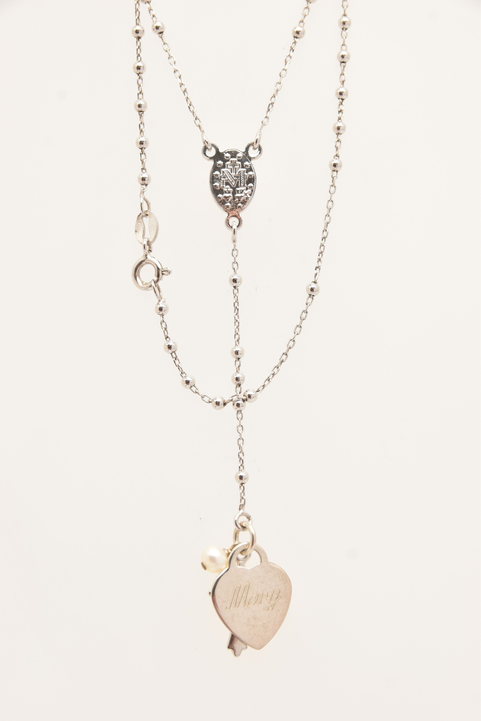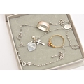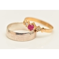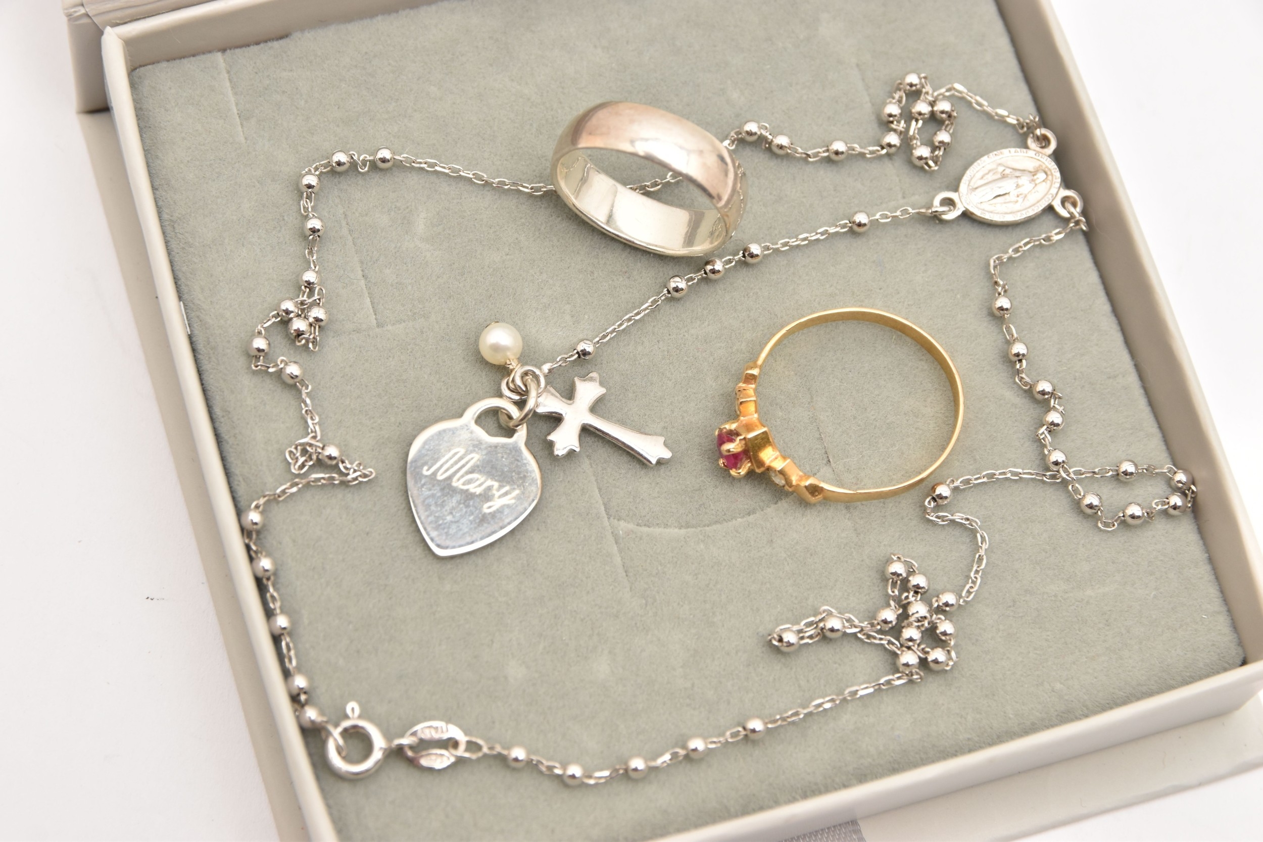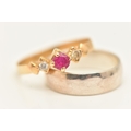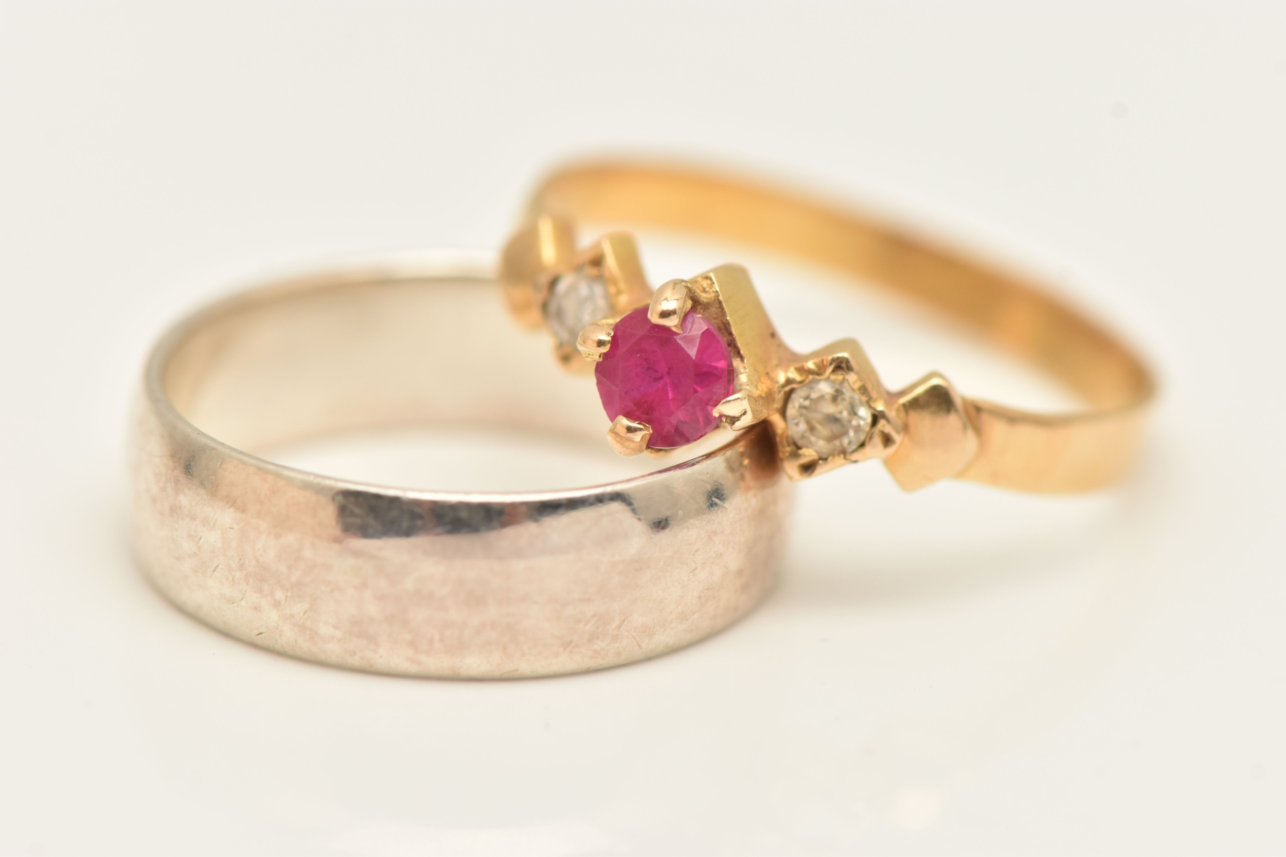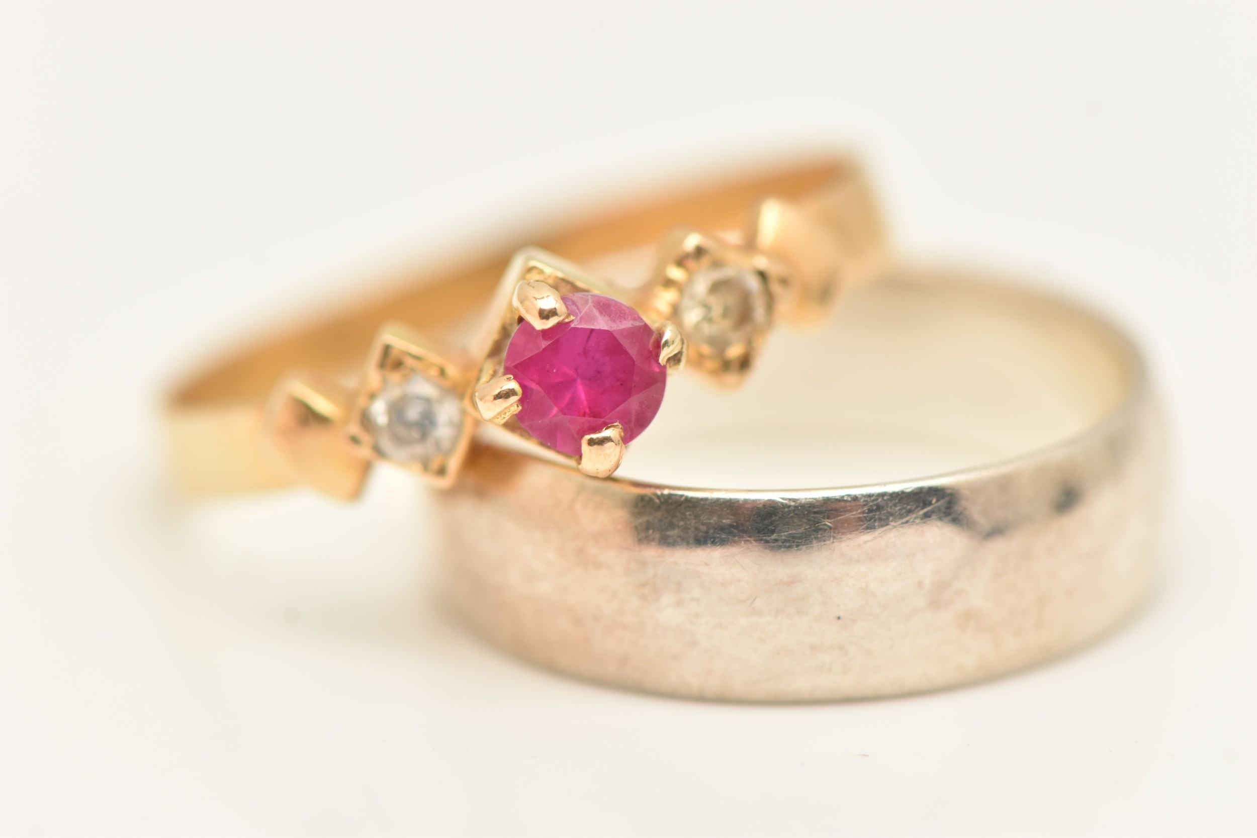 A SMALL ASSORTMENT OF JEWLLERY, to include a continental yellow metal ring set with a ruby and two colourless cubic zirconia, continental mark to the outer band, ring size O, approximate gross weight 1.7 grams, together with a white metal band ring stamped 925, and a white metal rosary style necklace with charms, fitted with a spring clasp stamped 925, approximate gross weight 7.9 grams (condition report: ring has not been tested, viewing is advised to satisfy requirements)