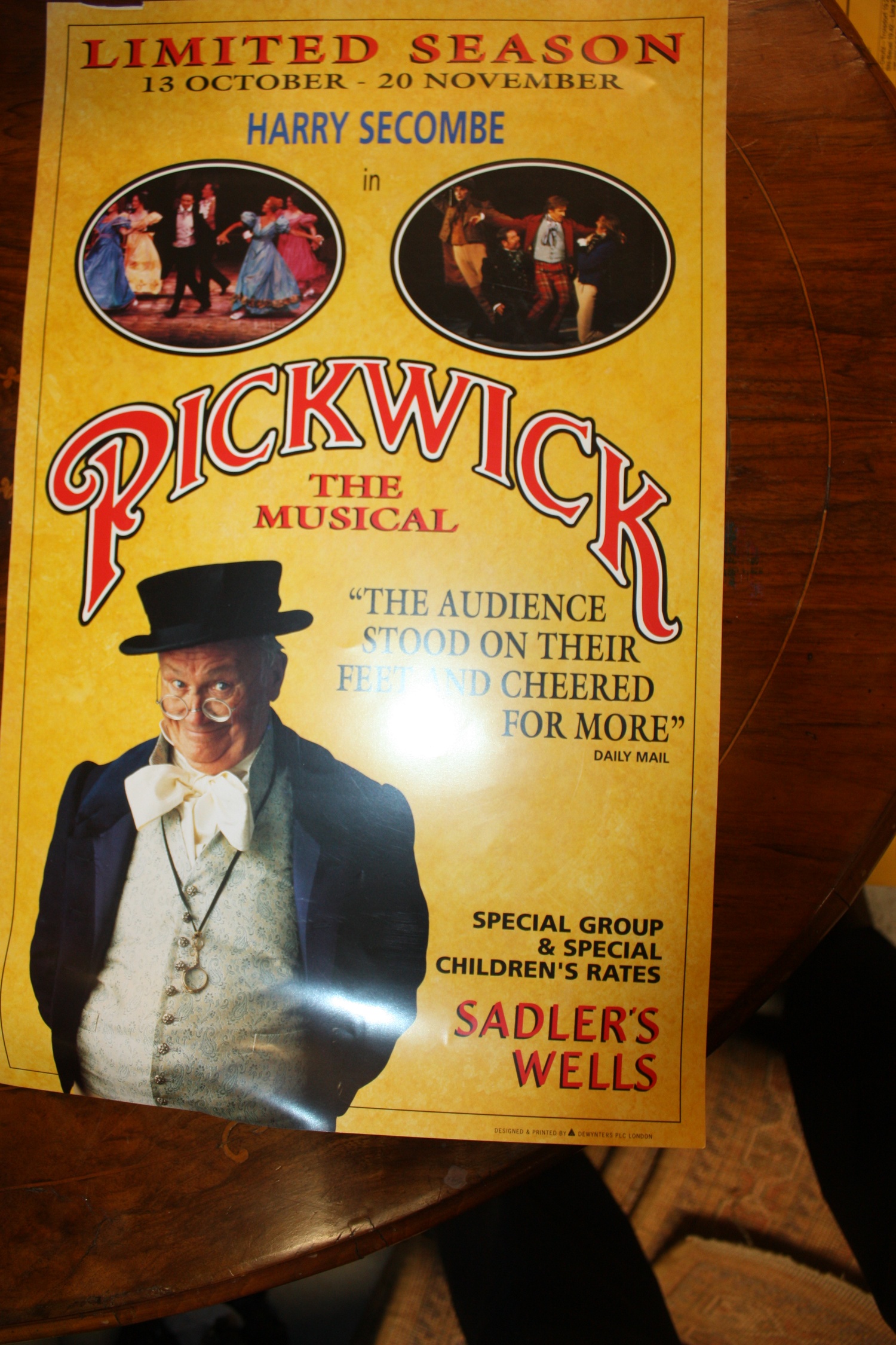 Theatre Poster for Pickwick The Musical at Sadler's Wells starring Harry Seacombe. 20" x 12."