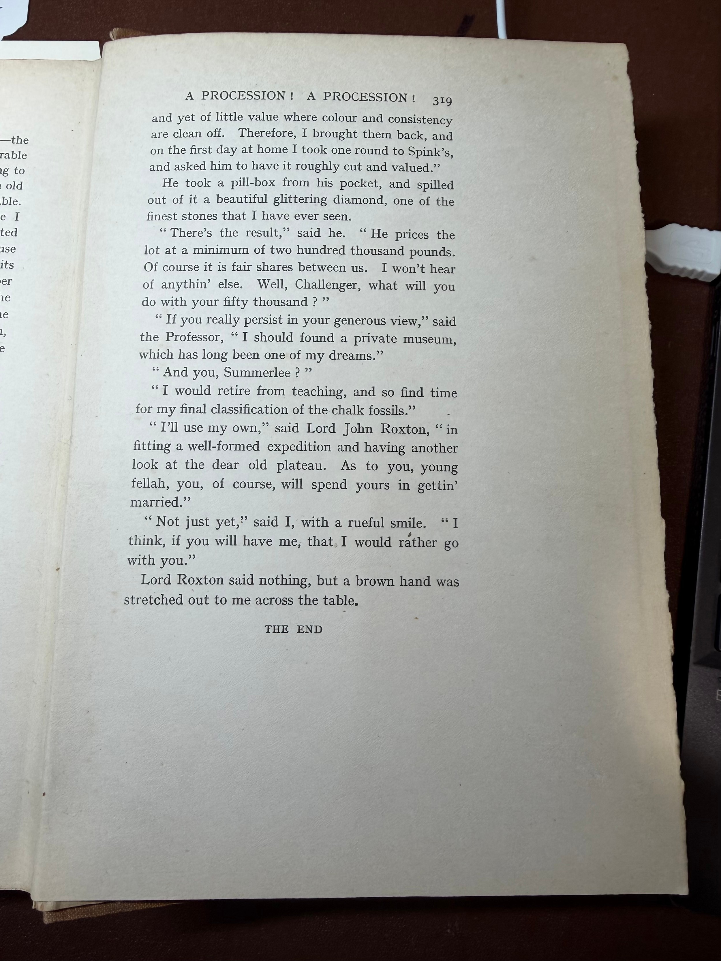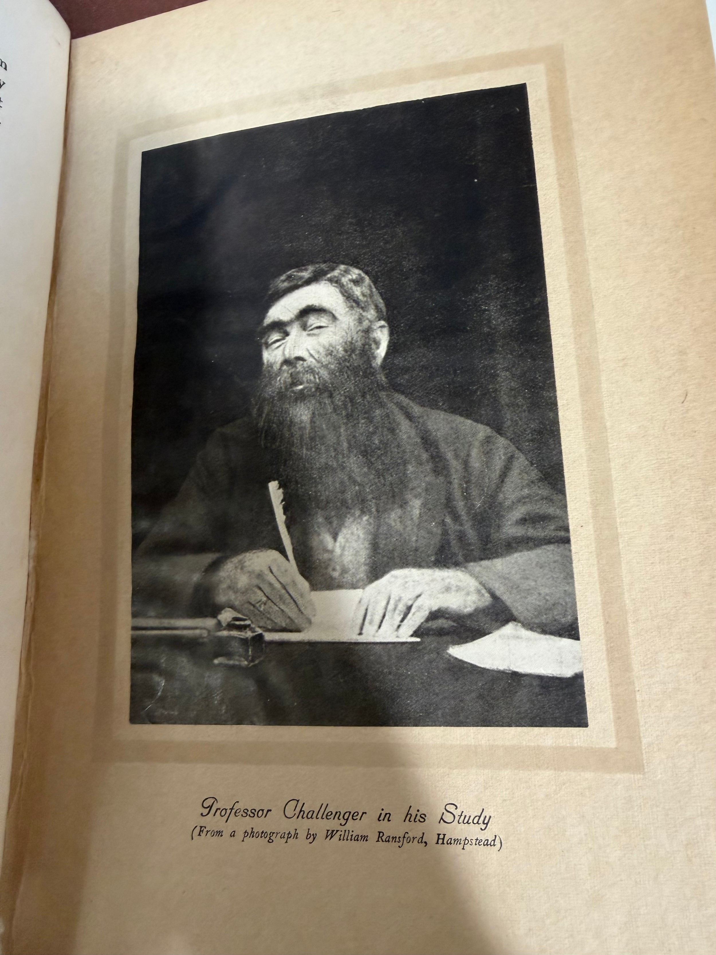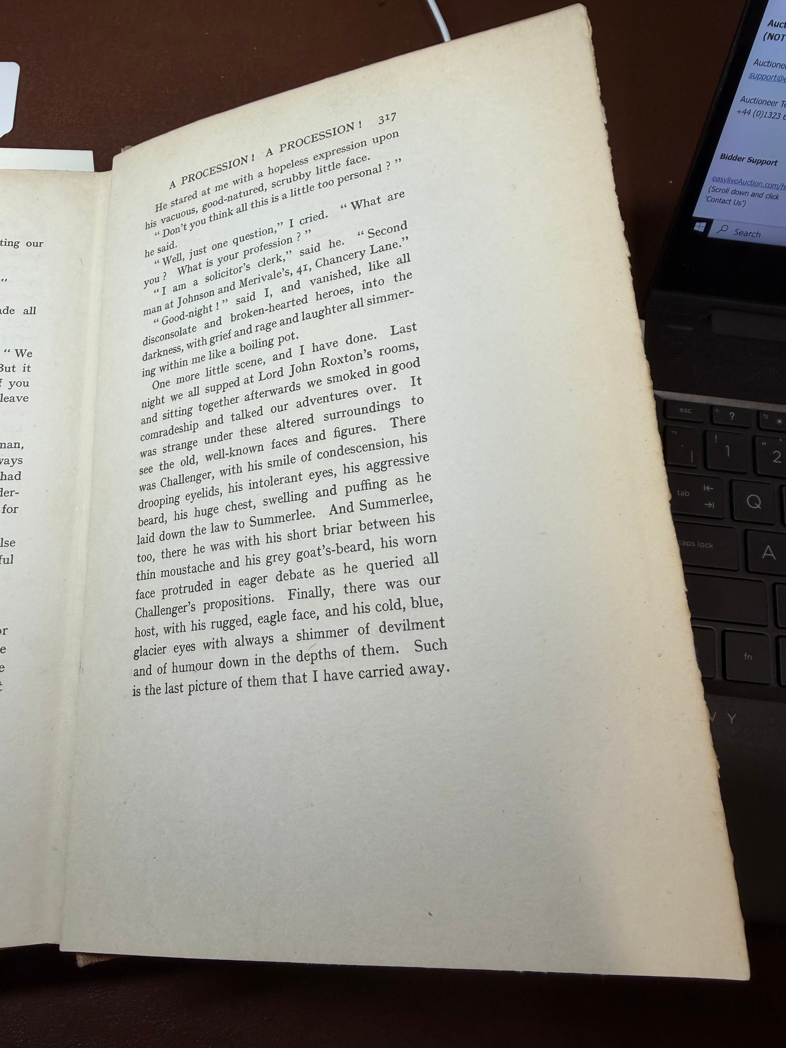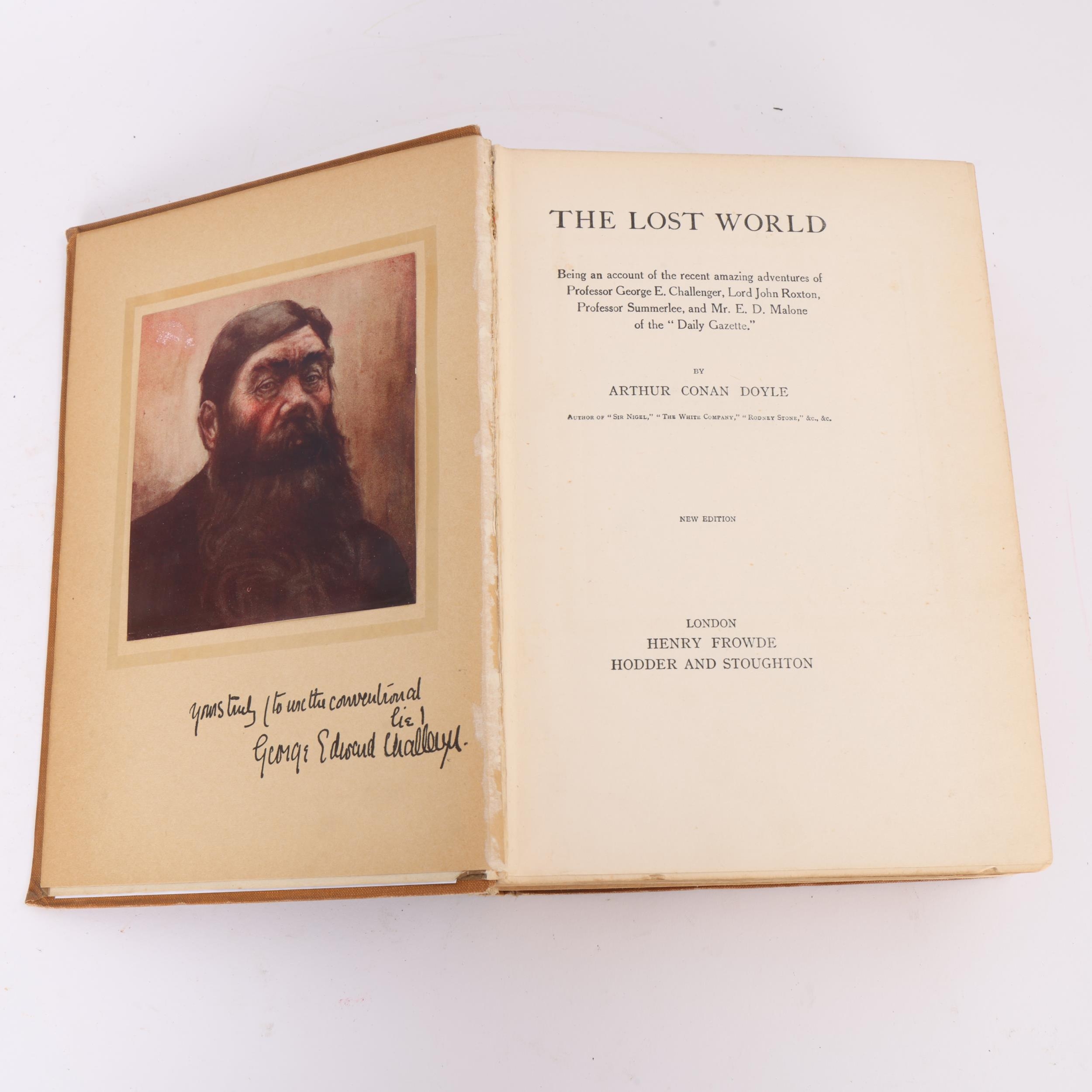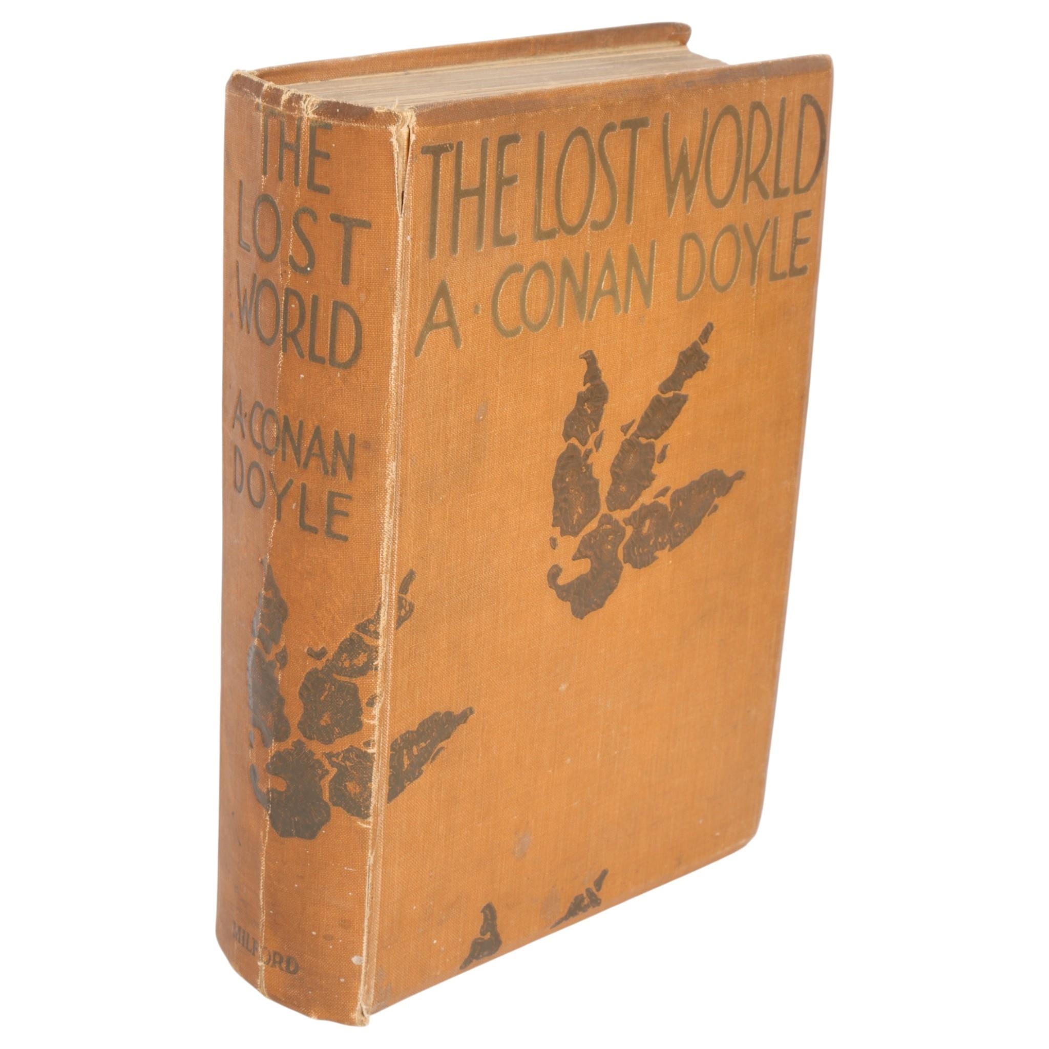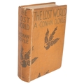 The Lost World, by Arthur Conan Doyle, pub. Henry Frowde, Hodder and Stoughton, n.d. 1914?. The first UK edition, second issue, large paper copy. Distinctive brown cloth stamped with a dinosaur footprint, base of the spine reads 'Milford'. Milford refers to Humphrey Milford of the OUP, who took over the distribution of remaindered stock from Hodder (though the original publisher's name remains on the title page). This edition is prized for it's distinctive binding. Frontispiece and 12 mounted plates (complete), some coloured. Doyle himself posed for the illustrations of Professor Challenger.
