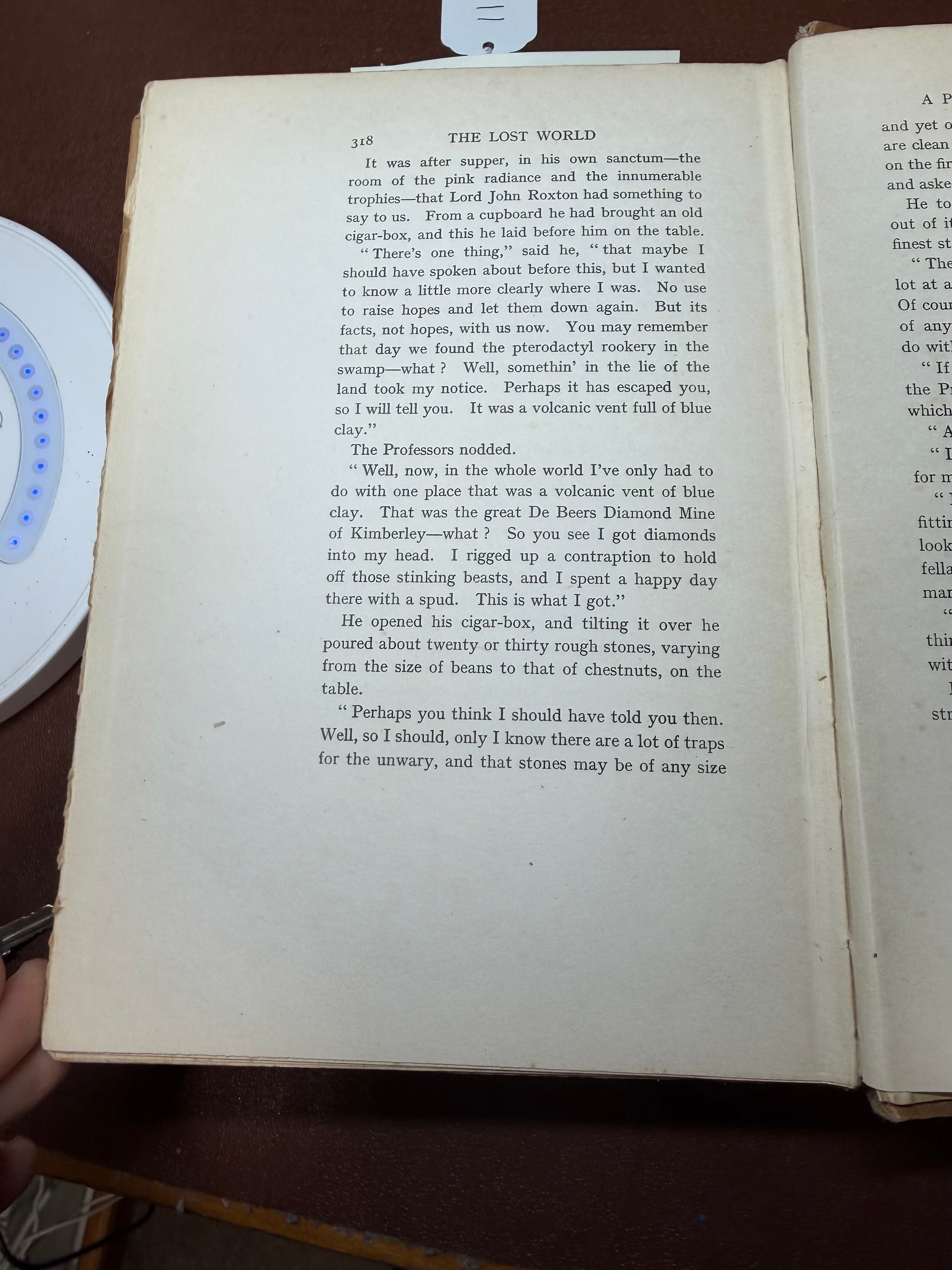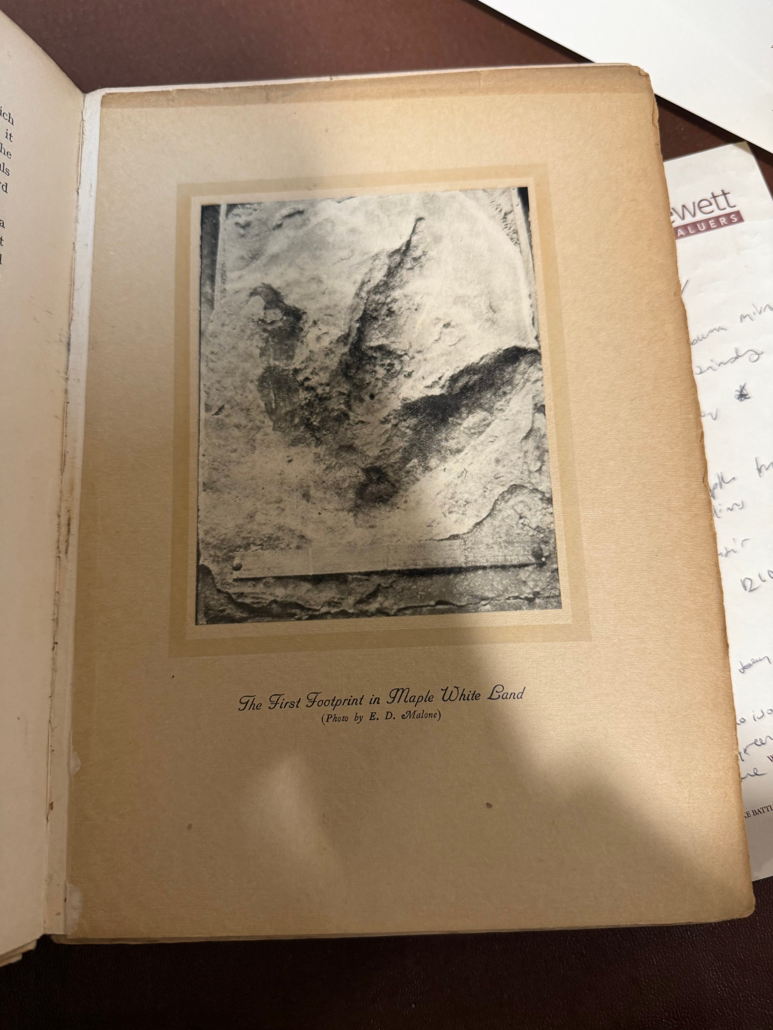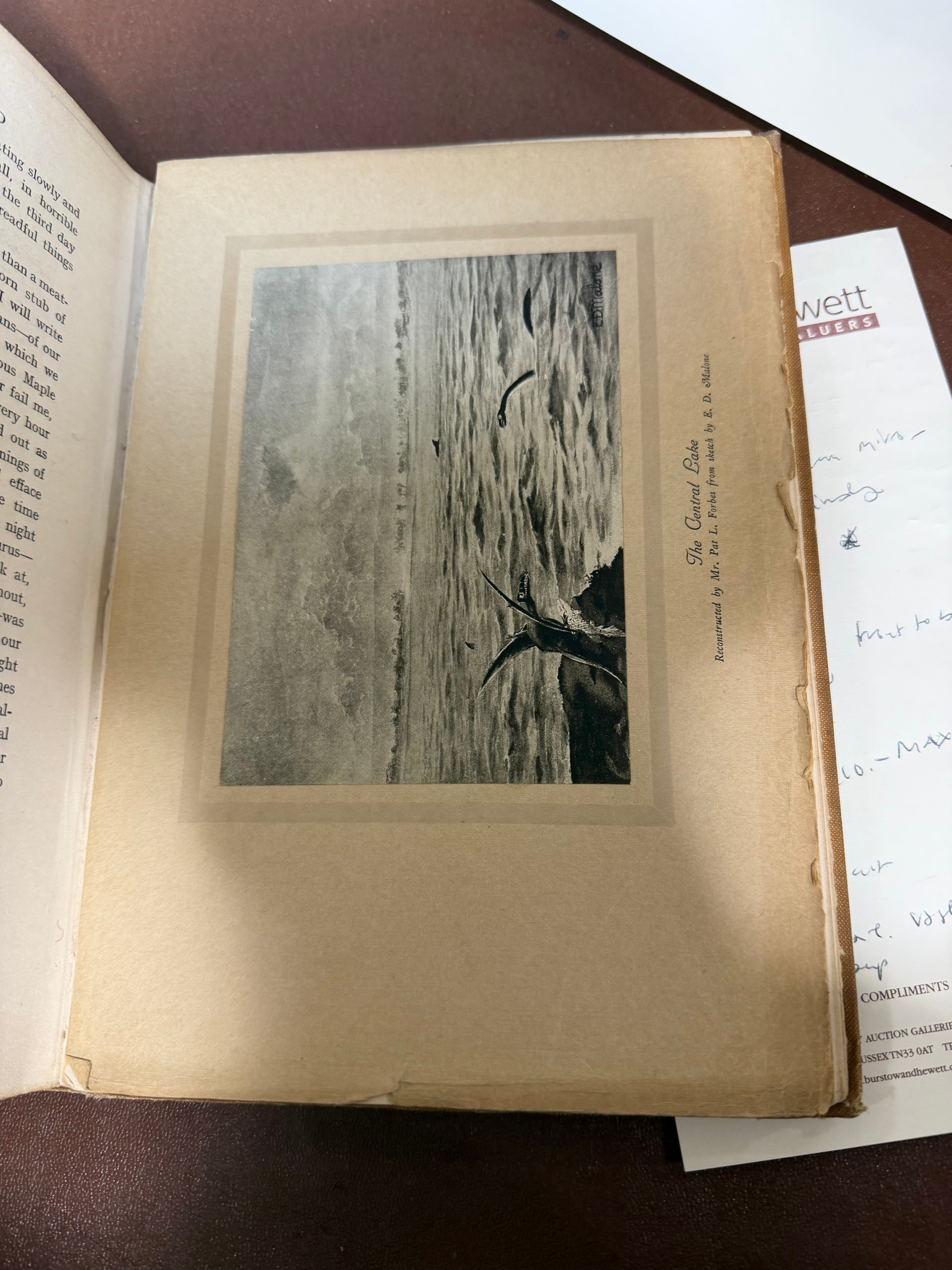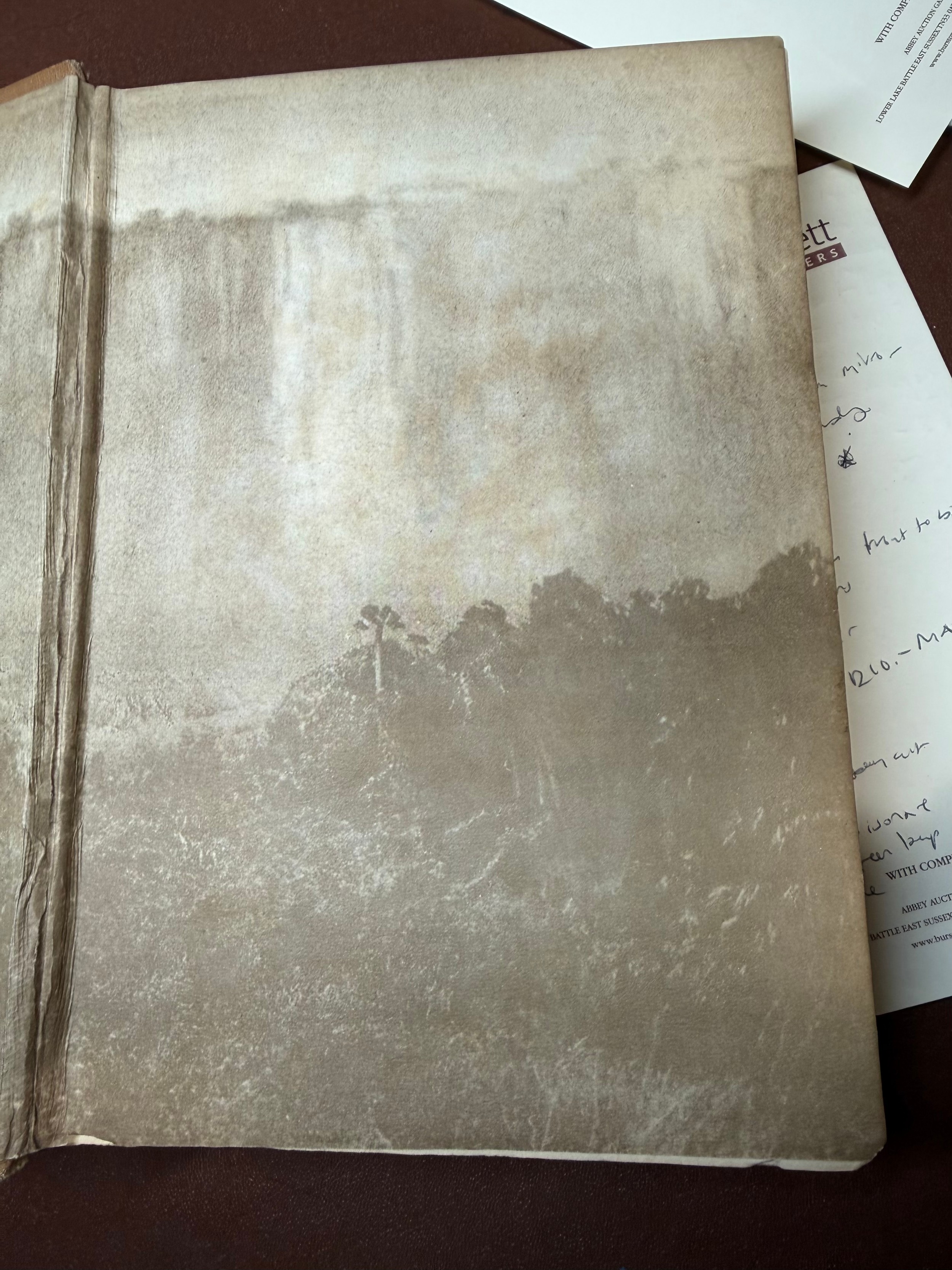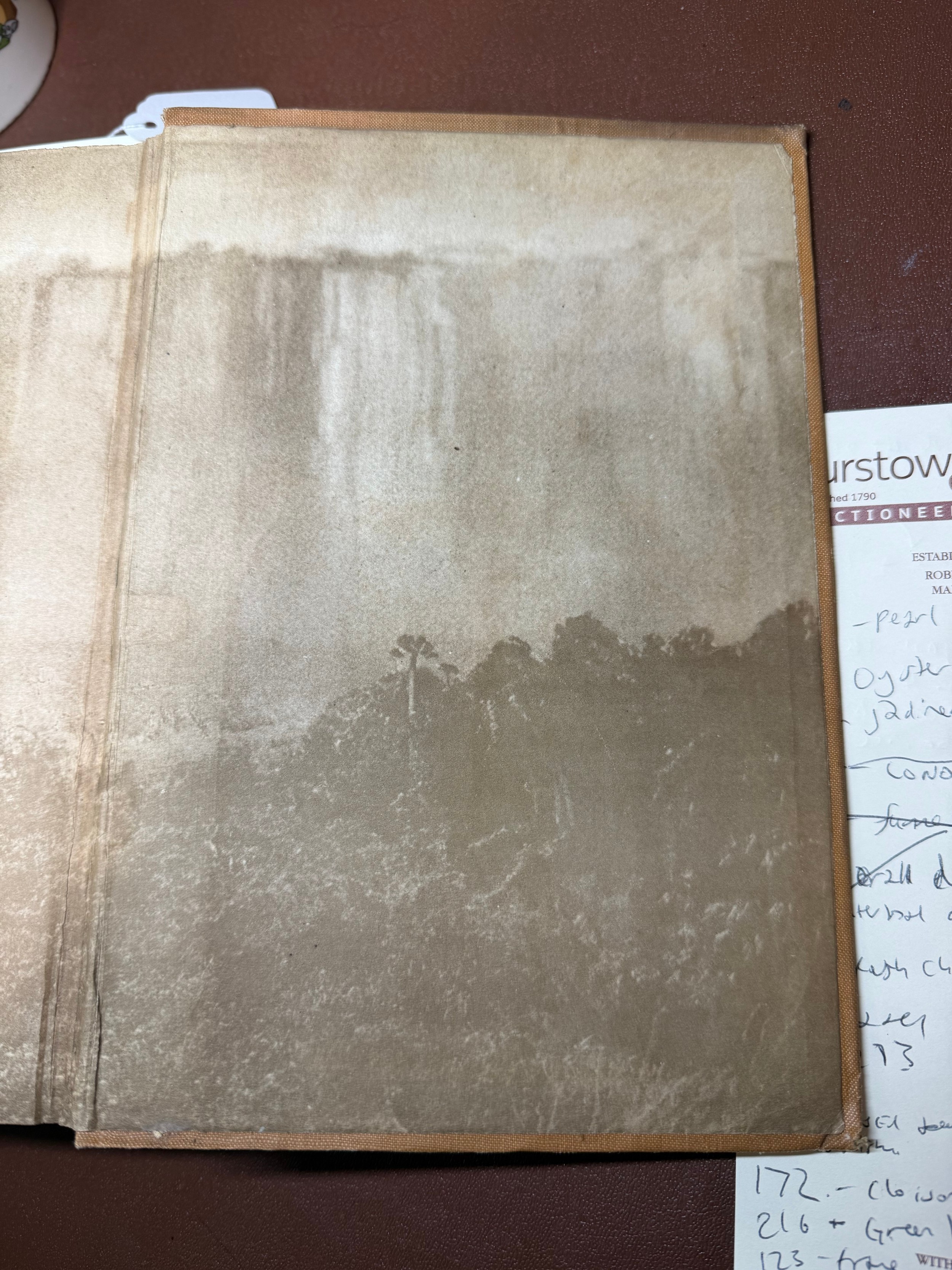 The Lost World, by Arthur Conan Doyle, pub. Henry Frowde, Hodder and Stoughton, n.d. 1914?. The first UK edition, second issue, large paper copy. Distinctive brown cloth stamped with a dinosaur footprint, base of the spine reads 'Milford'. Milford refers to Humphrey Milford of the OUP, who took over the distribution of remaindered stock from Hodder (though the original publisher's name remains on the title page). This edition is prized for it's distinctive binding. Frontispiece and 12 mounted plates (complete), some coloured. Doyle himself posed for the illustrations of Professor Challenger.