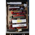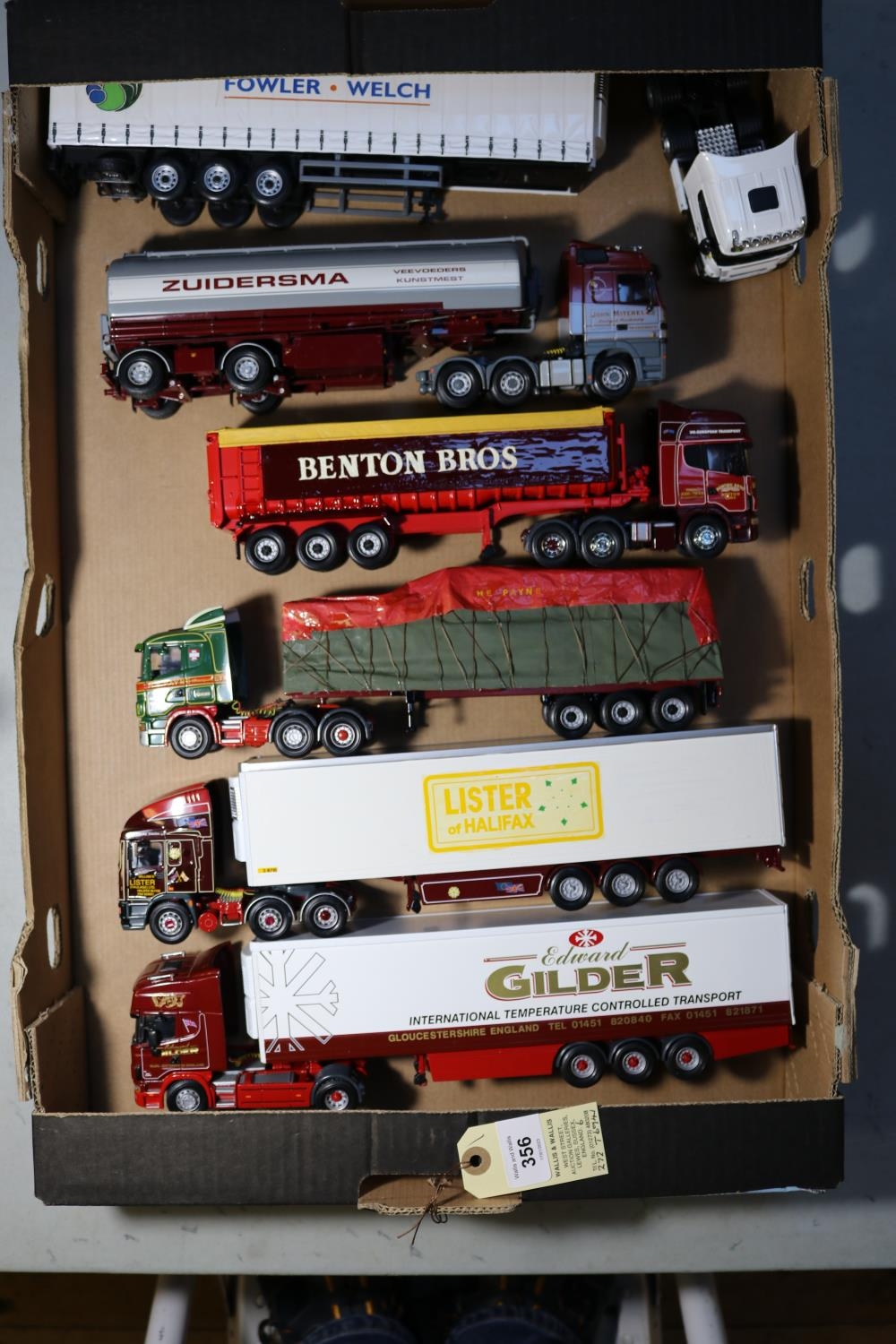 6 Corgi Trucks. Ex-Display Models. ERF EC10 Tractor Unit, with a Reefer box semi-trailer. In Lister, Halifax livery. A Scania 144L Tractor Unit, with a Reefer box semi-trailer. In Edward Gilder livery. A Scania R620 Tractor Unit, with a Reefer curtainside semi-trailer. In Fowler Welch livery. A Mercedes-Benz Actros Tractor Unit, with a tanker semi-trailer. In John Mitchell/Zuidersma livery. A Scania 124L Tractor Unit, with a 3-axle top-loading grain carrier. In Benton Bros livery. A Scania 124L Tractor Unit with a flatbed semi-trailer and sheeted load. In H.E.Payne livery. GC-VGC, but a few items including mirrors may be damaged/missing. Some vehicles nicely adapted/adjusted. £70-90