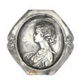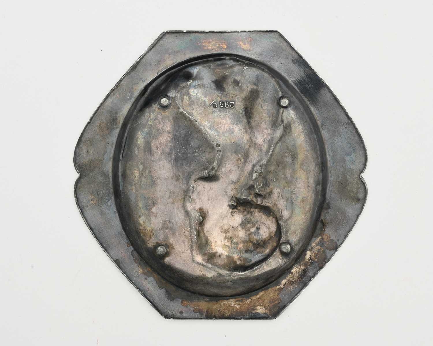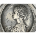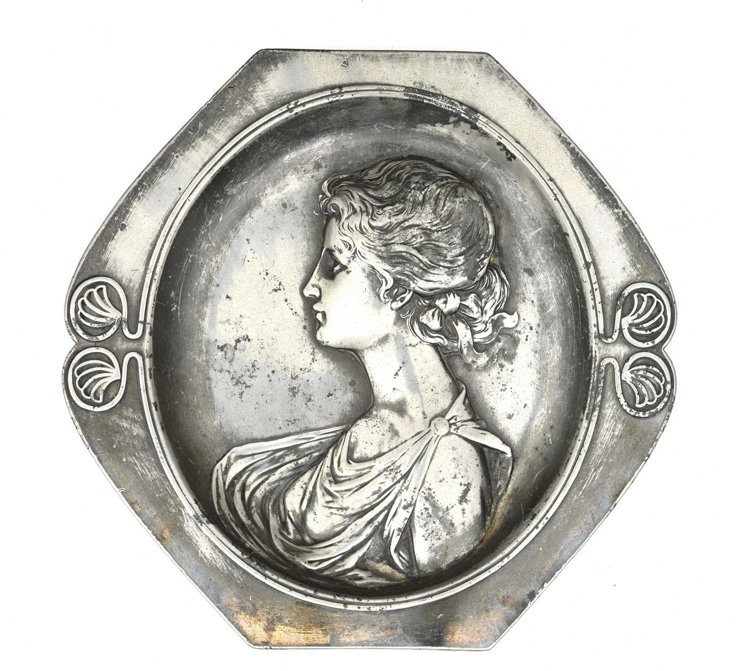 WMF, a Jugendstil silver plated charger, model 295a, oval hexagonal from, relief moulded with a profile bust of a maiden, within a border of whiplash tendrils, 19cm diameter