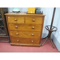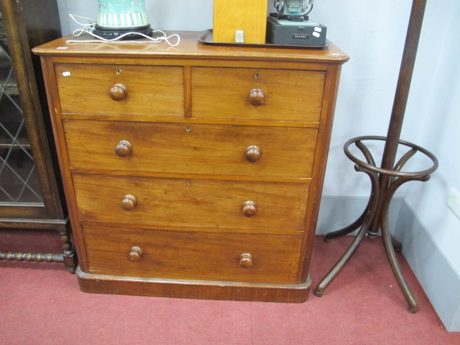 A XIX Century Mahogany Chest, of two small and three long graduated drawers, having turned knobs and curved corners, on plinth base, 106cm wide.