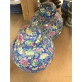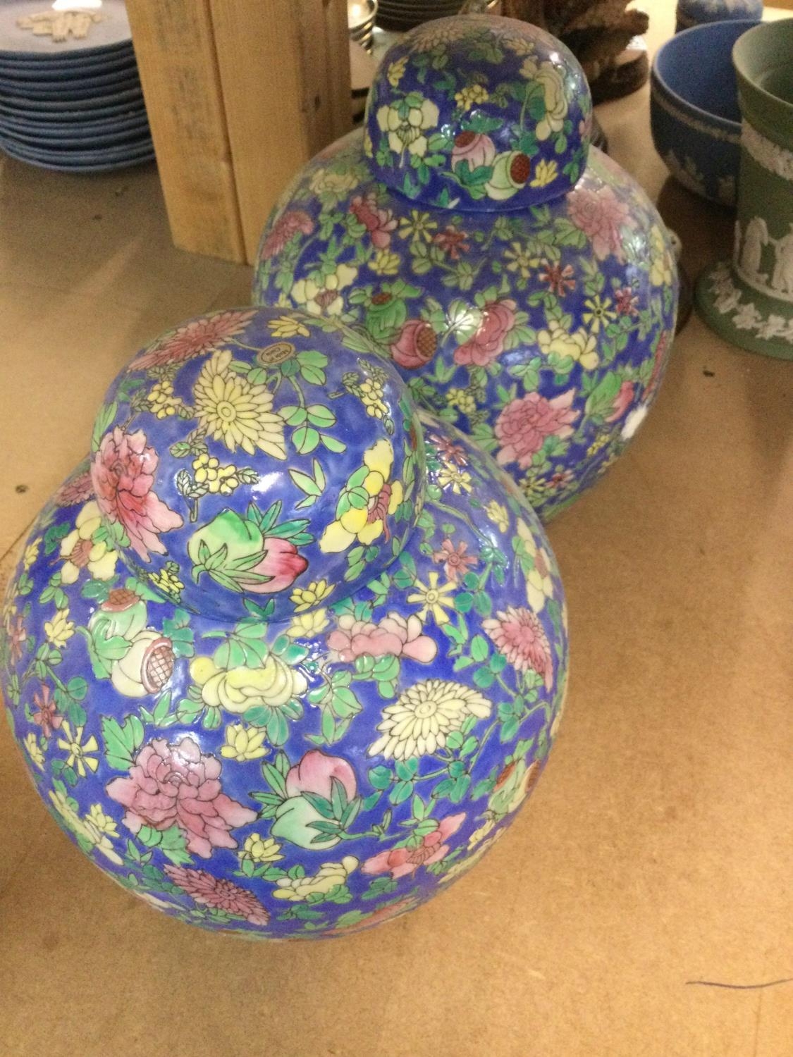 A pair of reproduction ginger jars with floral decorations.