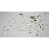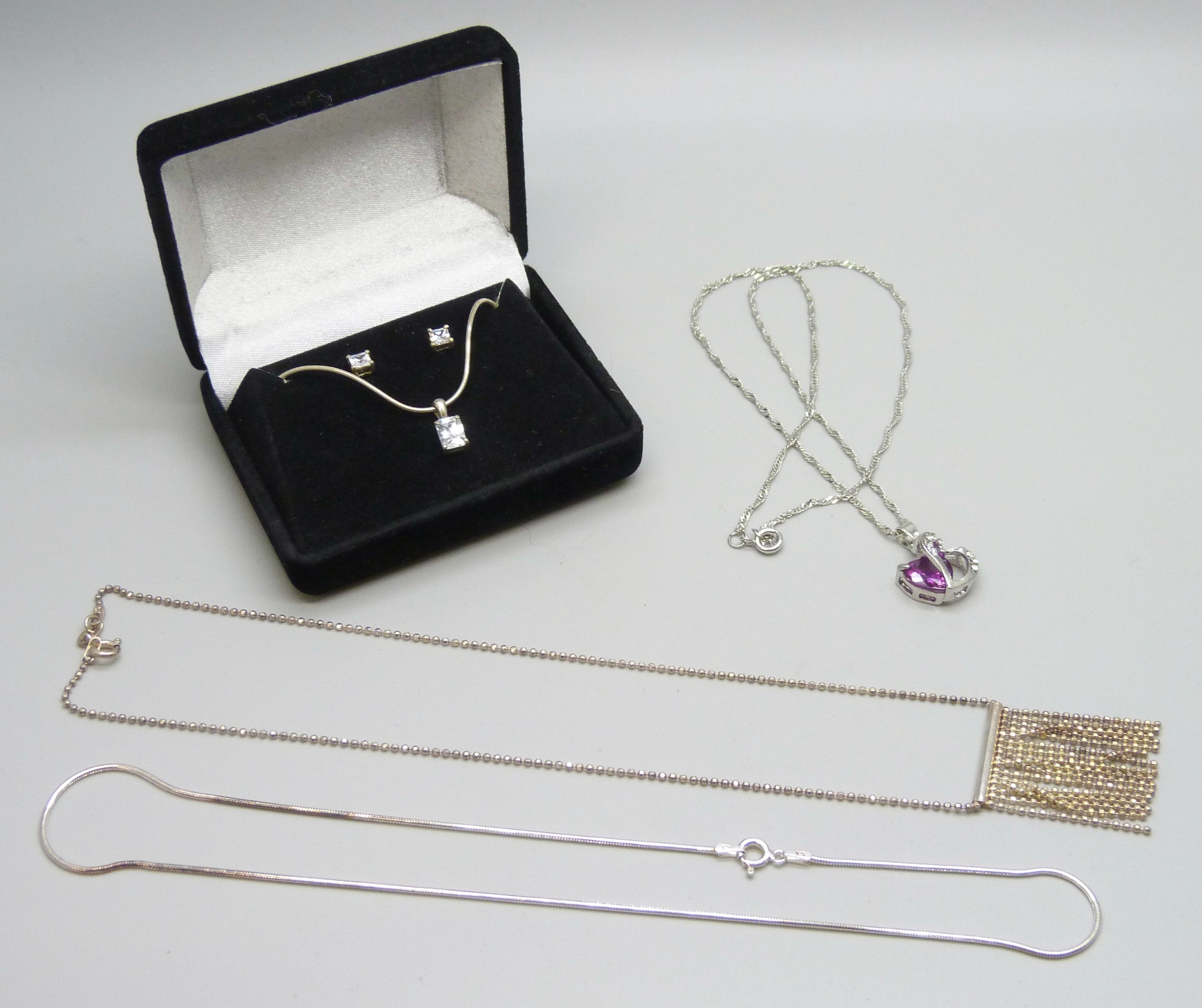 Two silver chains, a plated heart pendant on a plated chain, and a pair of silver earrings and a silver pendant on a silver chain
