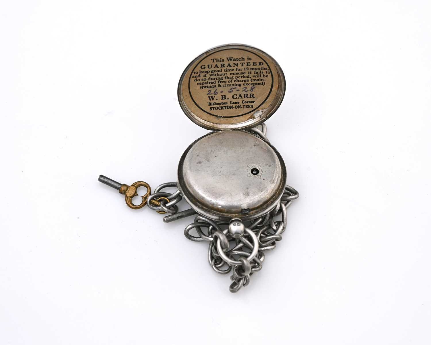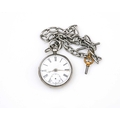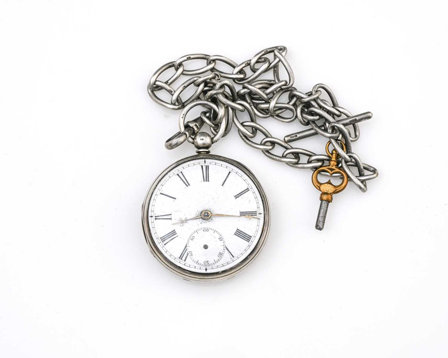 A Victorian silver open-faced pocket watch on silver chain, white enamelled dial and subsidiary seconds dial, 5cm diameter