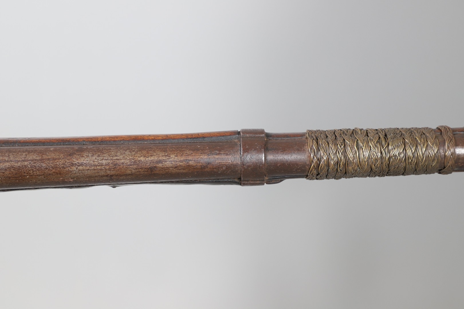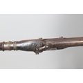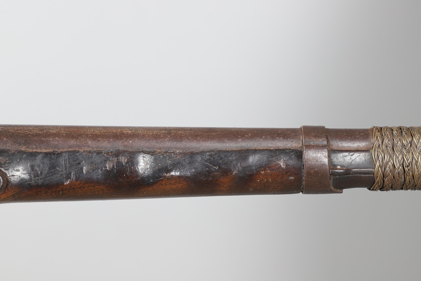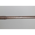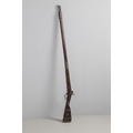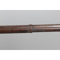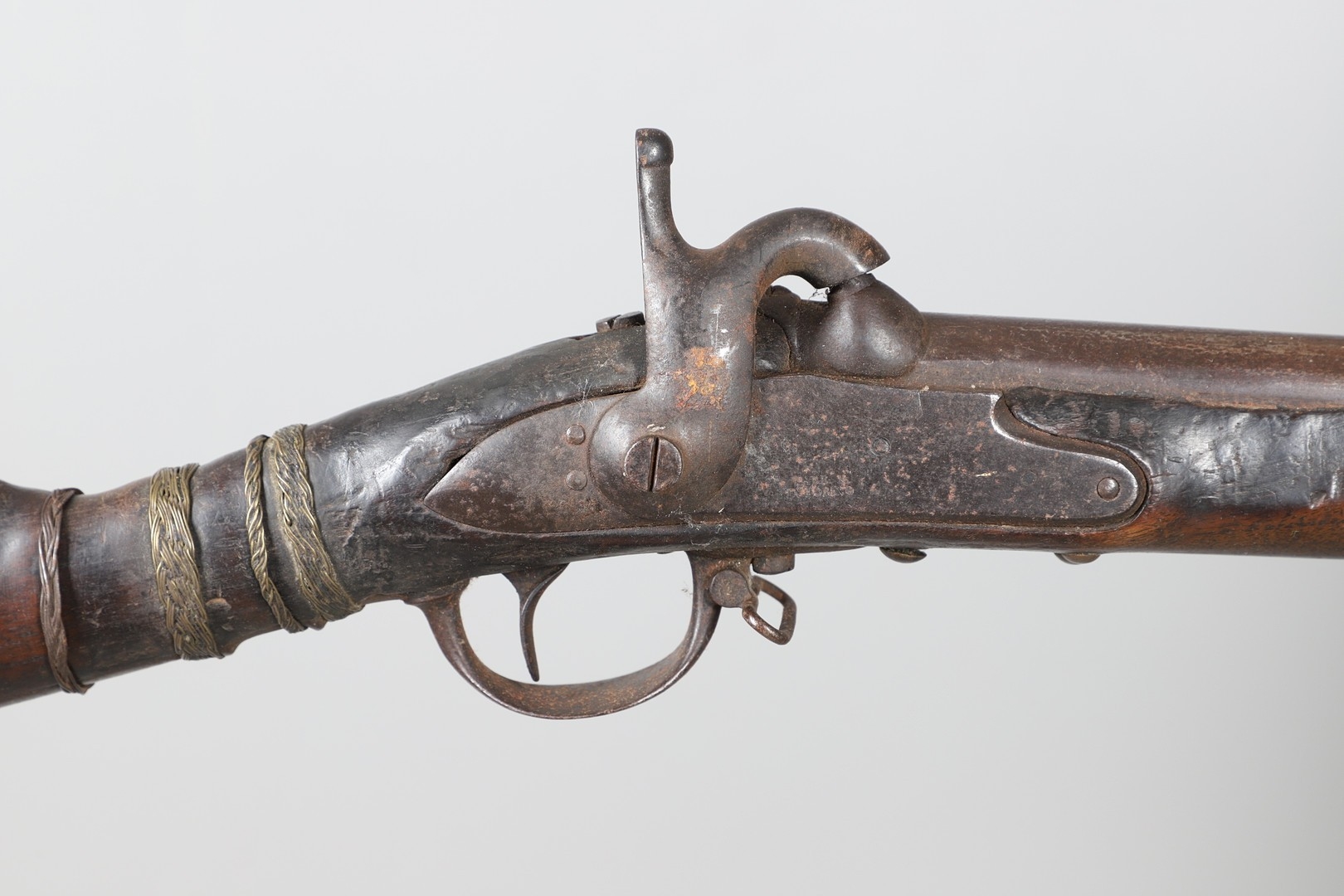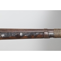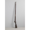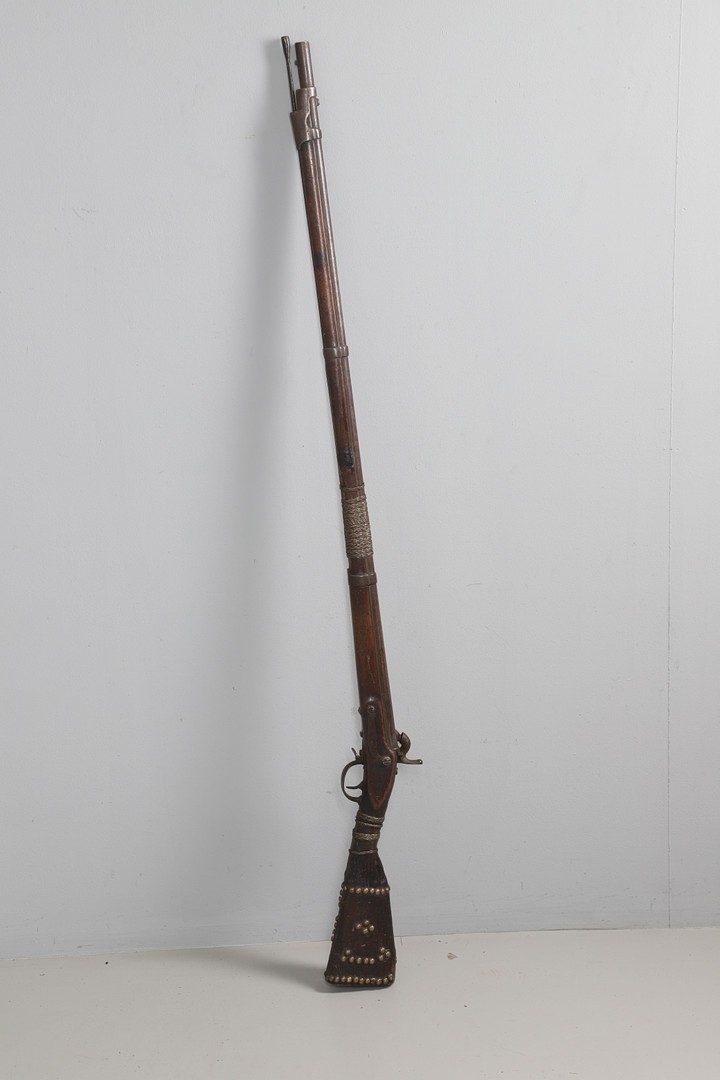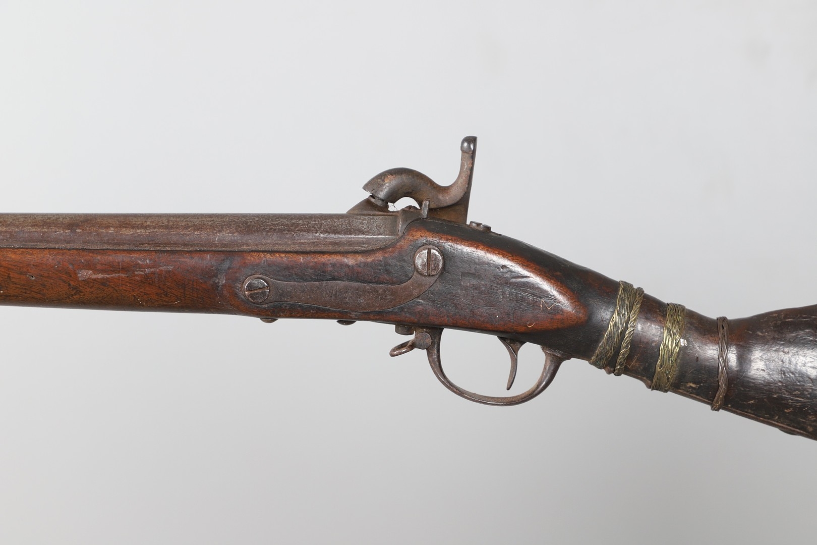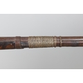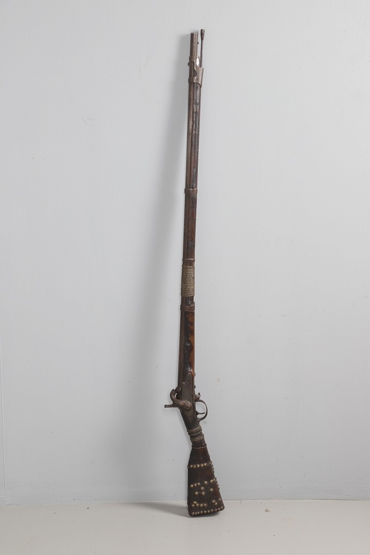 A PERCUSSION FIRING MUSKET WITH DECORATIVE SOUTH AFRICAN ORNAMENT. The 111 cm tapering barrel with proof marks or manufacturers marks towards the stock and ram rod below. With percussion firing action, the side plate marked possibly 'A A FABB R IN TORINO', With single sling mounting point. The barrel and stock with additional round-headed nail and woven brass wire decoration suggesting adaptation by South African Tribal people. 150 cm. "This smooth bore musket appears to have been in the ownership of a South African tribal people; the brass wire platting forming a large and decorative 'capucines' and the use of brass upholstery studs, as seen on the shafts of knobkerries, would possibly point to the Zulu tribal area. The style is mid 19th century European military issue.".