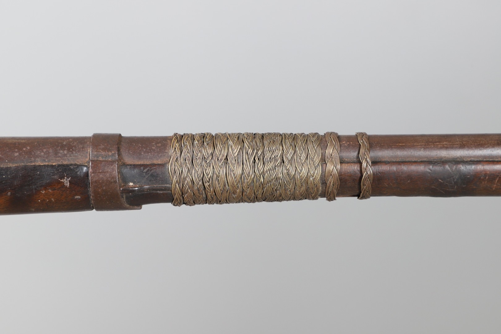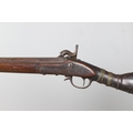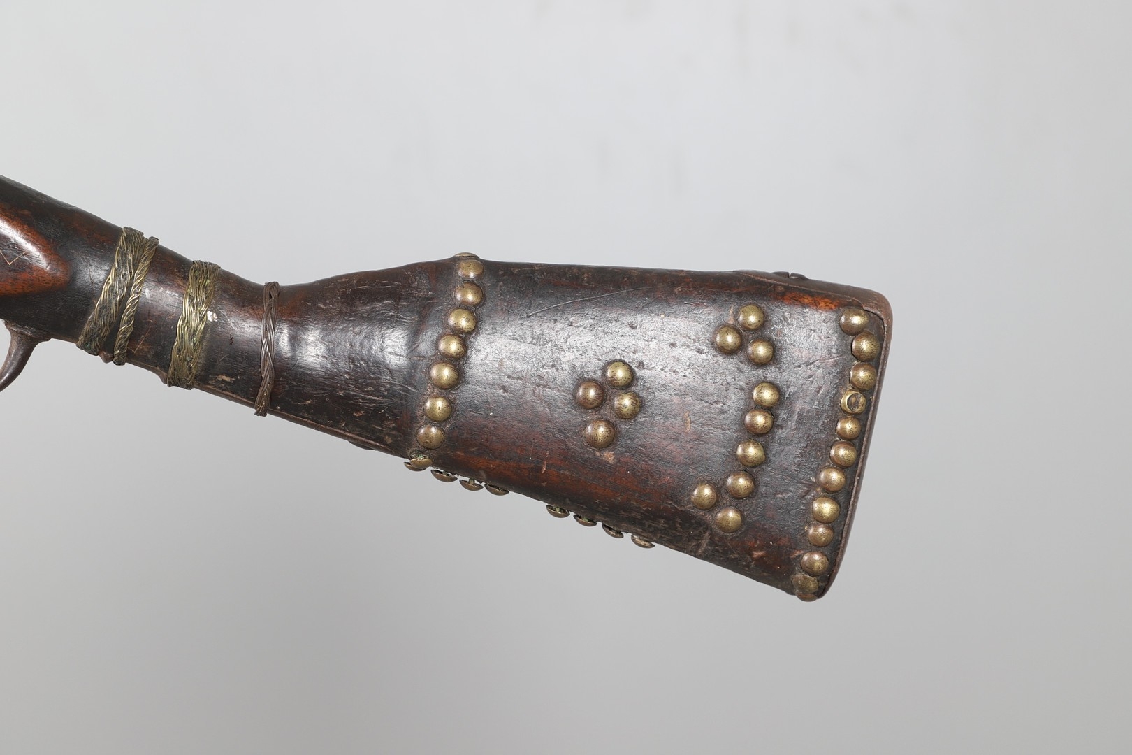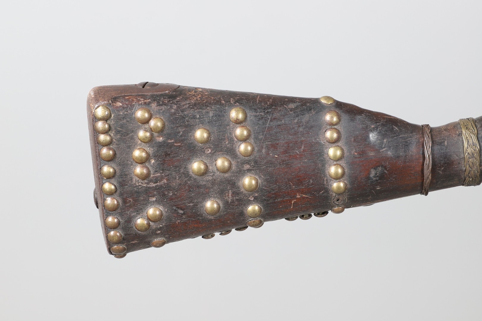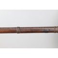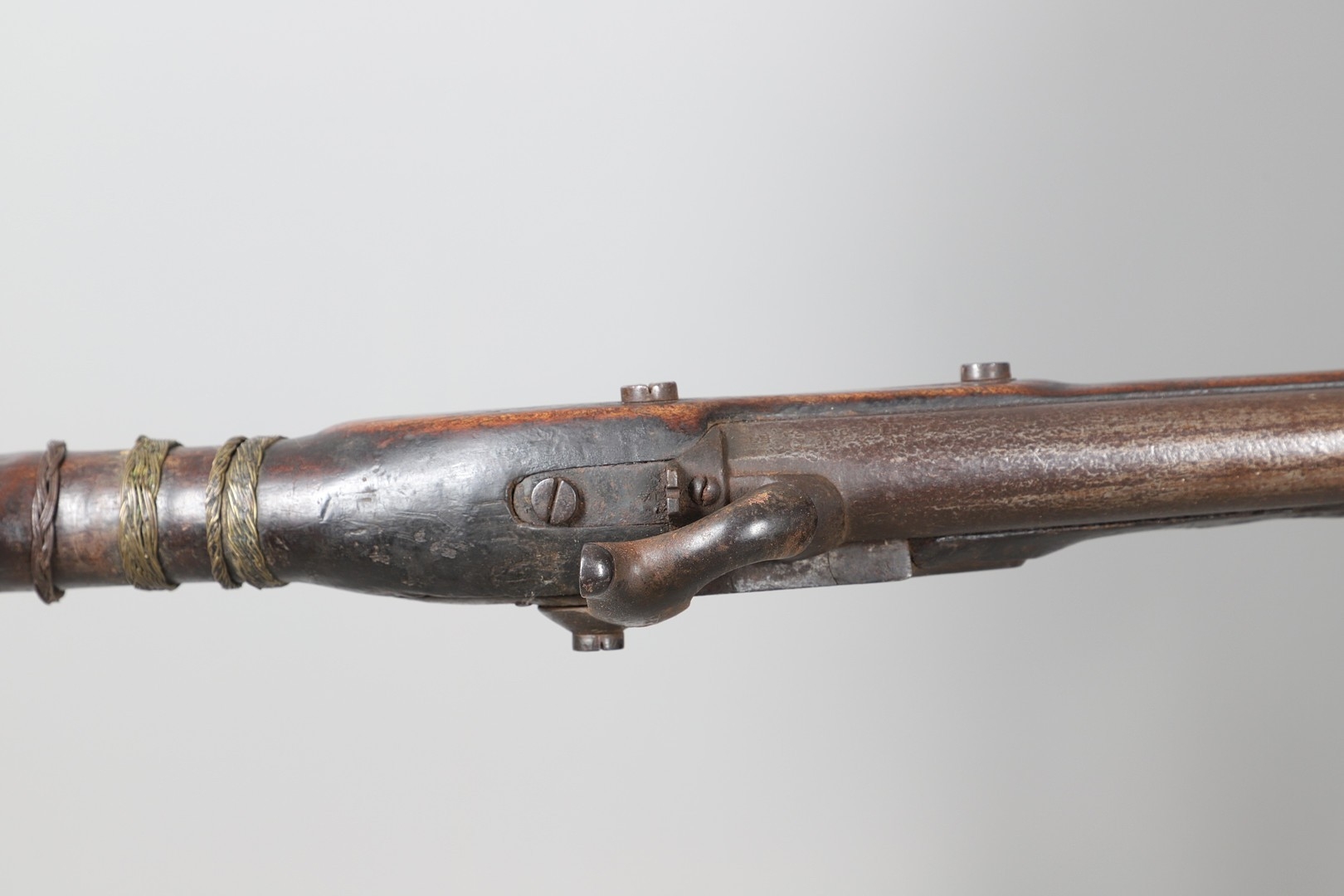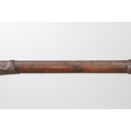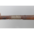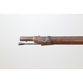 A PERCUSSION FIRING MUSKET WITH DECORATIVE SOUTH AFRICAN ORNAMENT. The 111 cm tapering barrel with proof marks or manufacturers marks towards the stock and ram rod below. With percussion firing action, the side plate marked possibly 'A A FABB R IN TORINO', With single sling mounting point. The barrel and stock with additional round-headed nail and woven brass wire decoration suggesting adaptation by South African Tribal people. 150 cm. "This smooth bore musket appears to have been in the ownership of a South African tribal people; the brass wire platting forming a large and decorative 'capucines' and the use of brass upholstery studs, as seen on the shafts of knobkerries, would possibly point to the Zulu tribal area. The style is mid 19th century European military issue.".