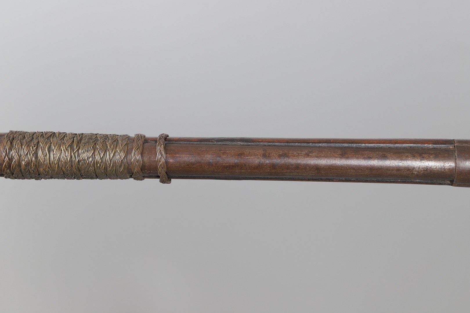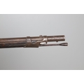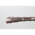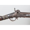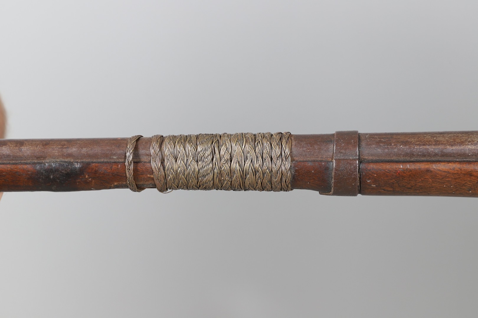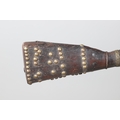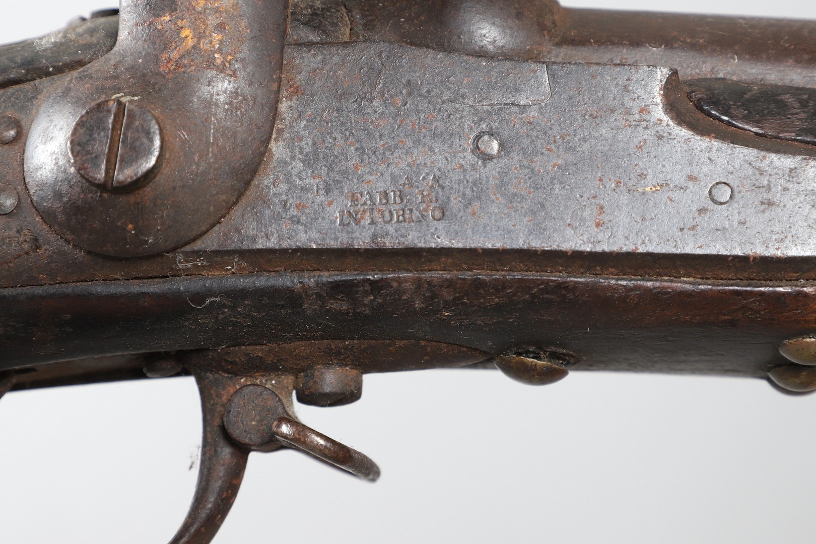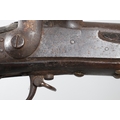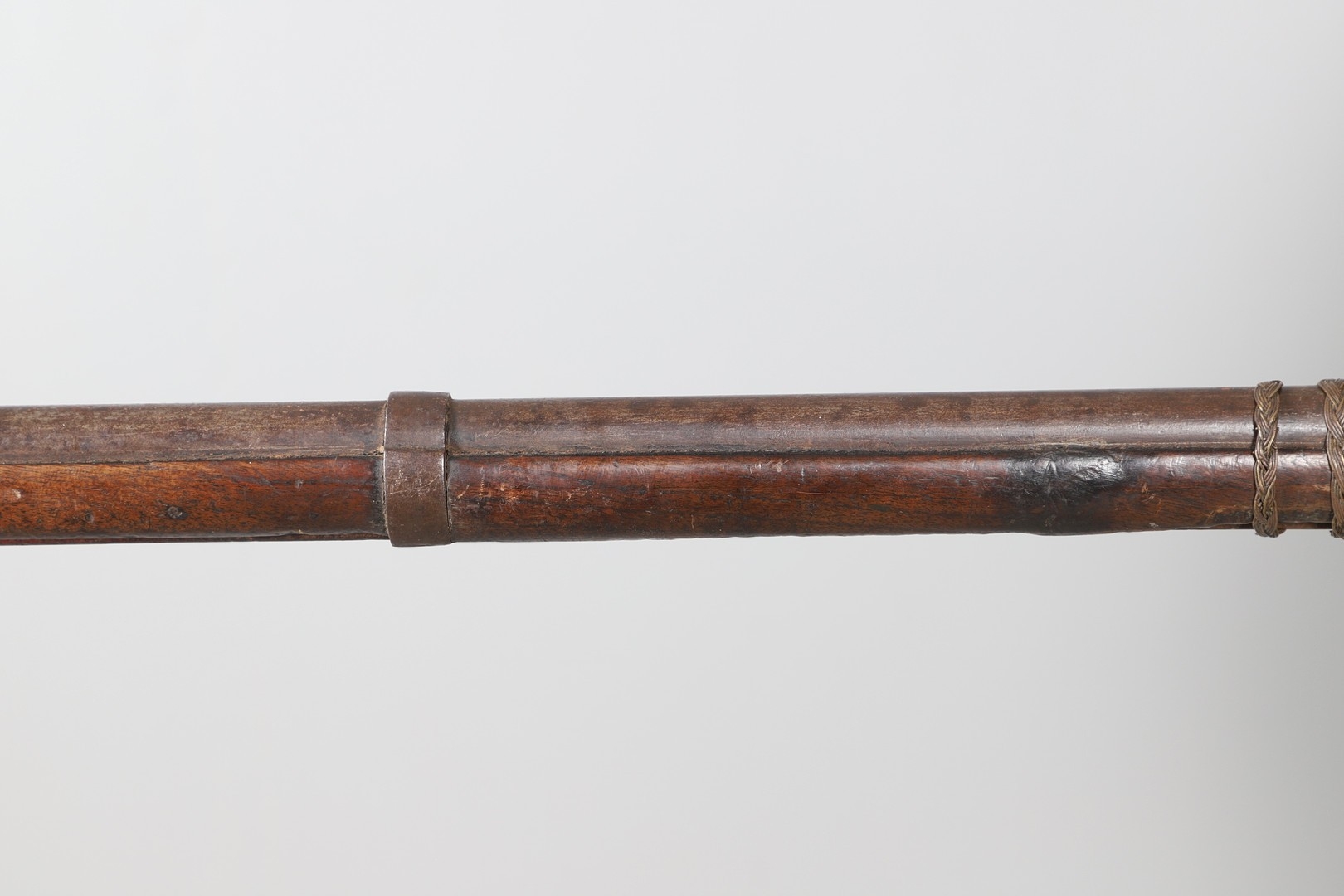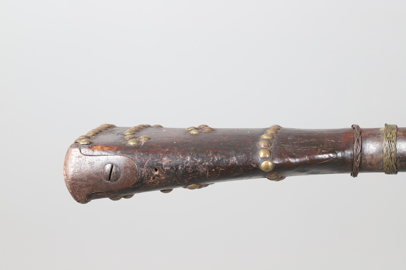 A PERCUSSION FIRING MUSKET WITH DECORATIVE SOUTH AFRICAN ORNAMENT. The 111 cm tapering barrel with proof marks or manufacturers marks towards the stock and ram rod below. With percussion firing action, the side plate marked possibly 'A A FABB R IN TORINO', With single sling mounting point. The barrel and stock with additional round-headed nail and woven brass wire decoration suggesting adaptation by South African Tribal people. 150 cm. "This smooth bore musket appears to have been in the ownership of a South African tribal people; the brass wire platting forming a large and decorative 'capucines' and the use of brass upholstery studs, as seen on the shafts of knobkerries, would possibly point to the Zulu tribal area. The style is mid 19th century European military issue.".