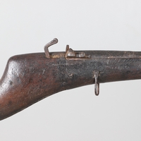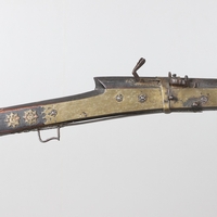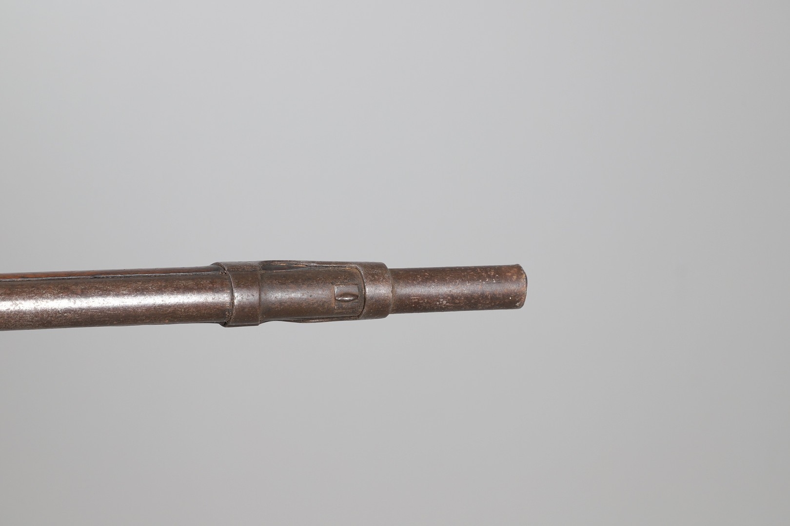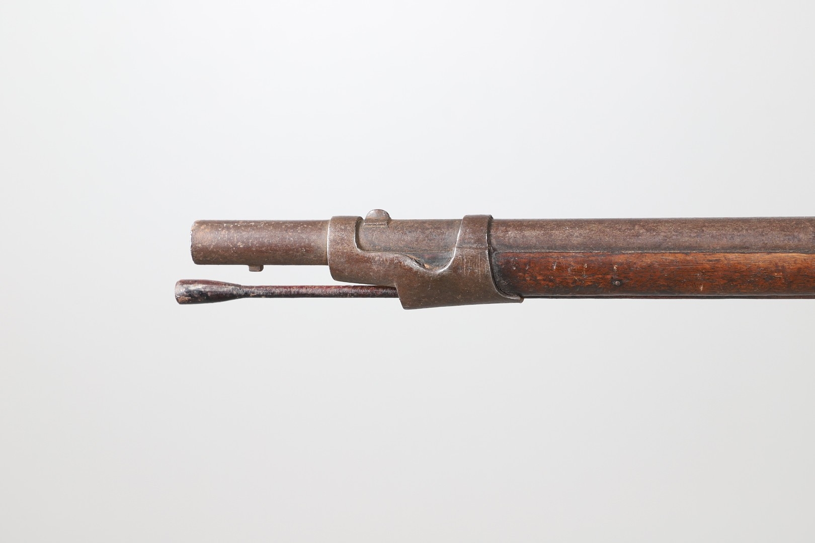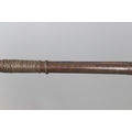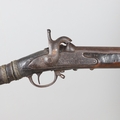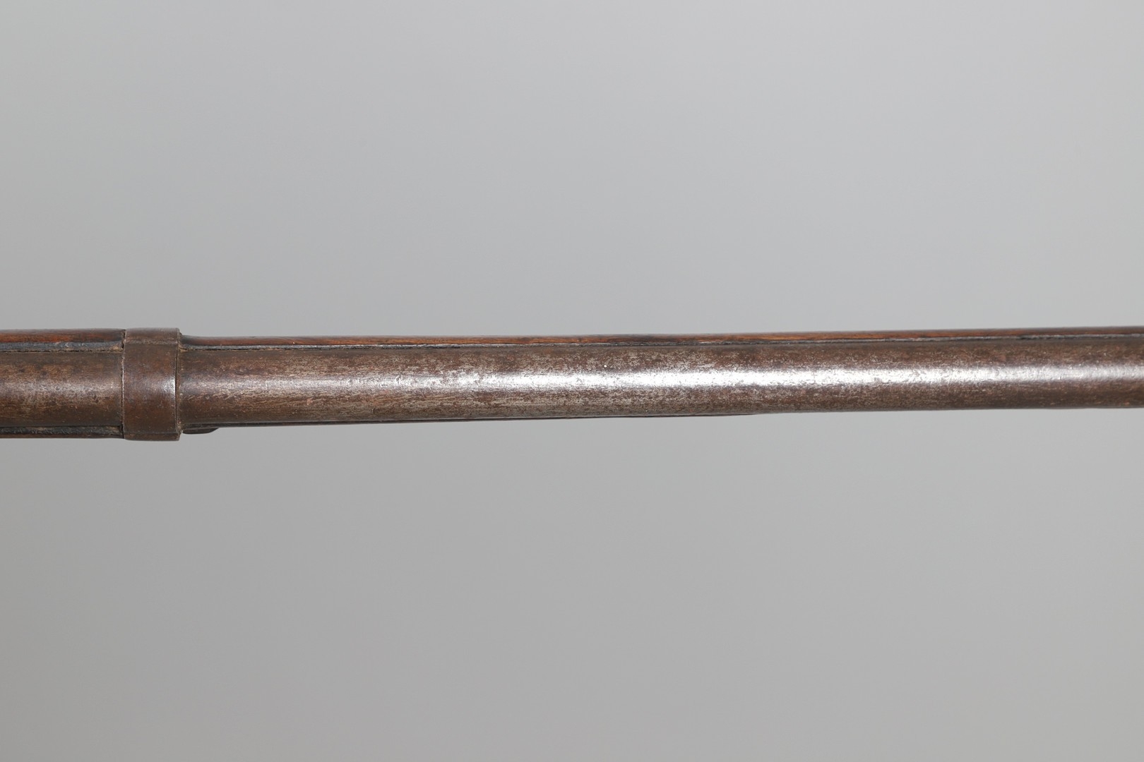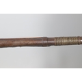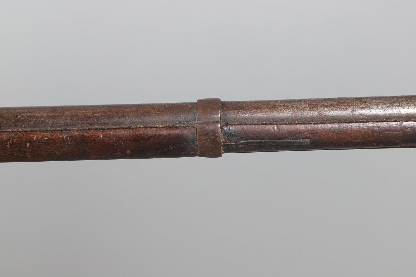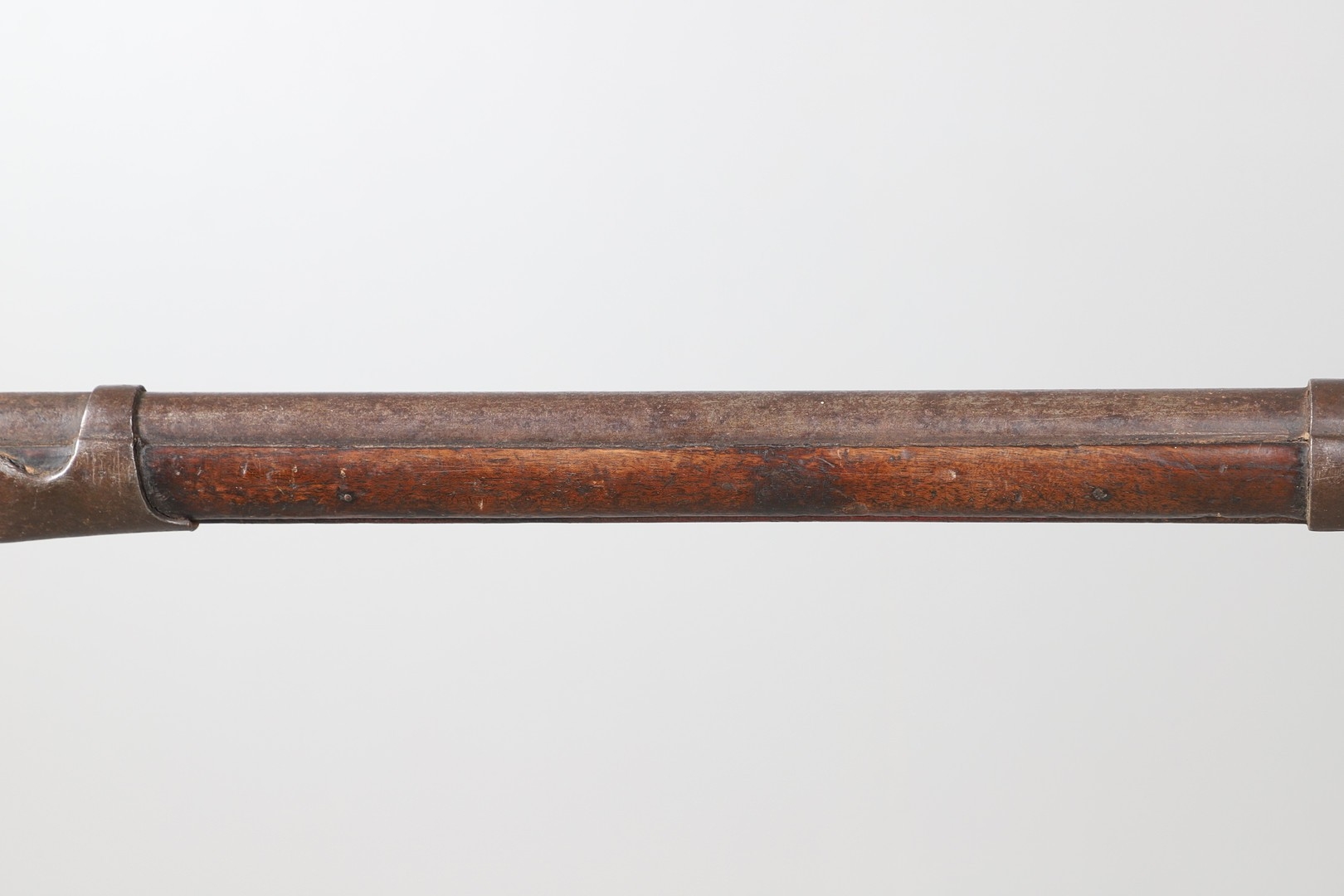 A PERCUSSION FIRING MUSKET WITH DECORATIVE SOUTH AFRICAN ORNAMENT. The 111 cm tapering barrel with proof marks or manufacturers marks towards the stock and ram rod below. With percussion firing action, the side plate marked possibly 'A A FABB R IN TORINO', With single sling mounting point. The barrel and stock with additional round-headed nail and woven brass wire decoration suggesting adaptation by South African Tribal people. 150 cm. "This smooth bore musket appears to have been in the ownership of a South African tribal people; the brass wire platting forming a large and decorative 'capucines' and the use of brass upholstery studs, as seen on the shafts of knobkerries, would possibly point to the Zulu tribal area. The style is mid 19th century European military issue.".