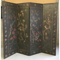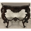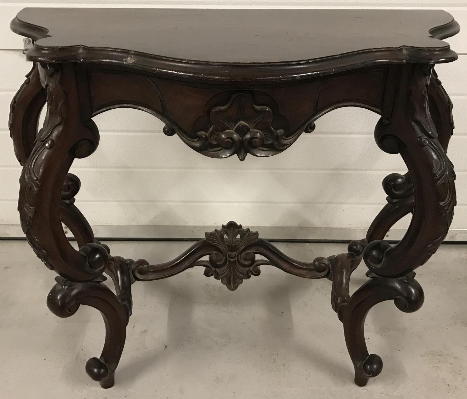 A dark wood decorative hall table with ornately carved legs and stretcher. With shaped top and front. Approx. 94cm wide x 79cm tall.