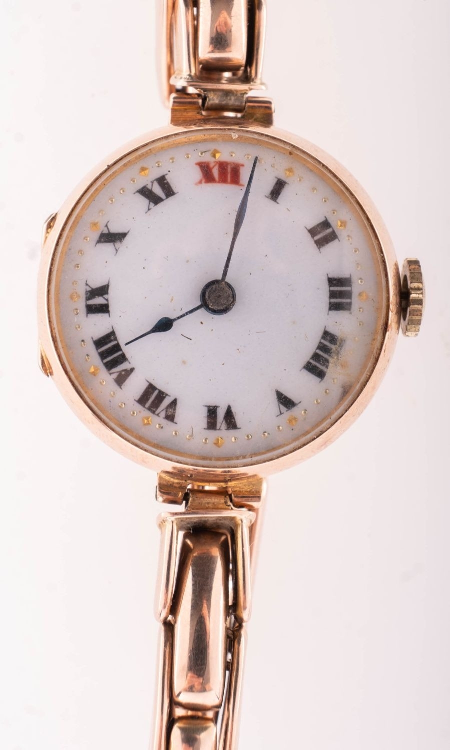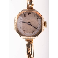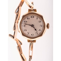 A 9K gold lady's wristwatch the round white dial having black and red Roman numerals and blued steel spade hands, the case stamped with 9K gold import marks and maker's initials D&R, the unsigned movement having a lever escapement and numbered 100445, the expandable bracelet marked 9K Regent, diameter 16mm, gross weight c.21.2gs