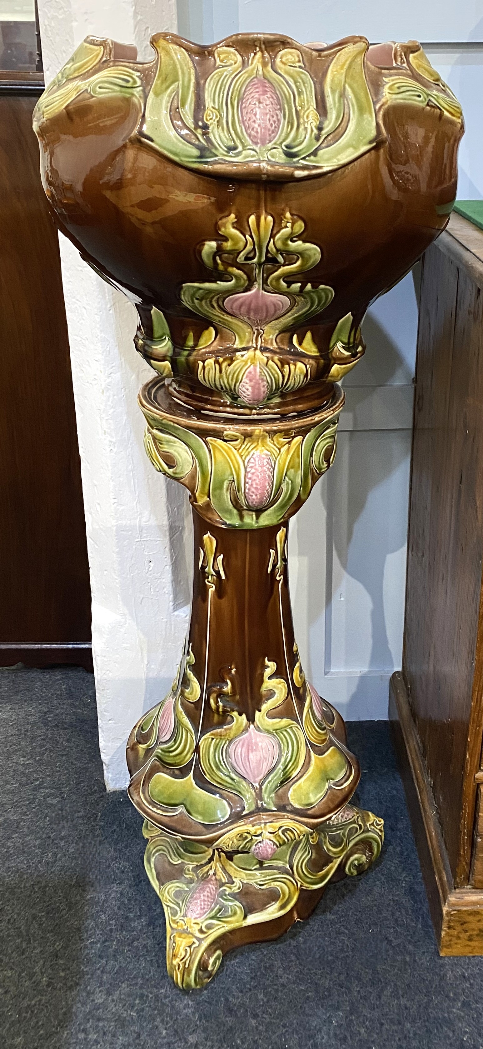 An Art Nouveau majolica jardiniere and stand, c.1900, modelled in bold relief and bold colours with stylised foliate and naturalistic motifs, underside marked 'Vulcan', combined height 110cm.