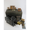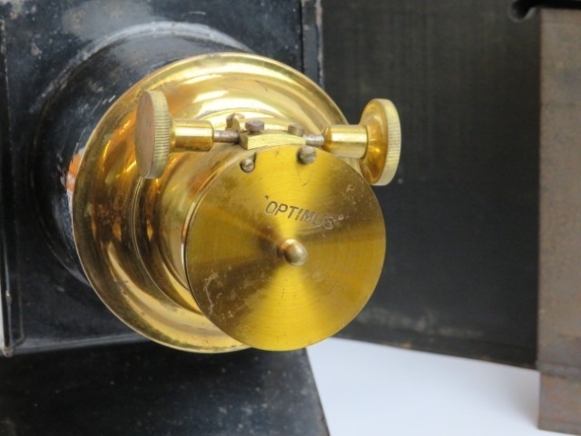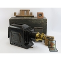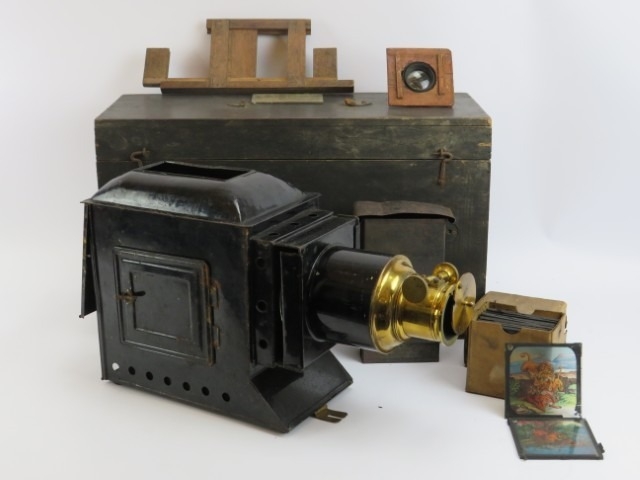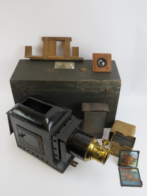 A Victorian ‘Optimus’ magic lantern projector probably by Perked Son & Co. Box of slides included. Case: 47.5 cm length.