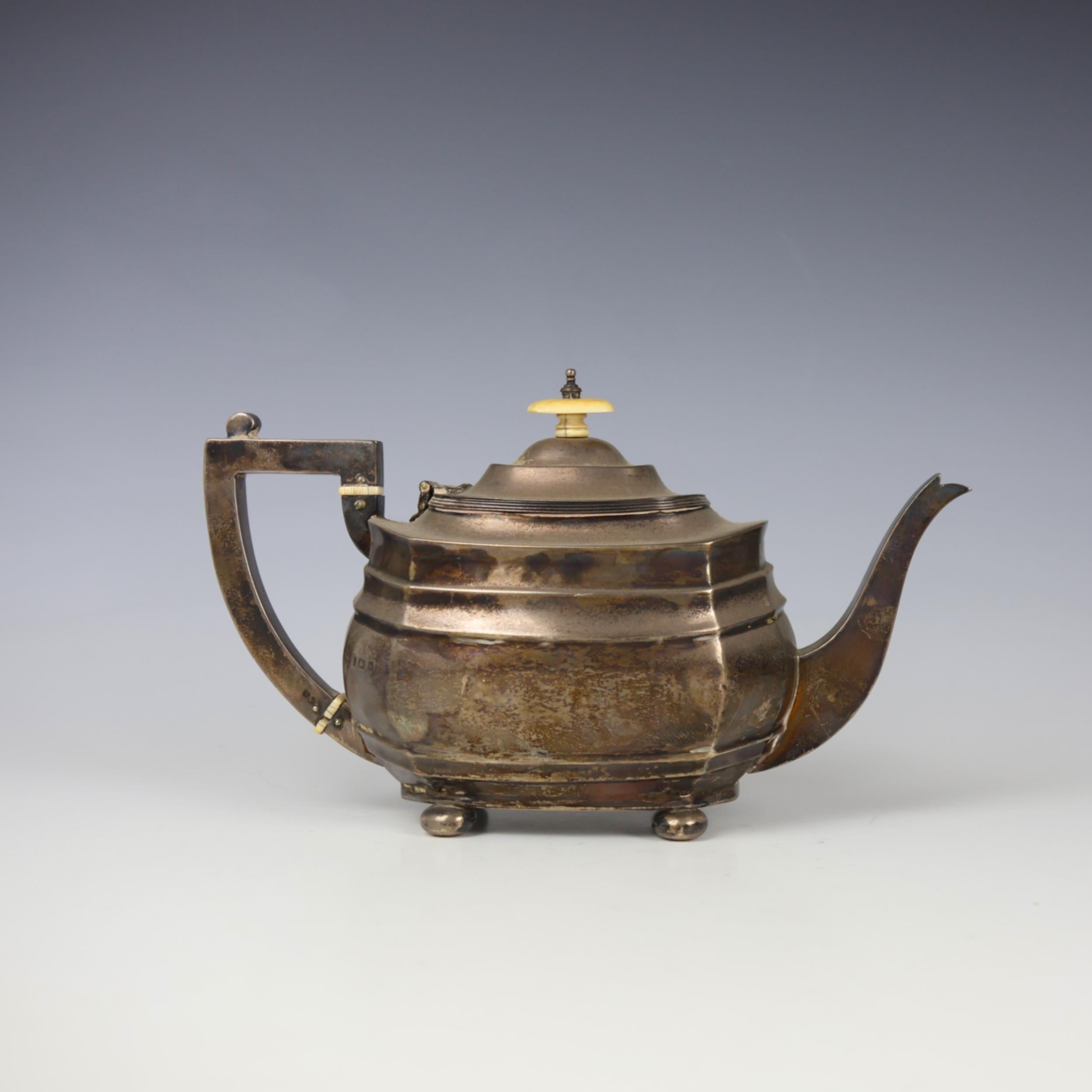 A George V silver teapot, S Blanckensee & Son Ltd, Birmingham 1917, the grooved cover above a hexagonally shaped body, upon four compressed bun feet, 16cm high, 18ozt