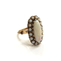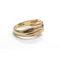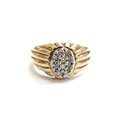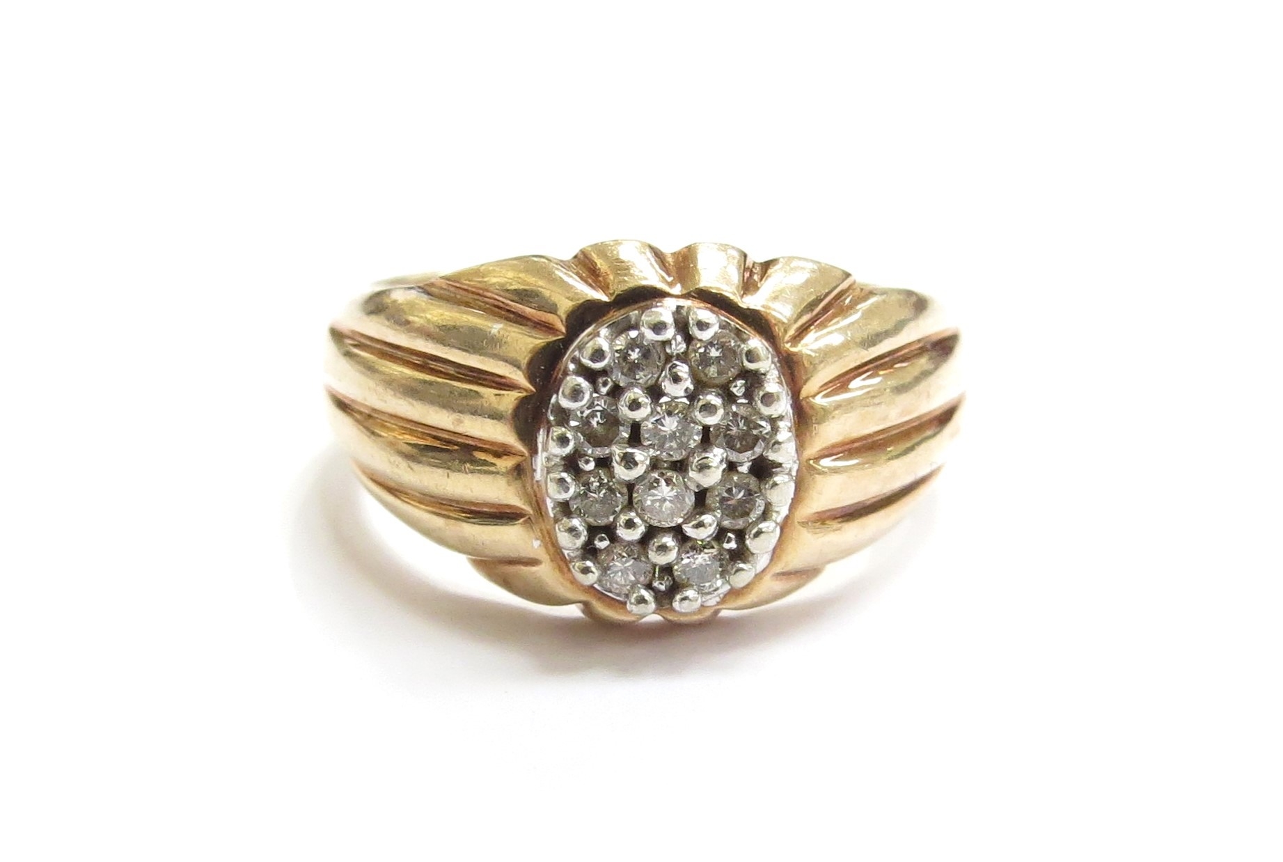 A 9ct gold ring with a cluster of diamonds to an oval centre, ribbed shoulders. Size U/V, 7.4g