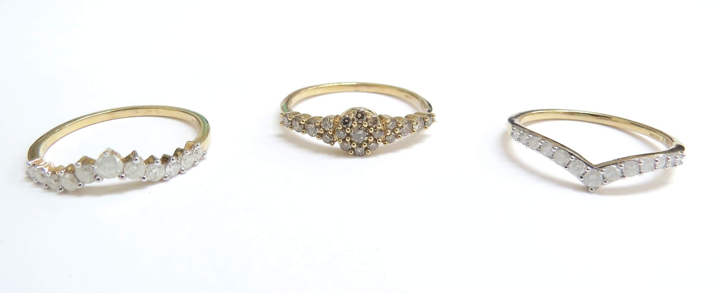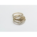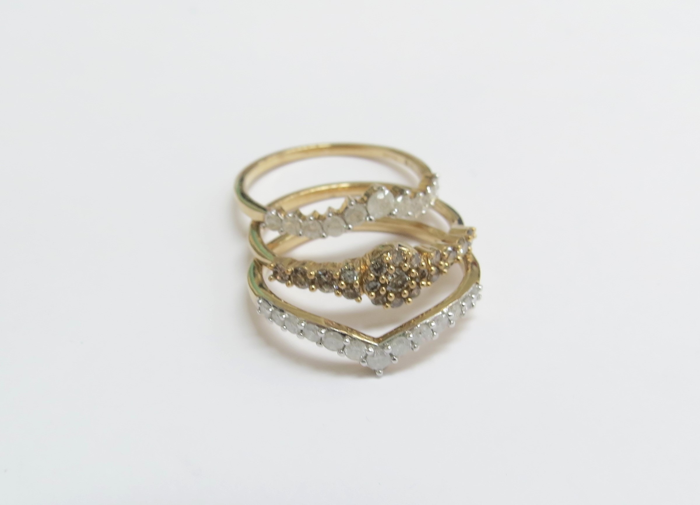 Three interlocking 9ct gold champagne and white diamond ring, 1ct total. Size N/O, 3.9g