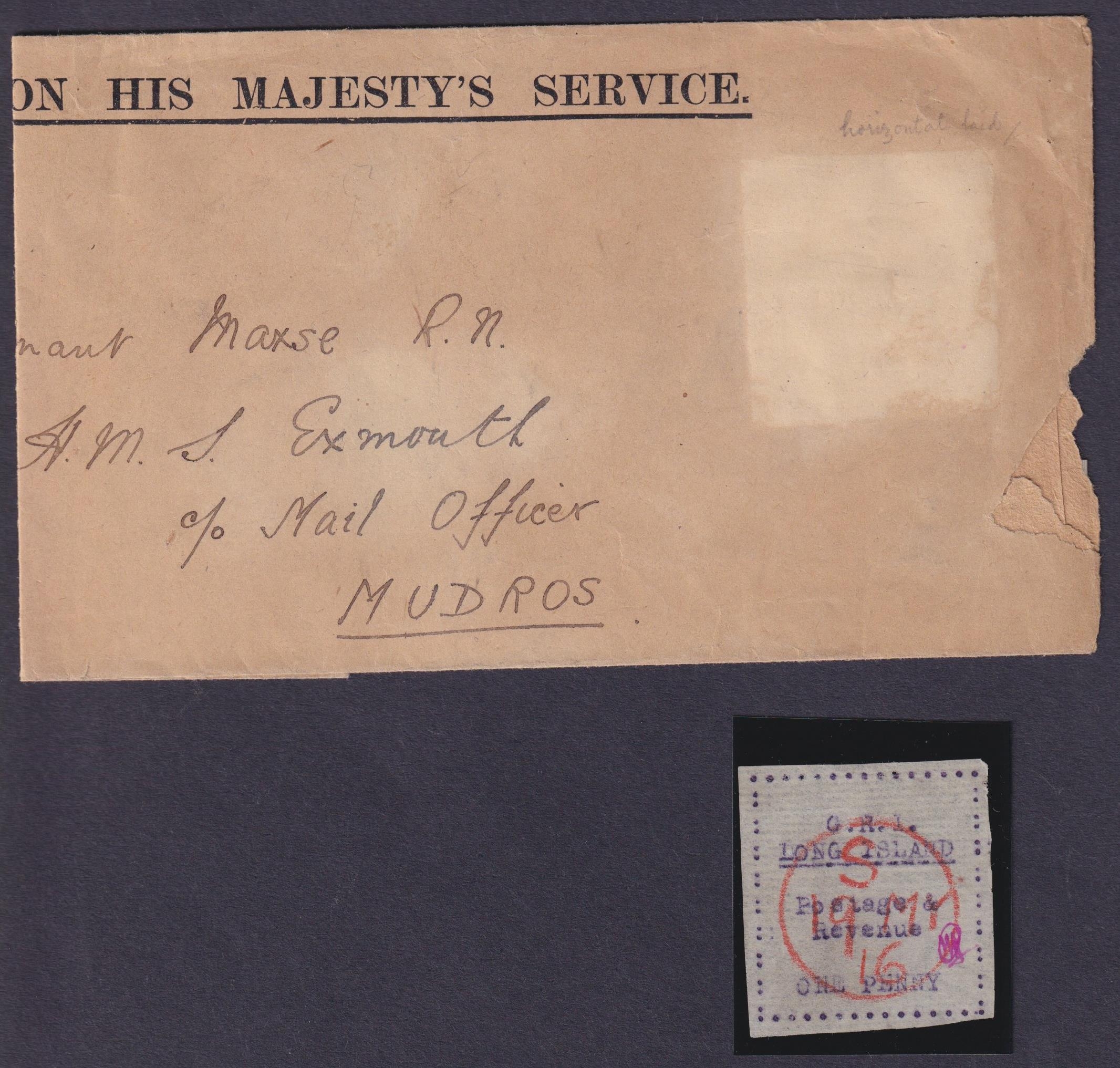 British Occupation: Long Island - Official ‘On His Majesty’s Service’ Fleet cover sent to Lieutenant Maxse R.N. Mail Office Mudros, with Typewritten 1d mauve (stamp detached from cover ), cancelled in red crayon with red ink initial, scarce cover