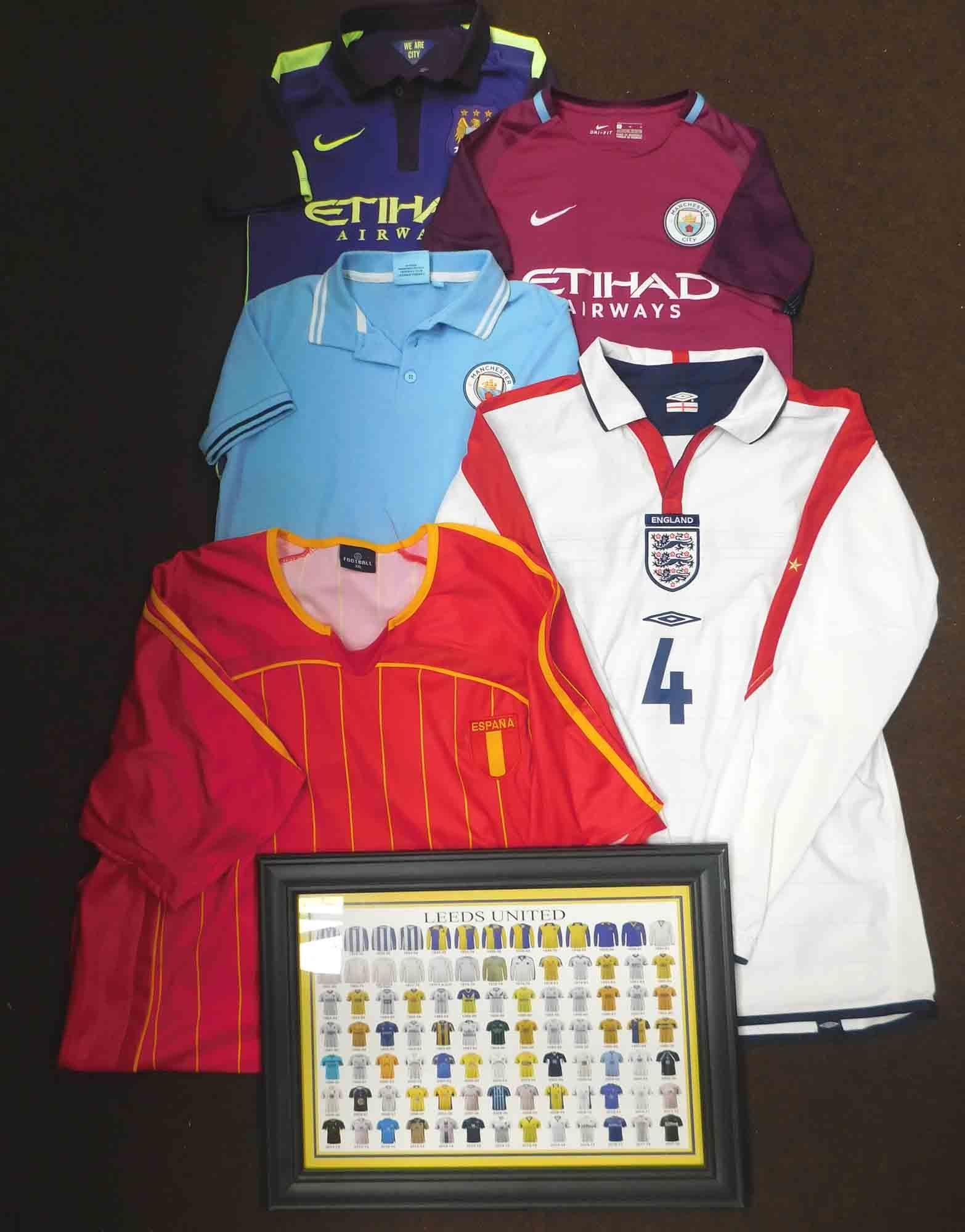 Five Football shirts - three Manchester City, Spain, England [Gerrard] & Leeds United 1920/2018 shirt framed print