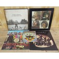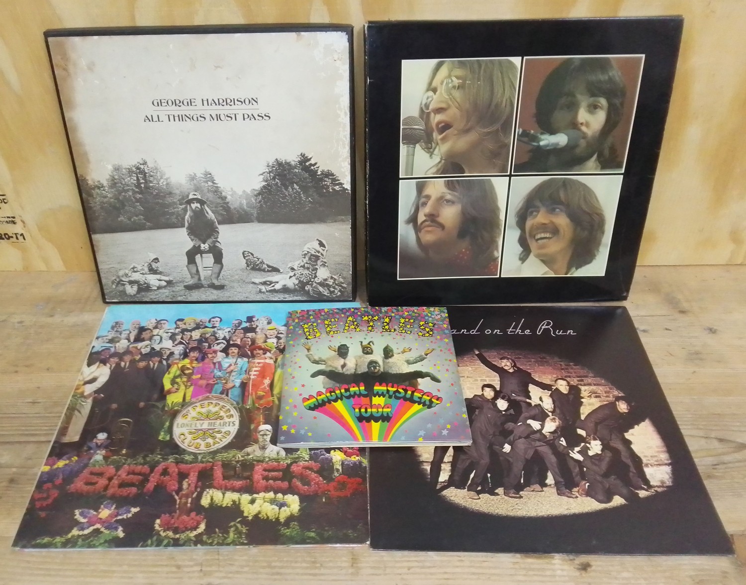 The Beatles and associated, five LPs and an EP; George Harrison All Things Must Pass, Let It Be Box Set (missing record), Band on The Run, Sgt. Peppers and Magical Mystery Tour.