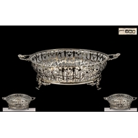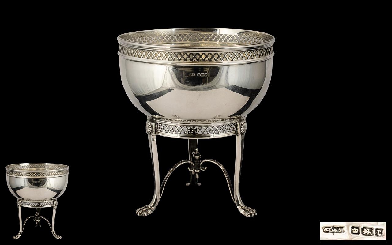 Arts & Crafts Design Superb Quality Sterling Silver Bowl. Open worked borders, raised on a trio of legs with styalised stretchers and lion's paw feet below. Hallmark Sheffield 1909. Maker's mark J. D. & Sons, James Deakin & Sons. Height 5.5'' - 13.75 cm. 285.3 grams. All aspects of condition excellent. Please confirm with photo.