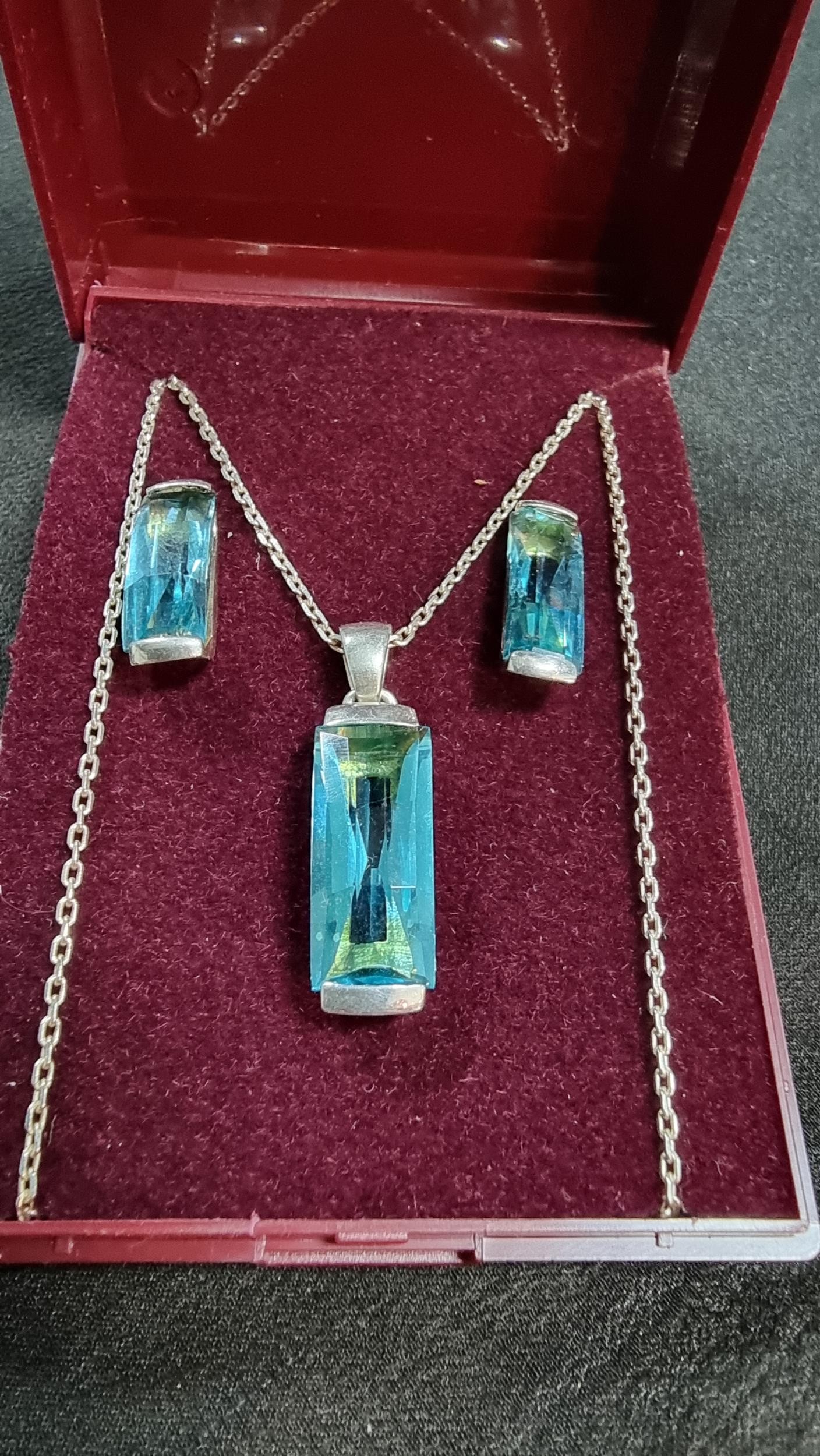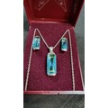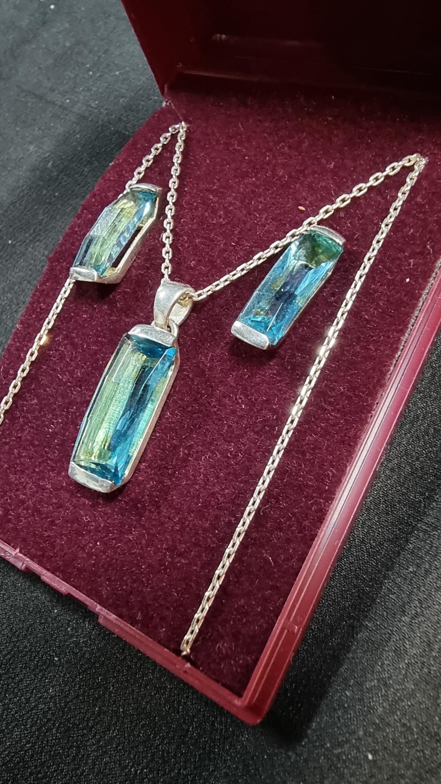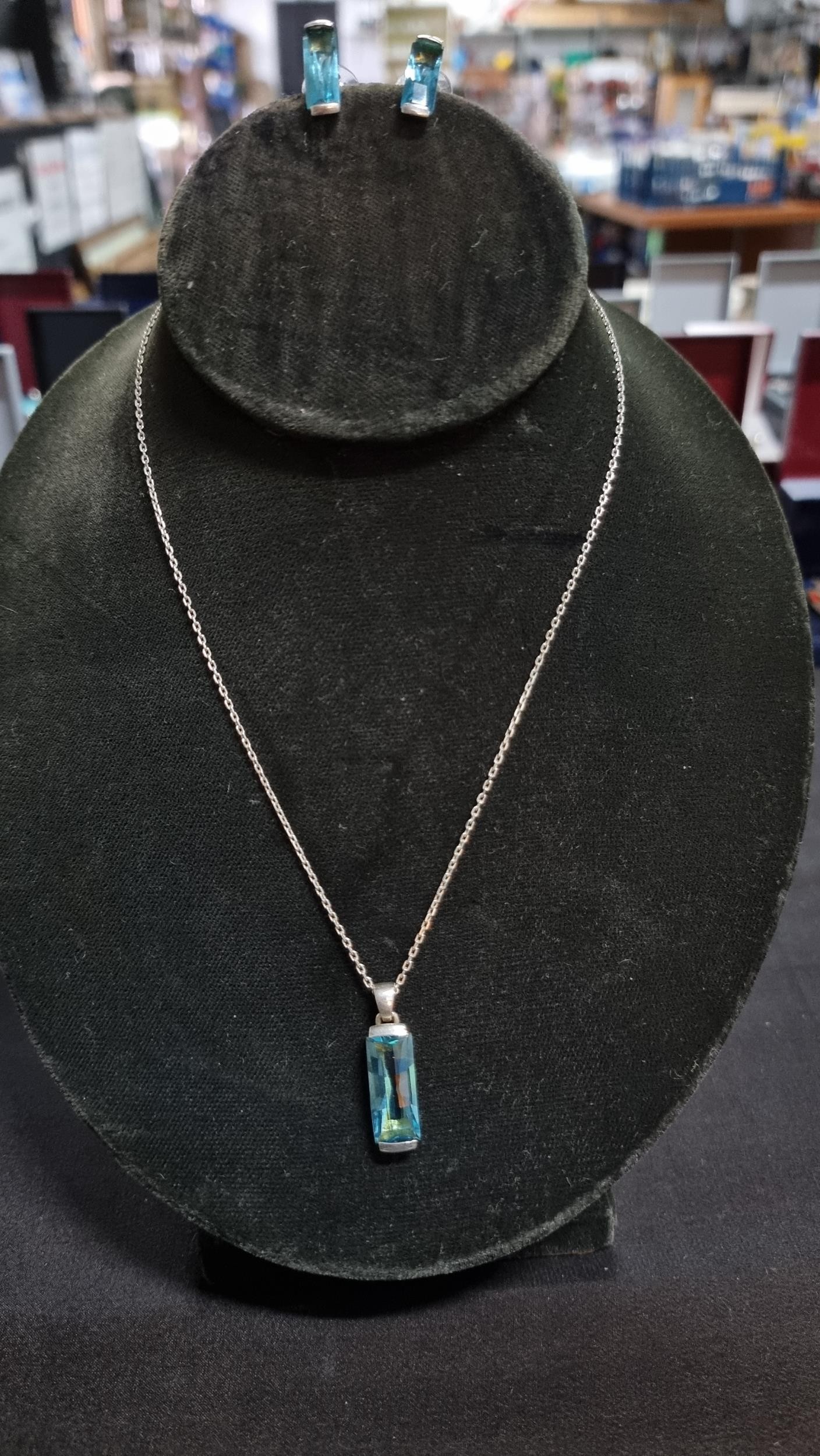 Pretty 925 silver matching jewellery set inset with blue glass cut crystal that reflect the light very well - necklace is set on a 18 inch 925 silver chain