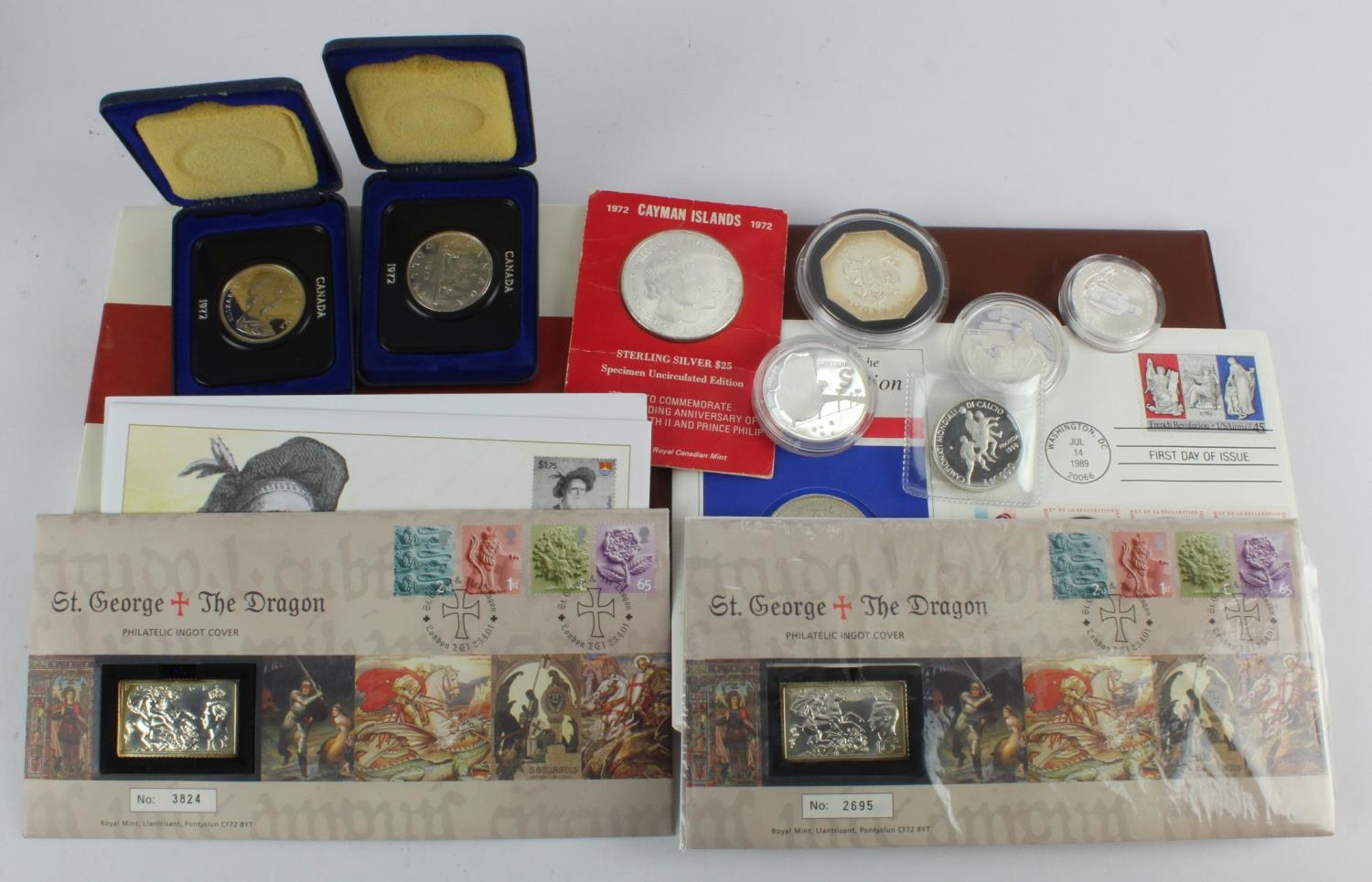 GB & World Commemorative Coins & Medals (14) 11 of which silver, 1970s to 2000, some in packets/capsules, some cased or boxed or in covers.