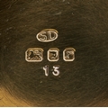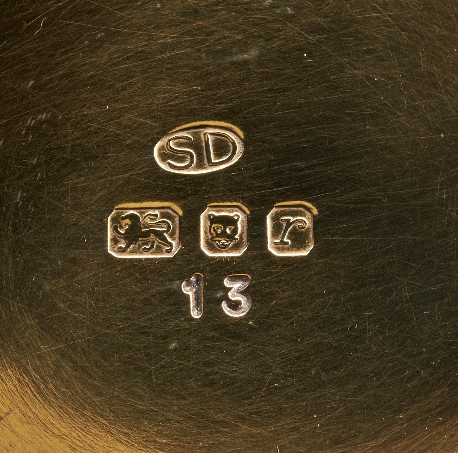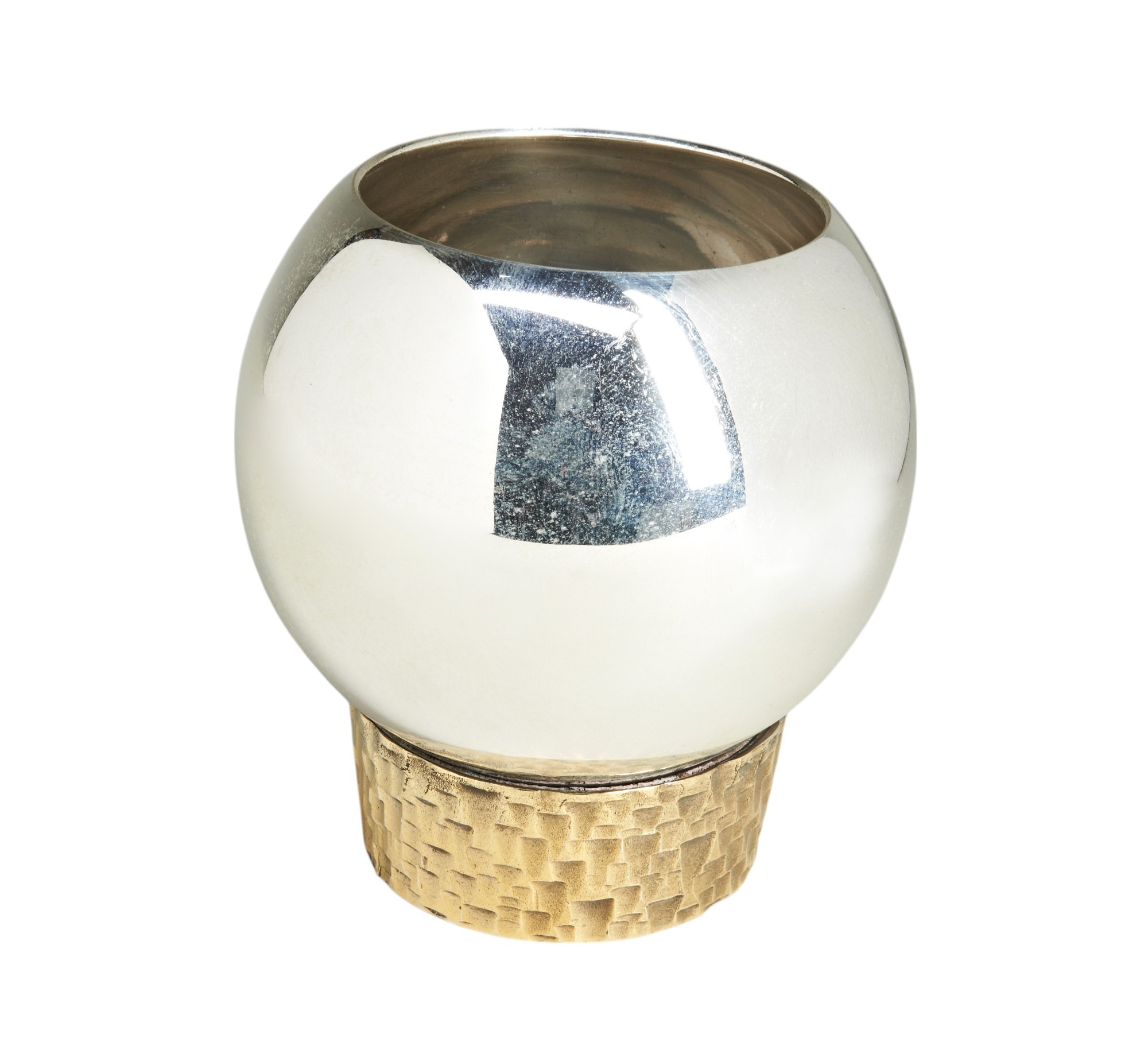 A spherical plain silver bowl mounted onto a gilt base which allows the bowl to rotate through 45 degrees. Made by Stuart Devlin in London in 1972.
