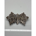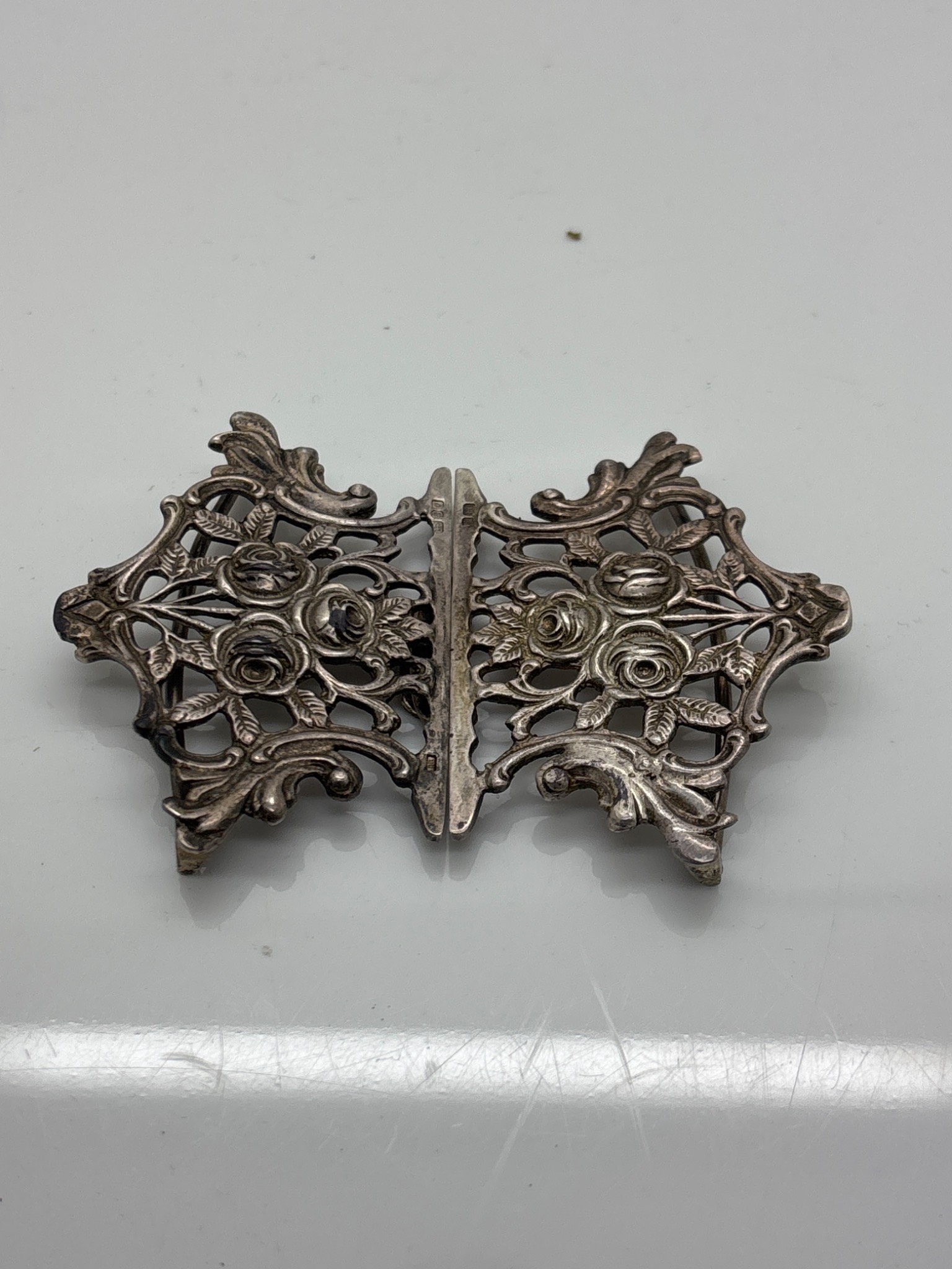 Sterling silver floral buckle with engraved hallmarks.