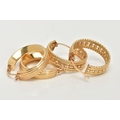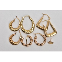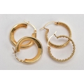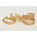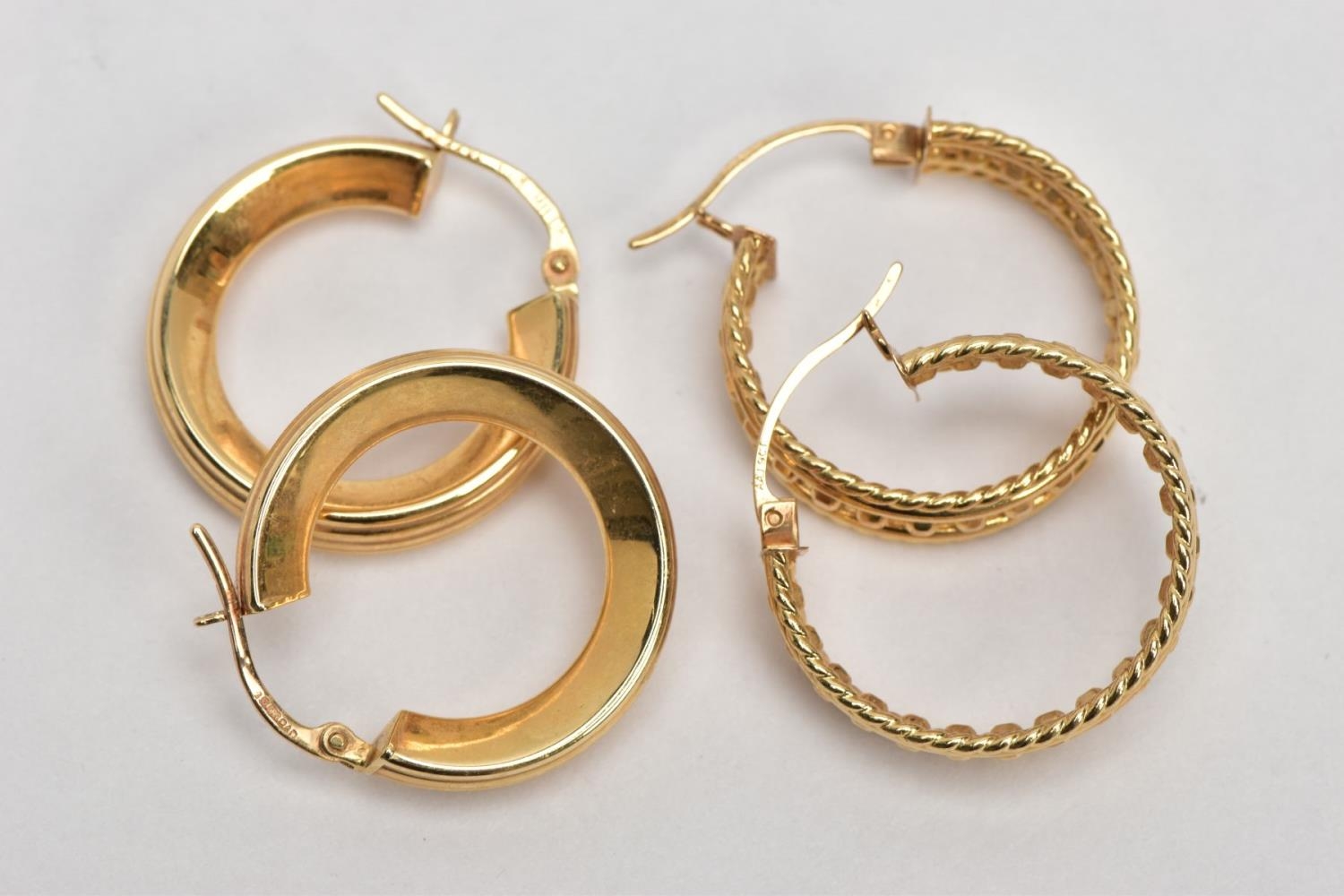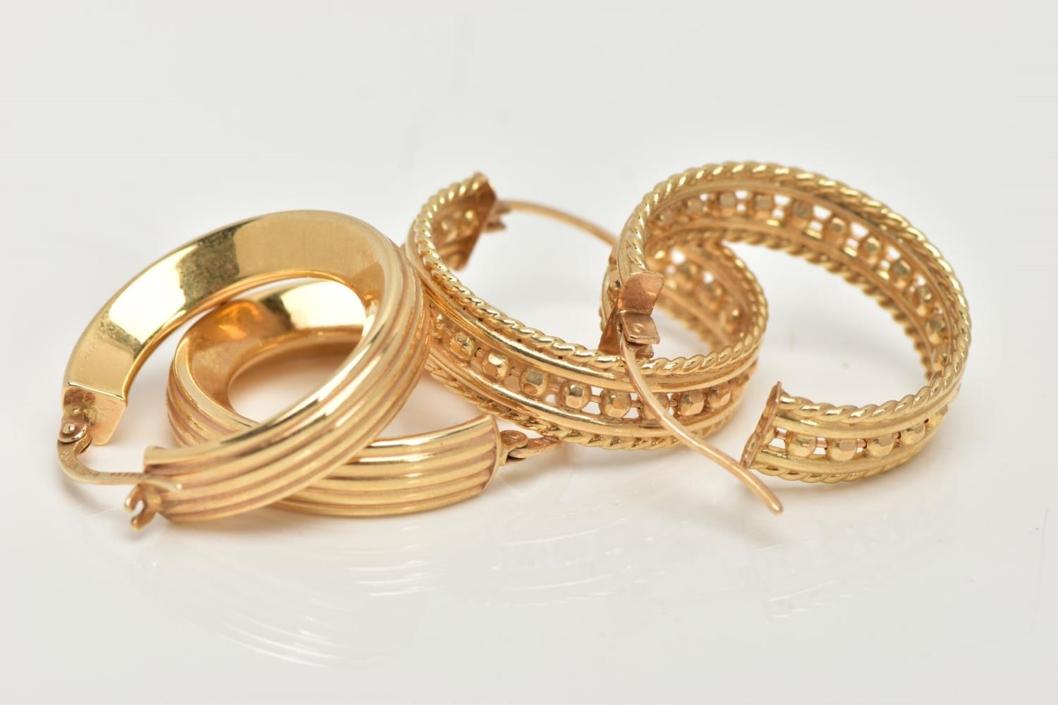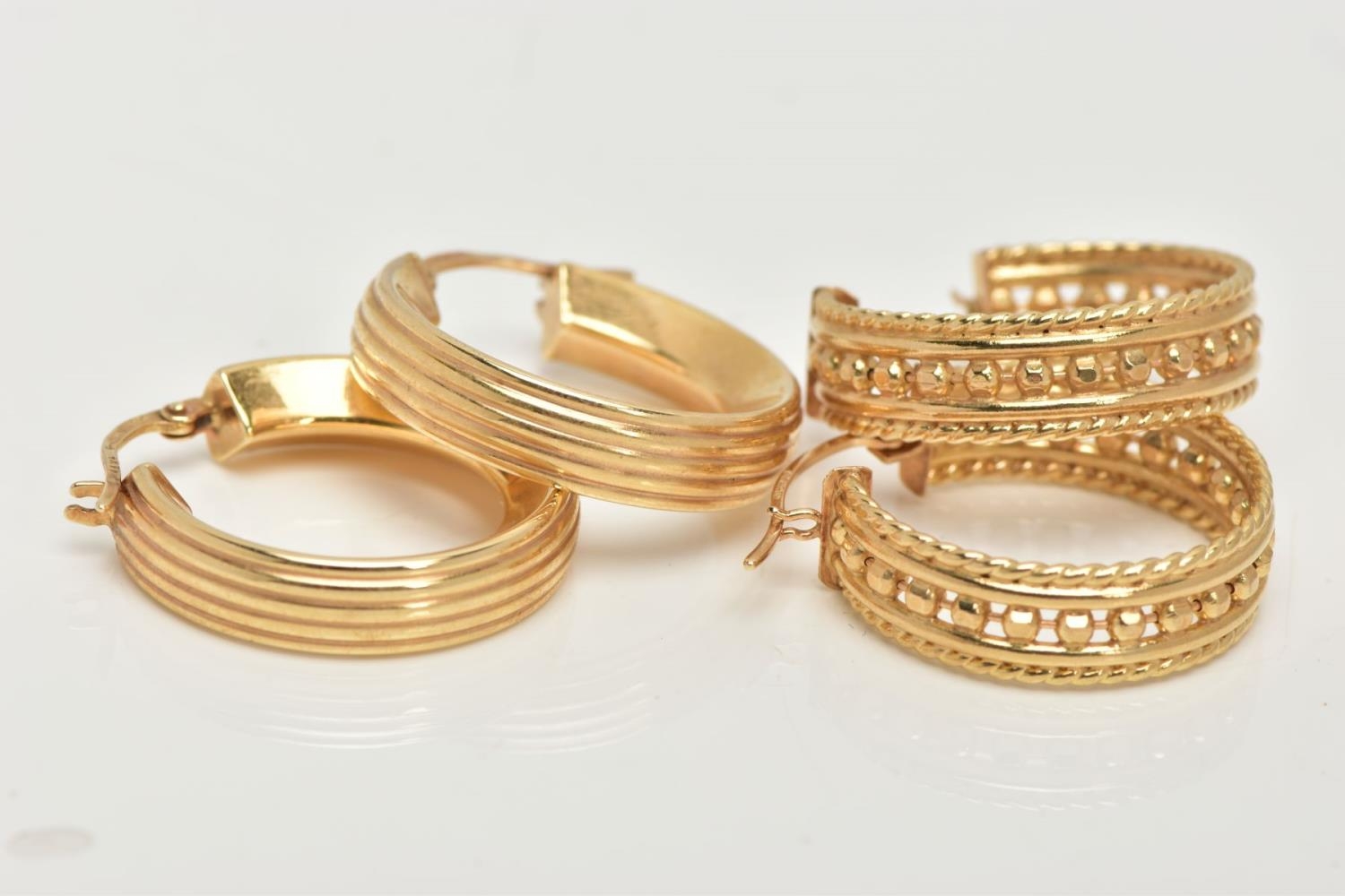 TWO PAIRS OF 9CT GOLD HOOP EARRINGS, the first a pair of open work textured hoops with lever back fittings, hallmarked Birmingham import, gross weight 4.2 grams, the second a pair of textured hollow hoops with lever back fittings, hallmarked 14ct Birmingham, gross weight 2.5 grams