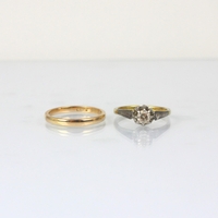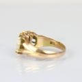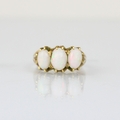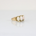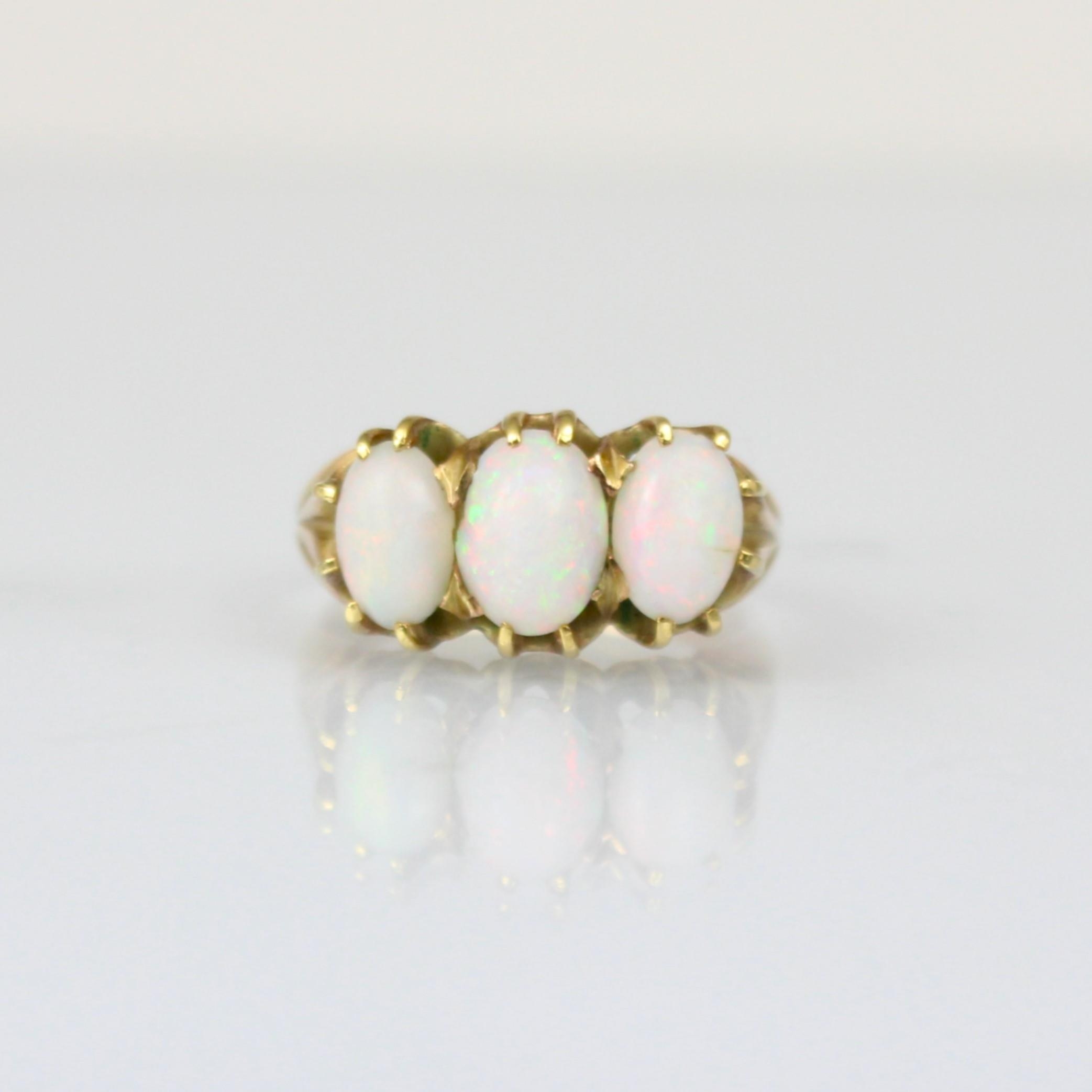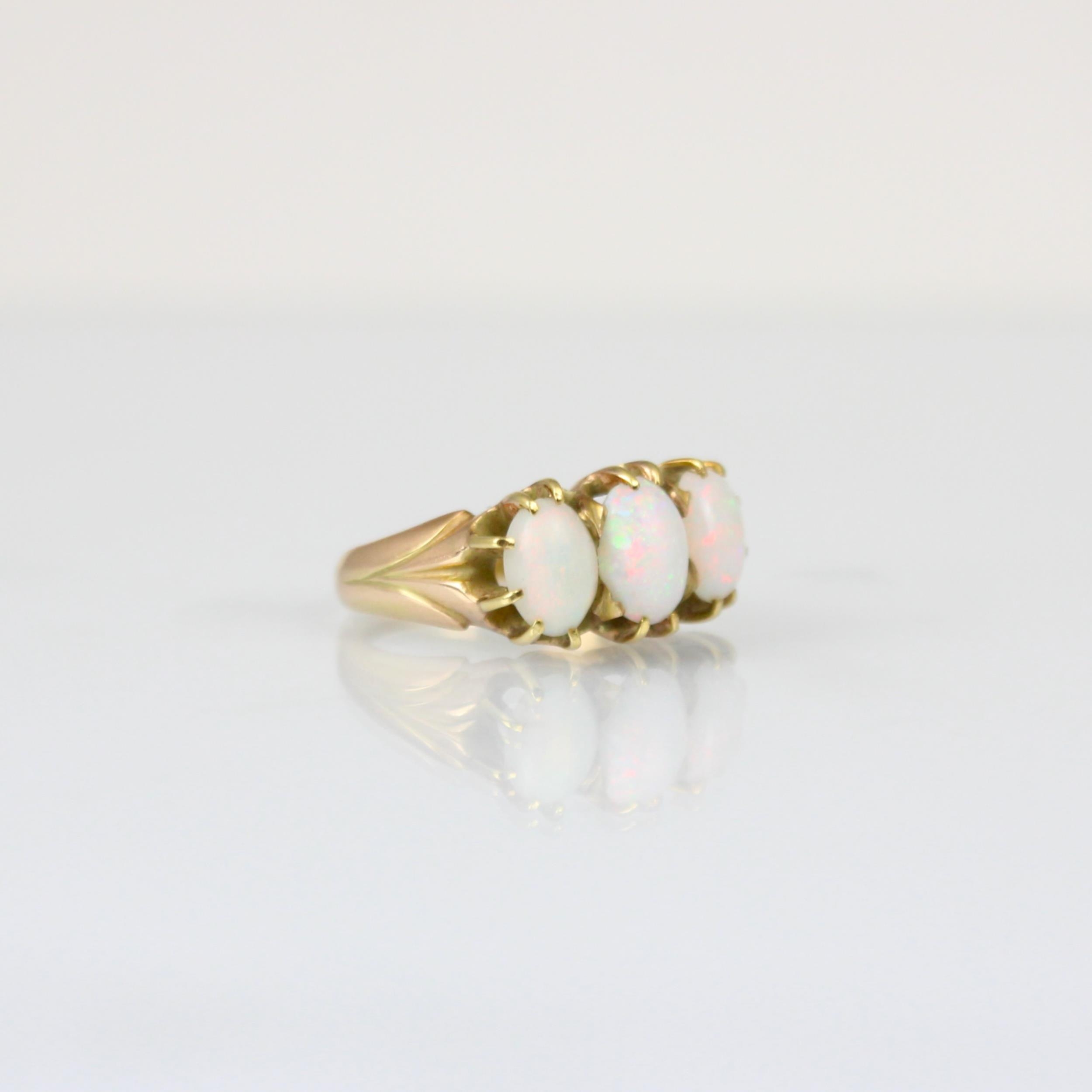 A three stone opal ring, the three graduated oval cabochons within yellow metal claw setting edge leading to plain polished shank, indistinctly stamped, ring size K, 4gms, largest opal 7mm long